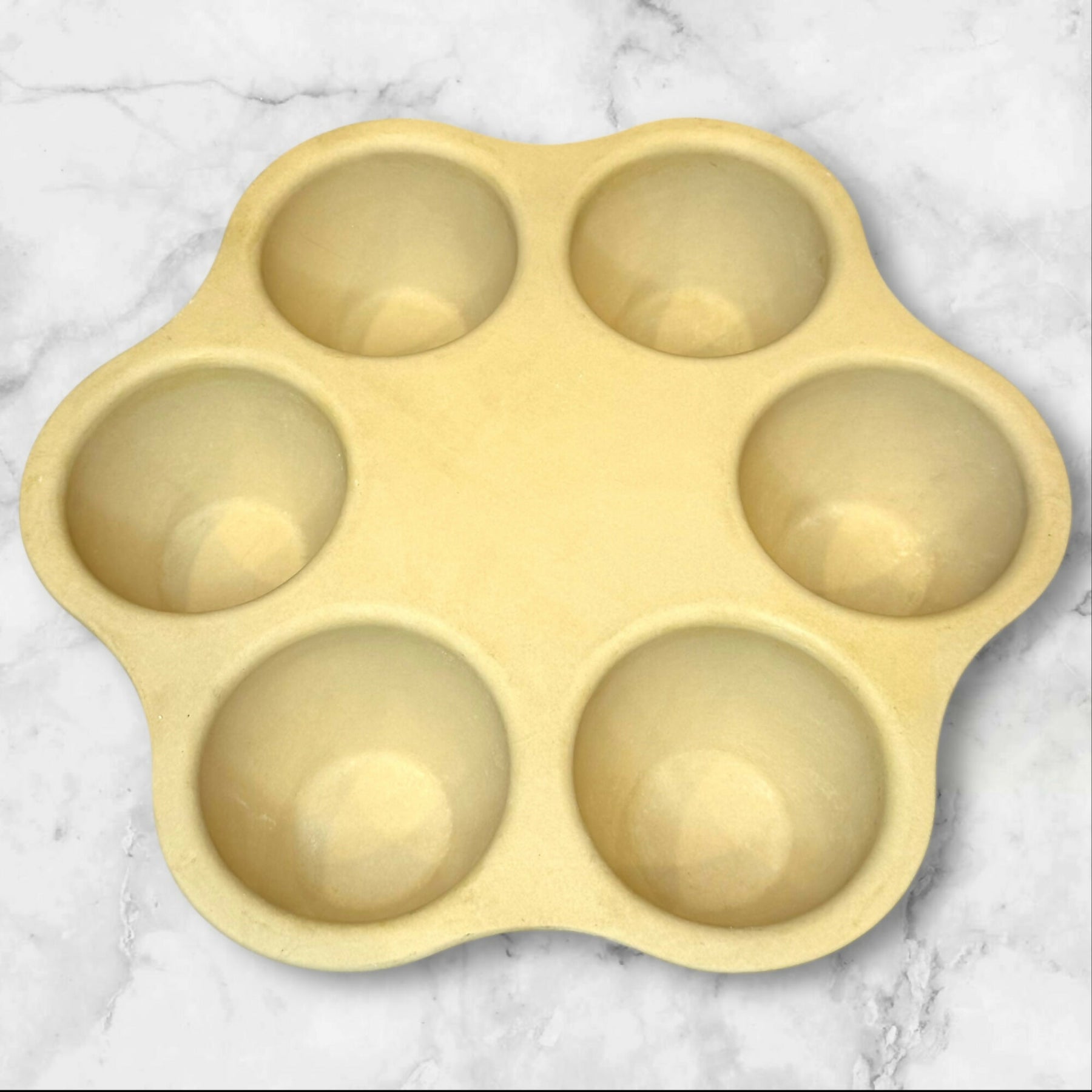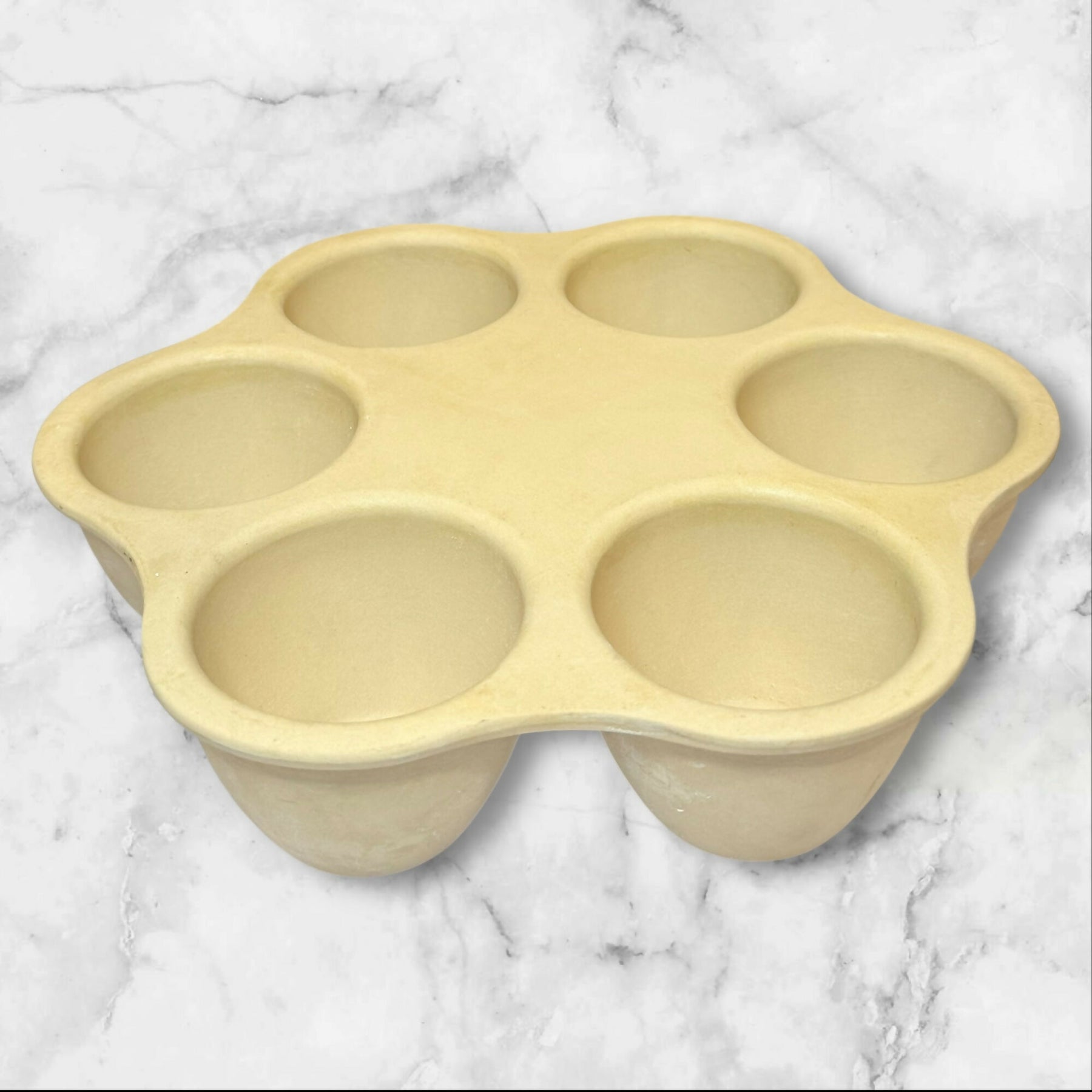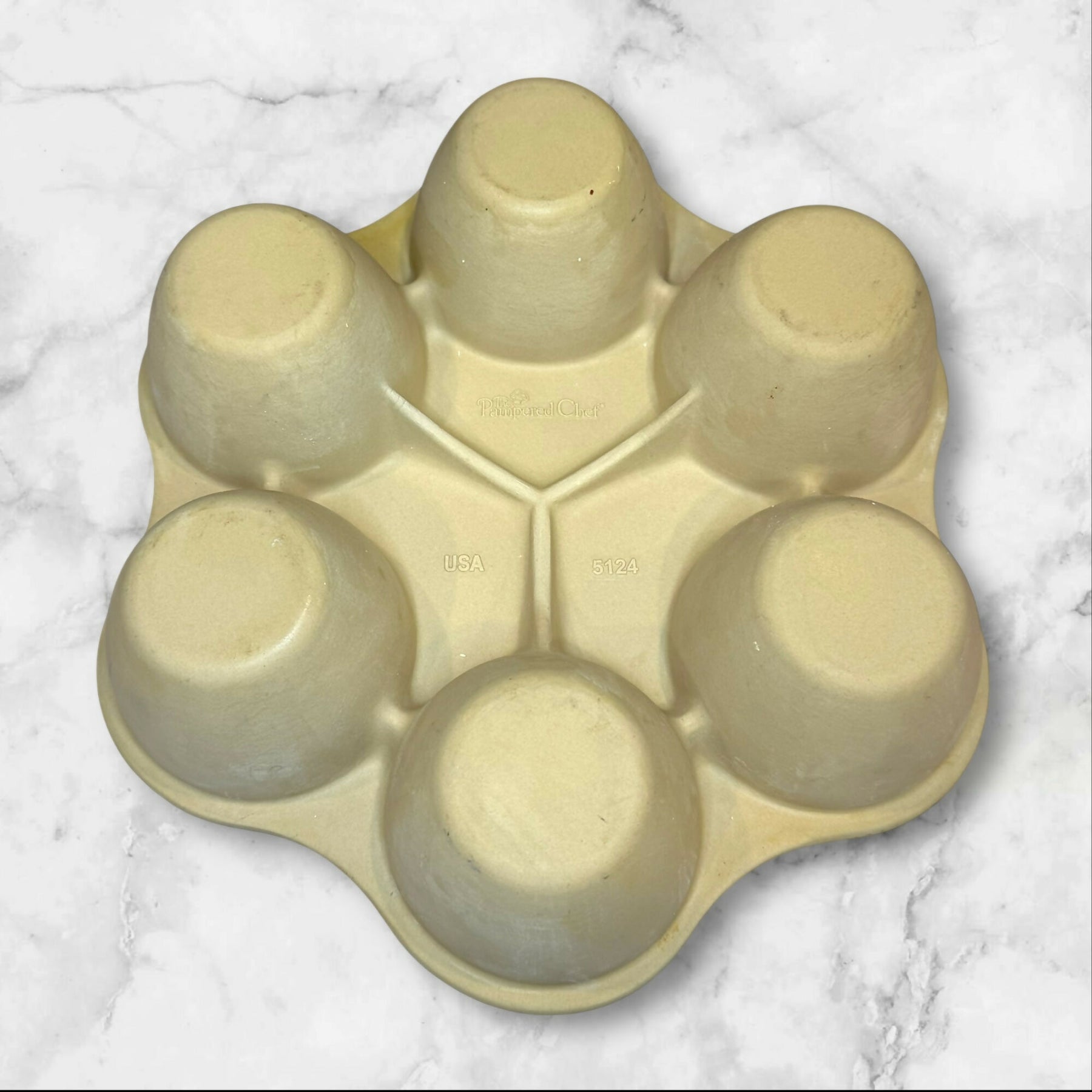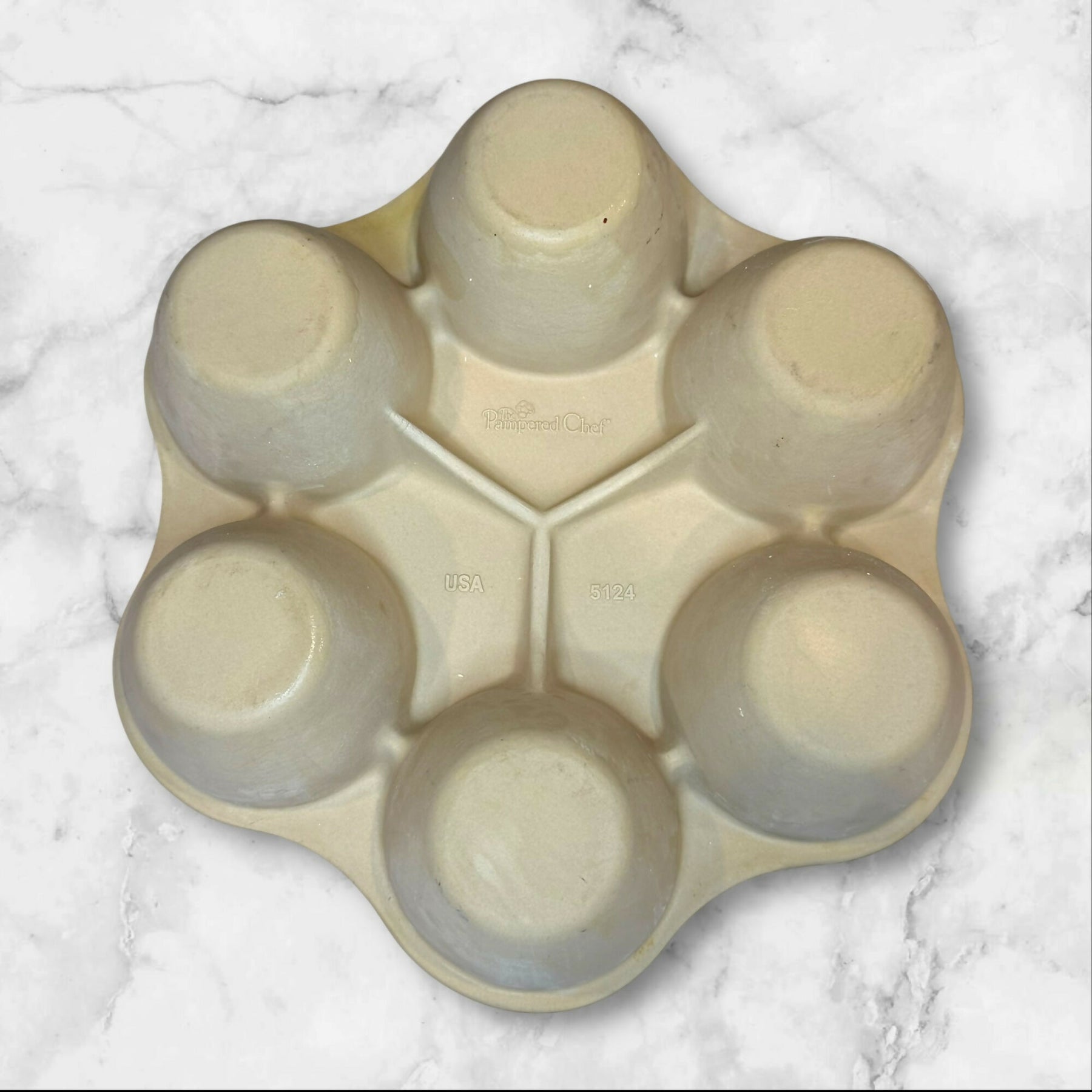 Bake individual cakes, muffins, or savory dishes with this unique Pampered Chef stoneware flower mold pan. Featuring six deep wells and durable natural stoneware construction, it provides even baking and excellent heat retention. A versatile and stylish piece that brings creativity and quality to your baking.