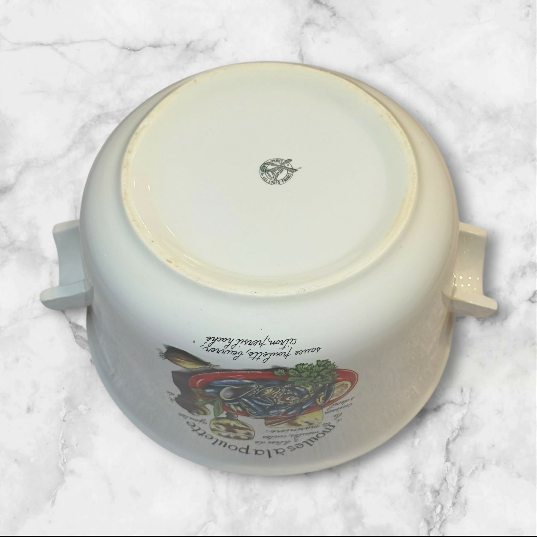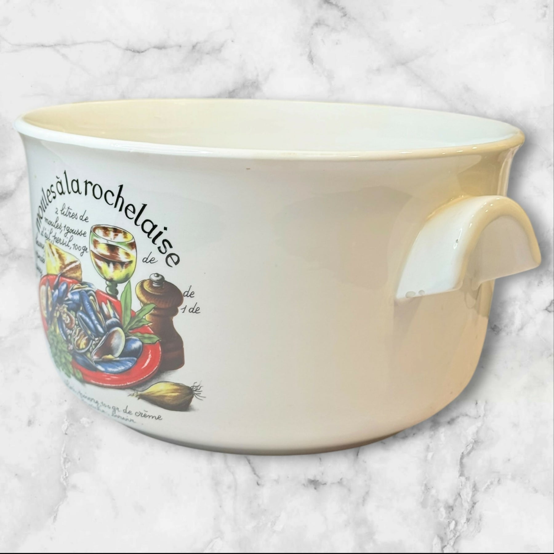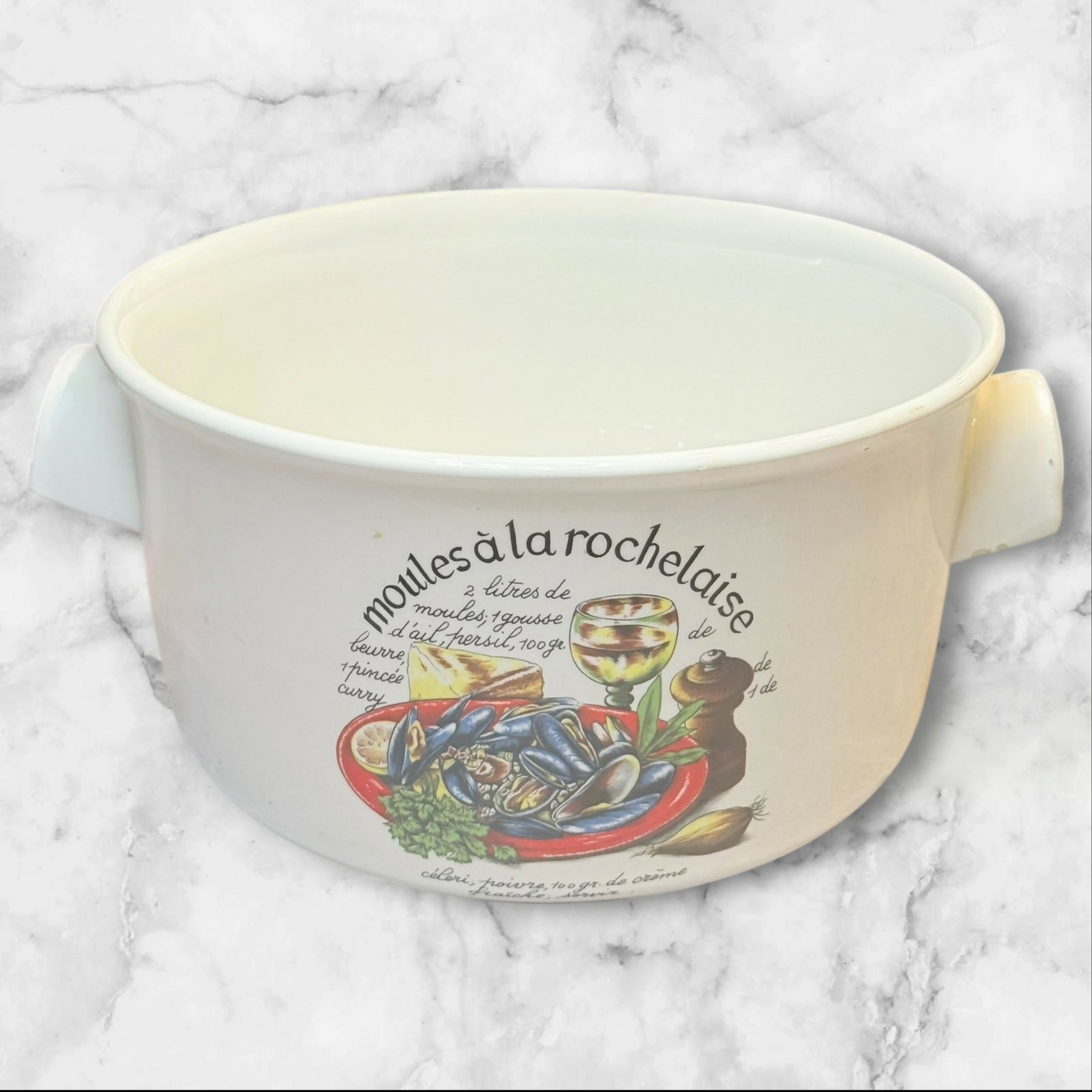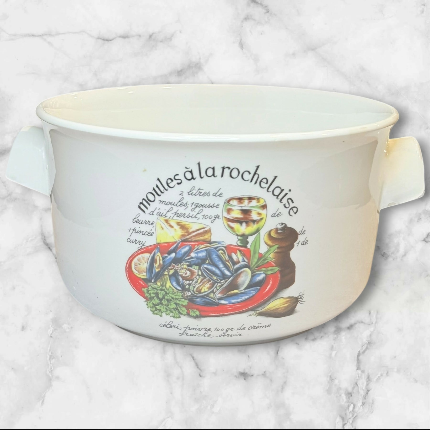 Add timeless French charm to your kitchen with this Apilco France baker featuring the classic “Moules à la Rochelaise” design. Crafted from durable porcelain, this piece is ideal for baking, serving, or display. The elegant white finish with culinary artwork brings a traditional bistro feel to any table. Shows light signs of use with a small chip on one handle but remains fully functional and highly collectible.