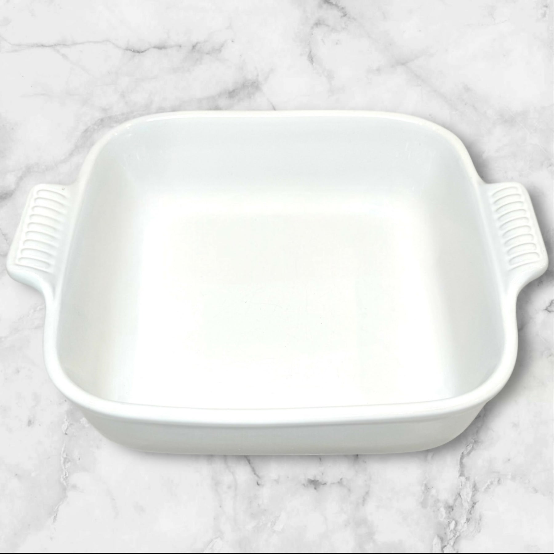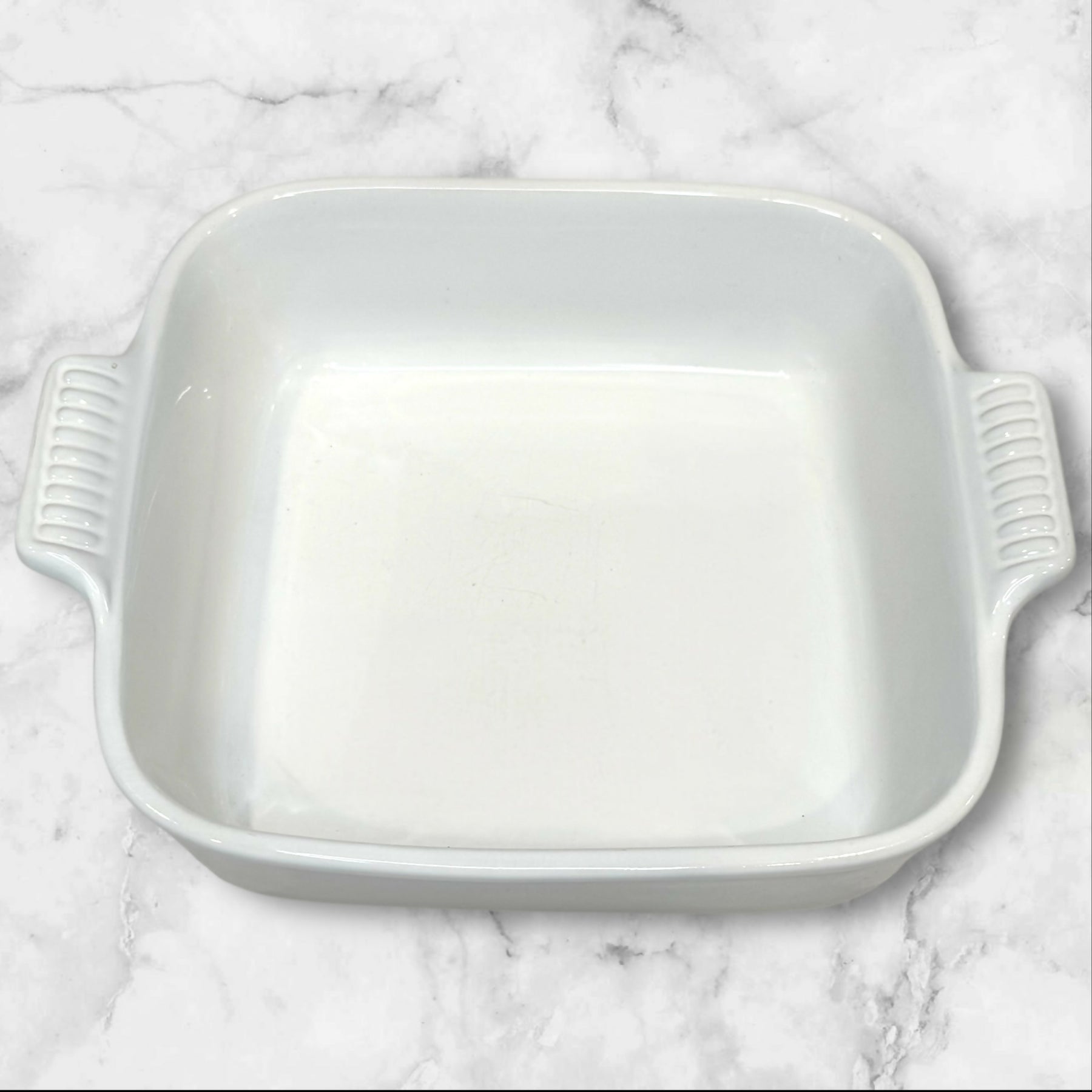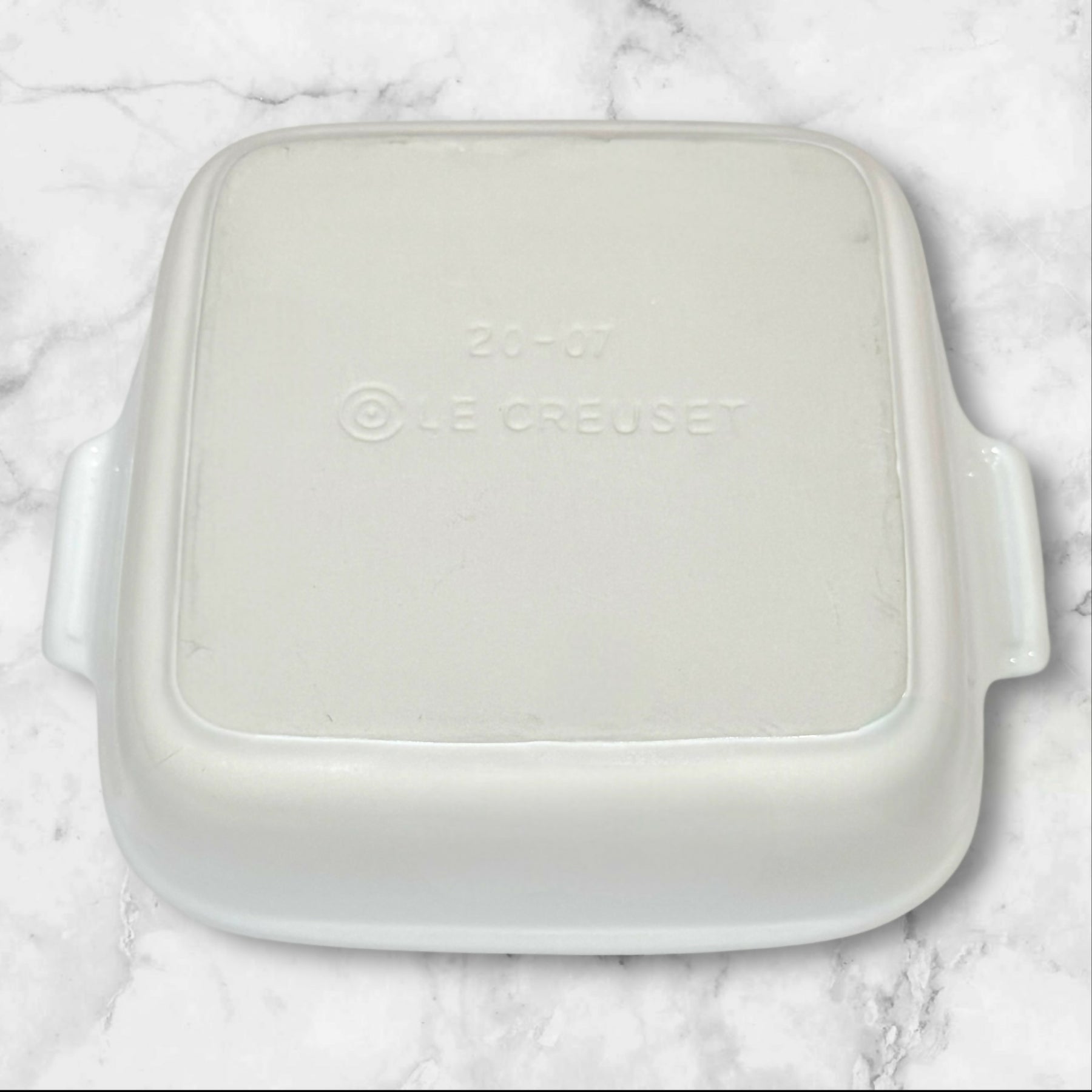 Bake and serve in timeless style with this vintage Le Creuset white square baking dish. Crafted from durable enameled stoneware, it distributes heat evenly for perfect results. Ideal for casseroles, desserts, and side dishes, it features easy-grip handles and classic Le Creuset quality. Measuring 8” interior (10 1/8” with handles) and 2.5” tall, this versatile piece is in great condition and ready for everyday use or display.