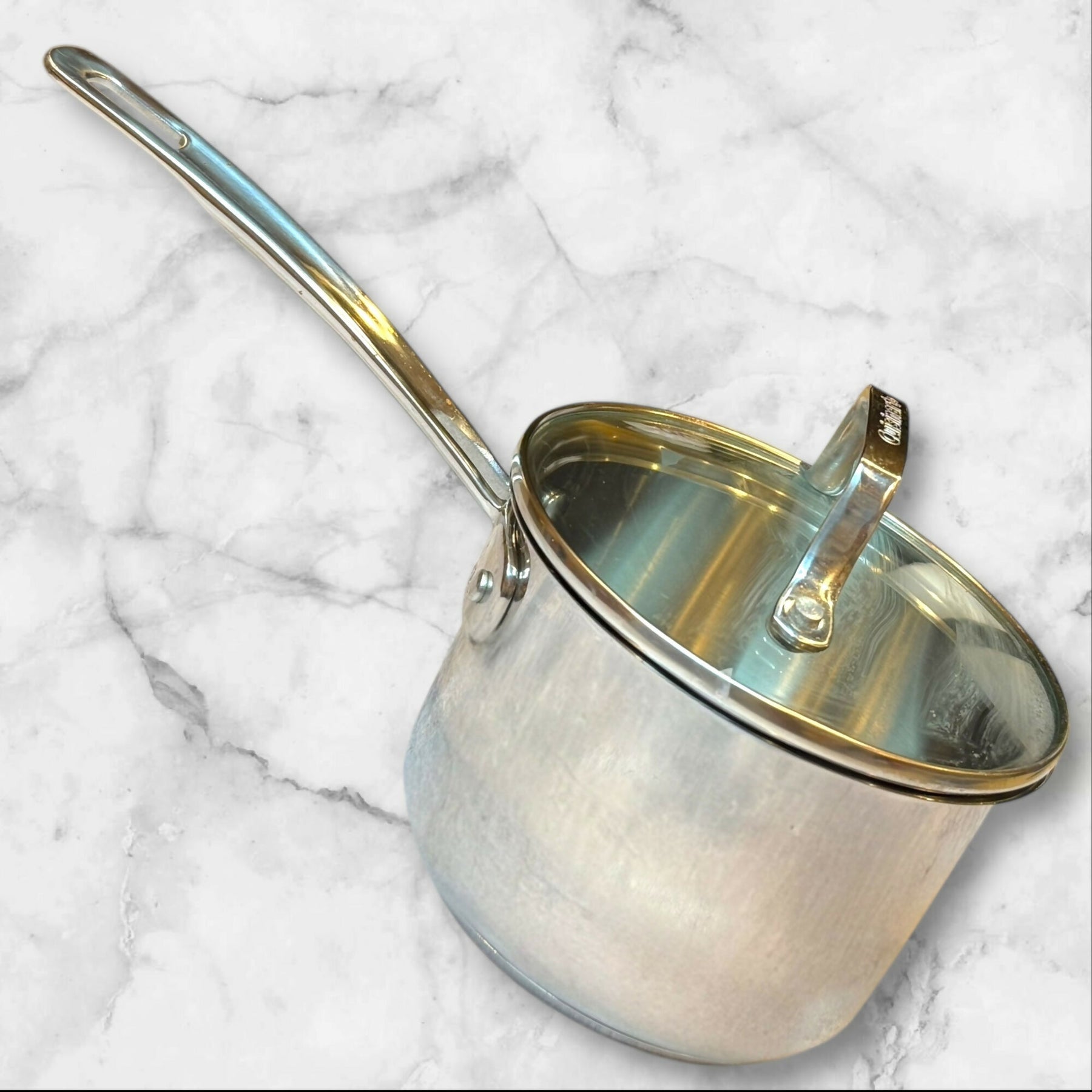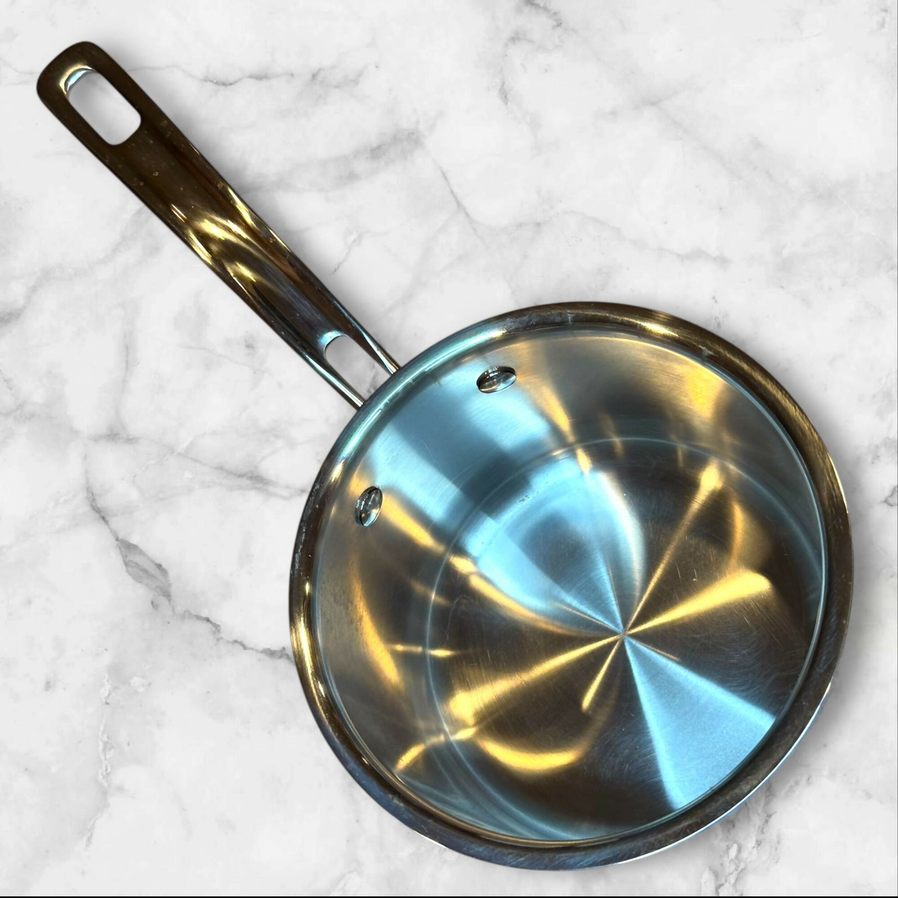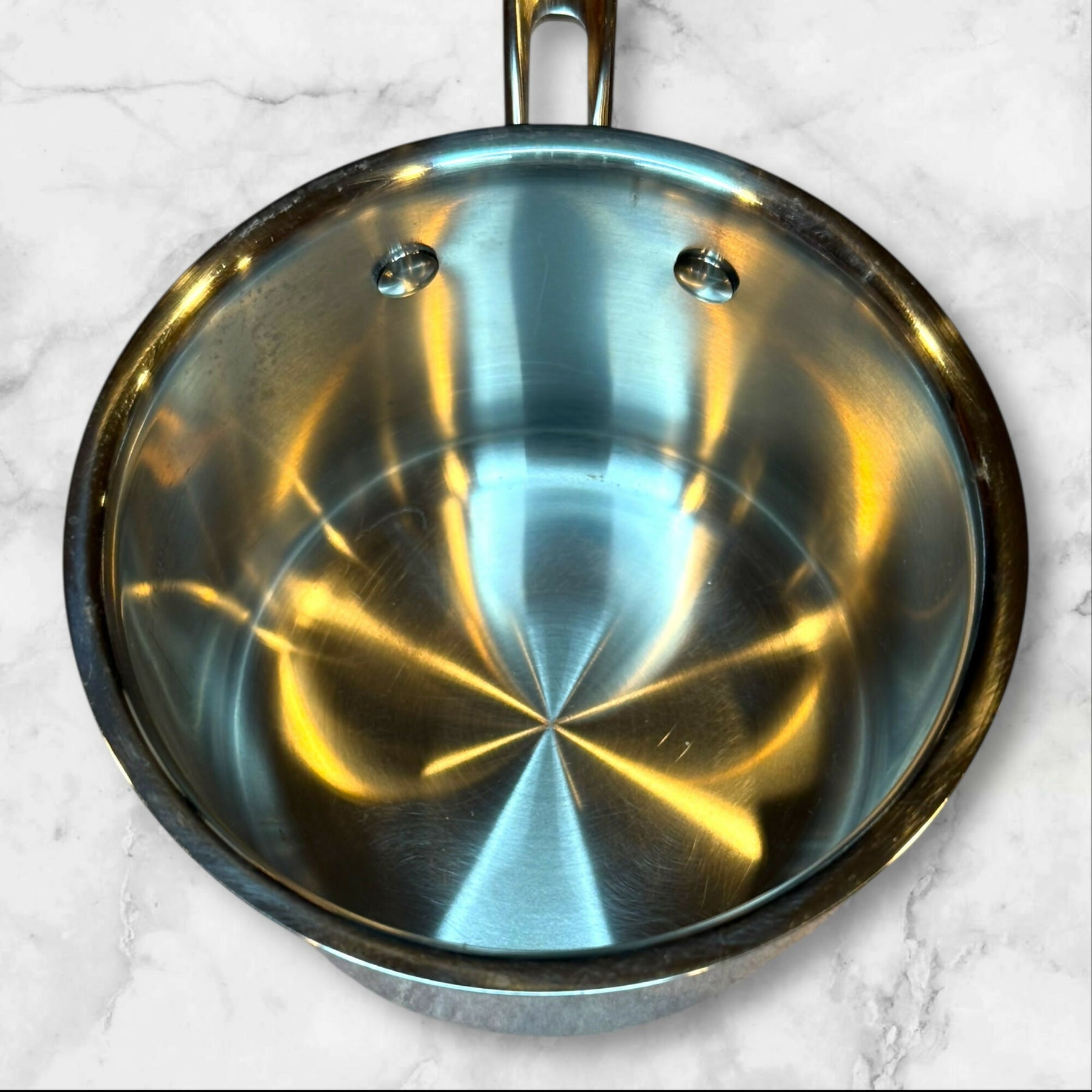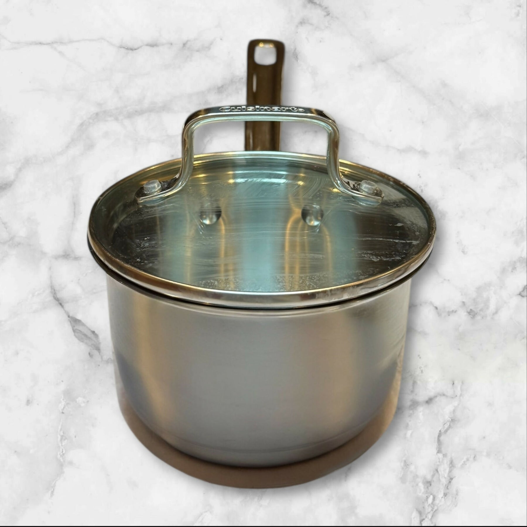 This Cuisinart 1.5-quart stainless steel saucepan delivers classic performance and durability. Ideal for heating sauces, grains, and small portions, it features an induction-ready base for even heat and a snug-fitting lid to seal in flavor. The polished stainless steel finish offers timeless appeal and effortless cleanup. Gently used and well cared for, this versatile pan makes a smart addition to any kitchen.