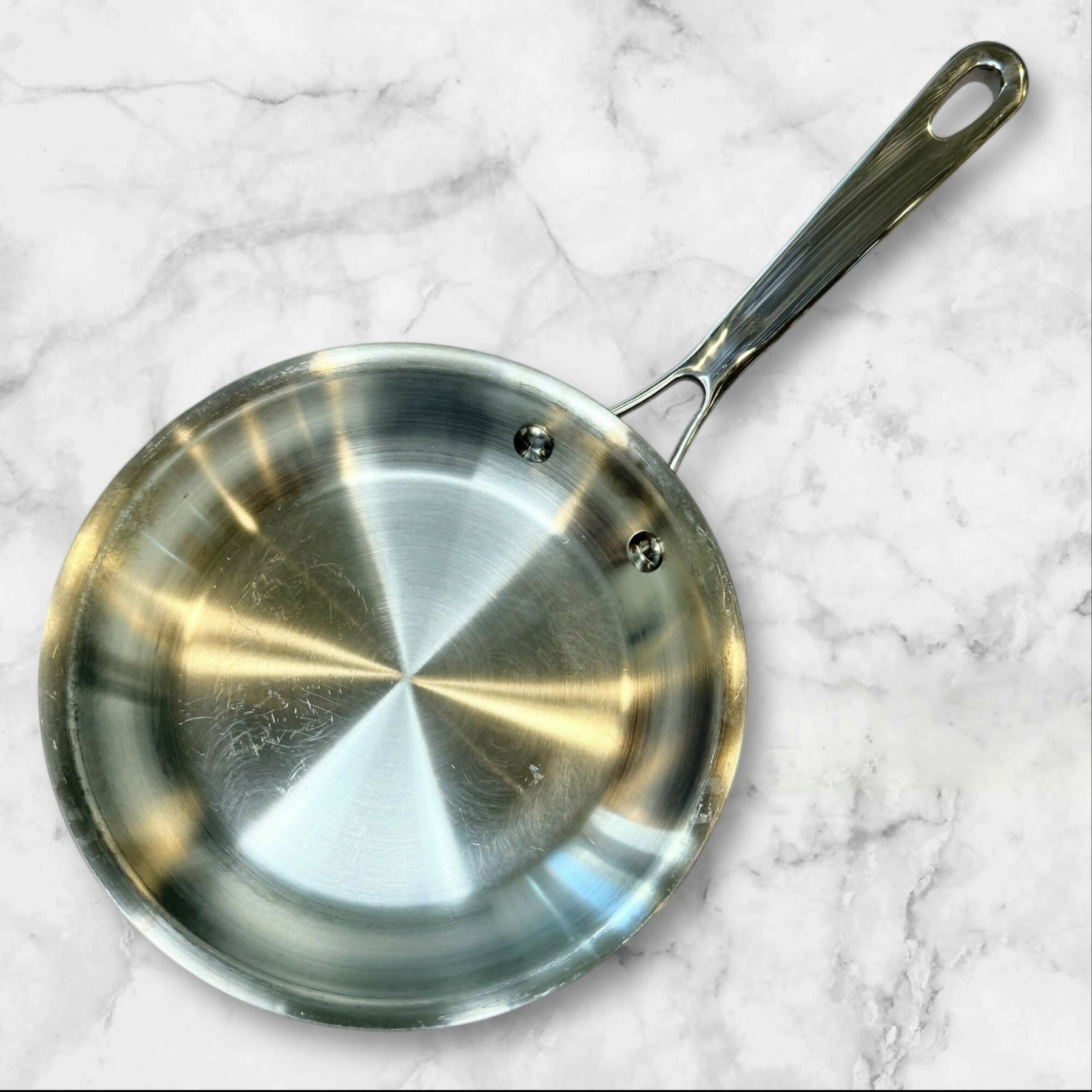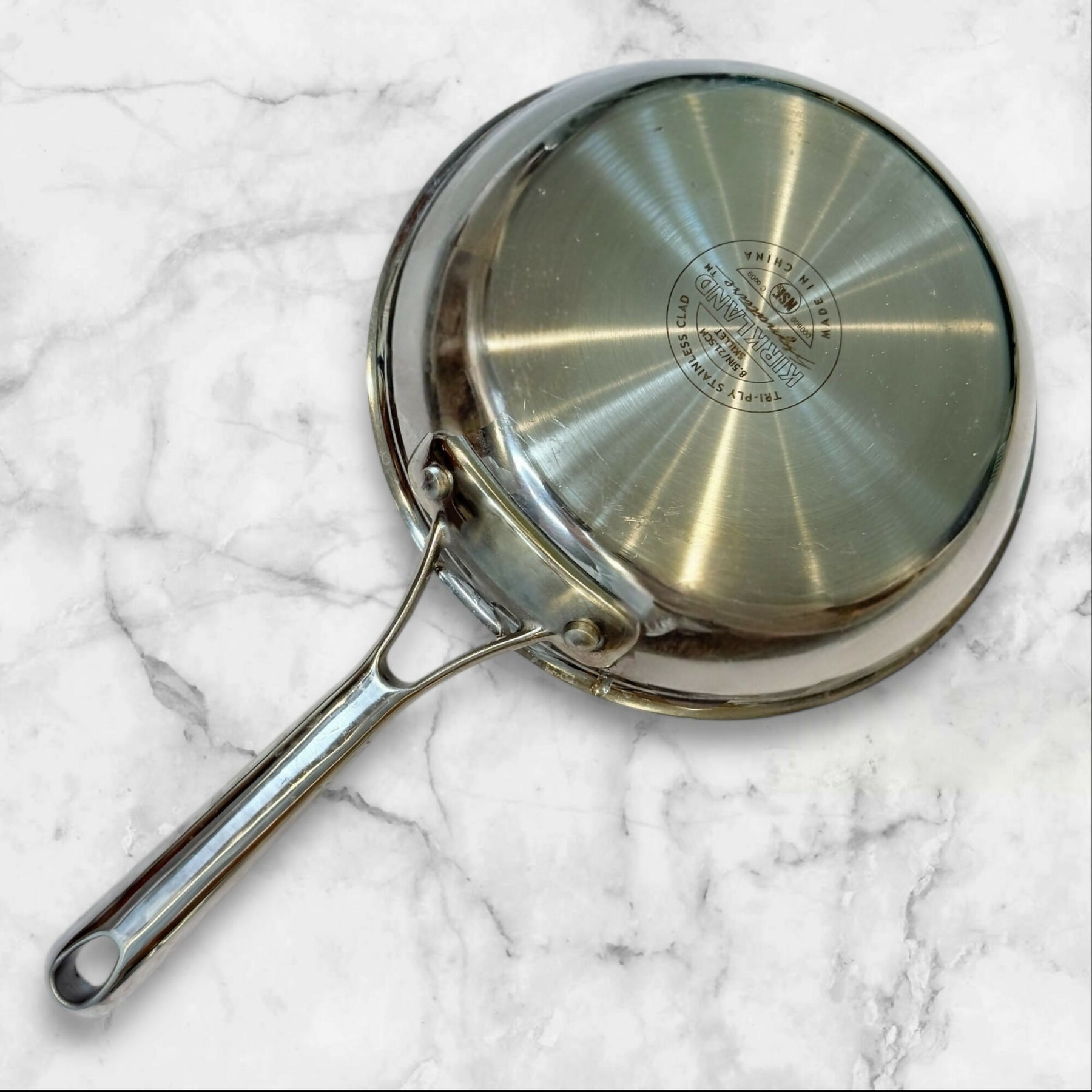 Sear, sauté, and simmer with confidence using this Kirkland Signature tri-ply clad stainless steel skillet. Designed for even heat distribution and precise temperature control, this versatile pan performs beautifully for everyday cooking. The polished stainless interior delivers professional results, while the ergonomic handle offers a comfortable, secure grip. Light cosmetic wear from normal use is present but does not affect performance.