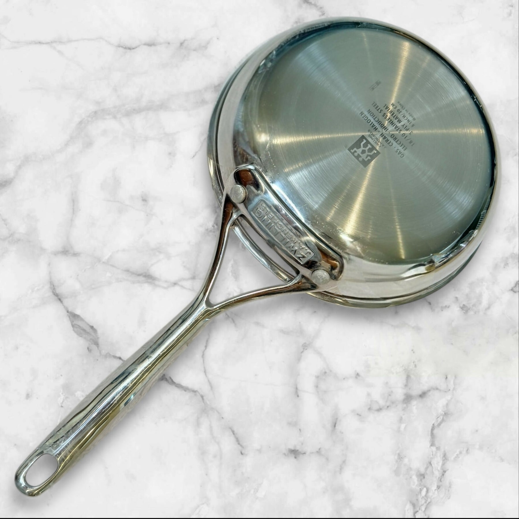 Cook with precision and ease using this Zwilling J.A. Henckels ceramic nonstick skillet. Built with durable tri-ply stainless steel construction and a smooth ceramic cooking surface, this pan delivers even heat distribution and effortless food release. The sleek stainless steel handle offers a secure, comfortable grip with a professional look. Exceptionally clean with minimal signs of prior use.