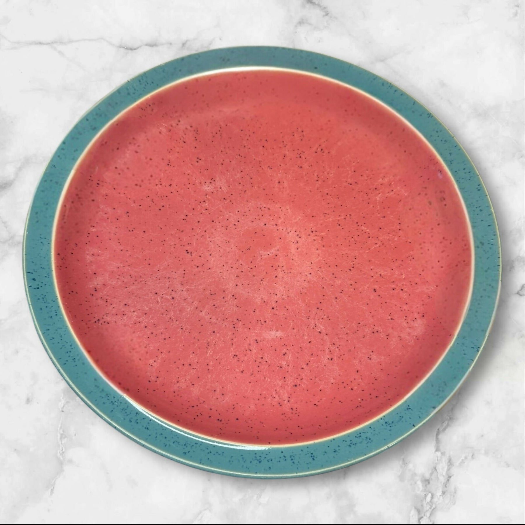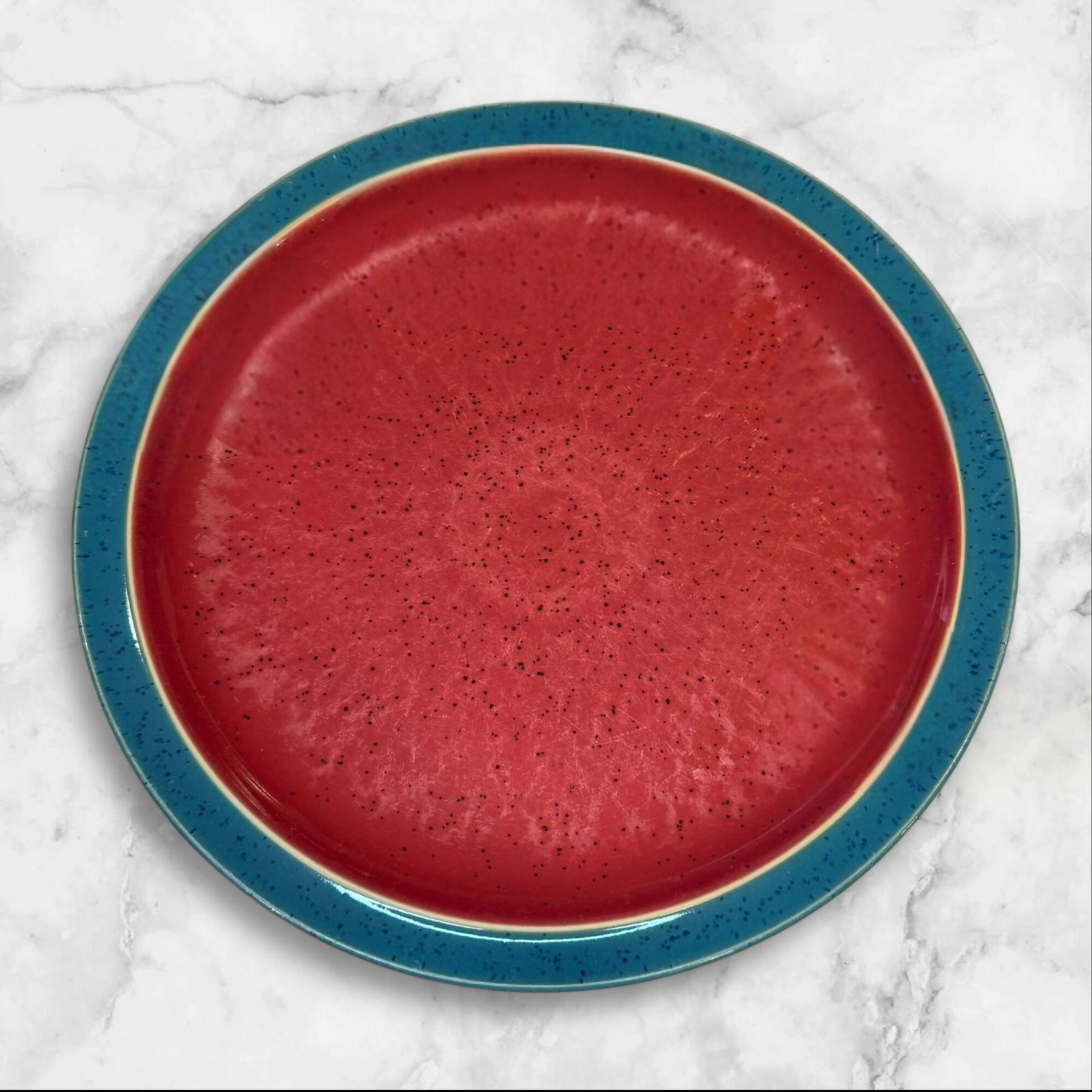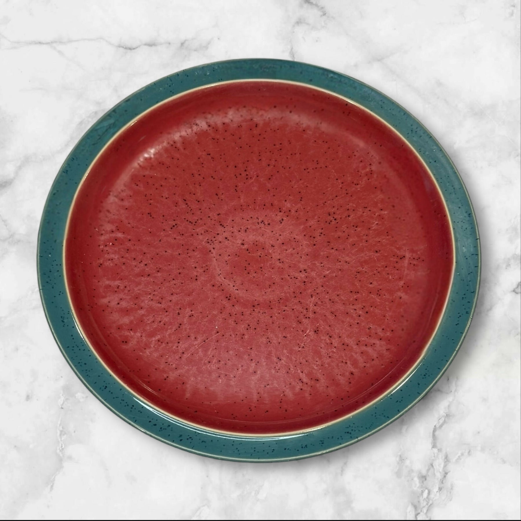 Bring bold color and classic British craftsmanship to your table with this set of Harlequin Red/Green dinner plates by Denby. Crafted in England from durable glazed stoneware, these plates feature a rich red center, contrasting green rim, and signature speckled finish. Designed for everyday dining and entertaining, they are oven, microwave, and dishwasher safe—perfect for replacing discontinued pieces or mixing into an eclectic, curated table setting.