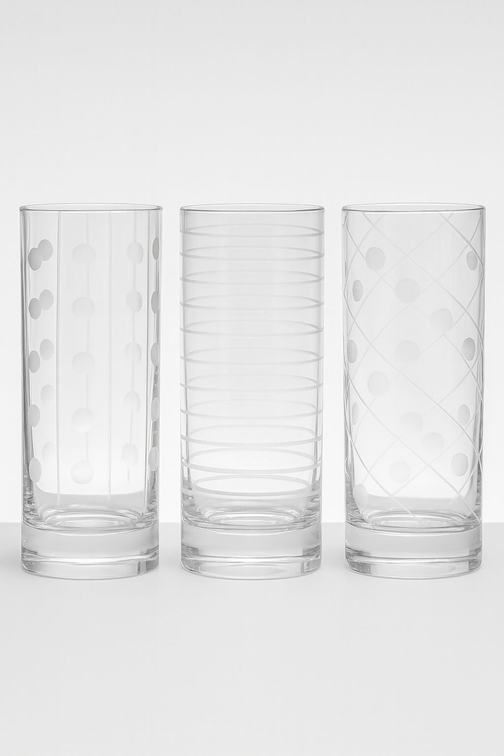 Serve cocktails, sparkling water, or iced tea in elegant style with this set of 6 crystal highball glasses. Featuring three timeless etched designs—dots, lines, and lattice—these glasses combine refined craftsmanship with modern appeal. The crystal’s clarity beautifully enhances any beverage. Each glass is in excellent condition with no chips or cracks, ideal for both entertaining and everyday use.