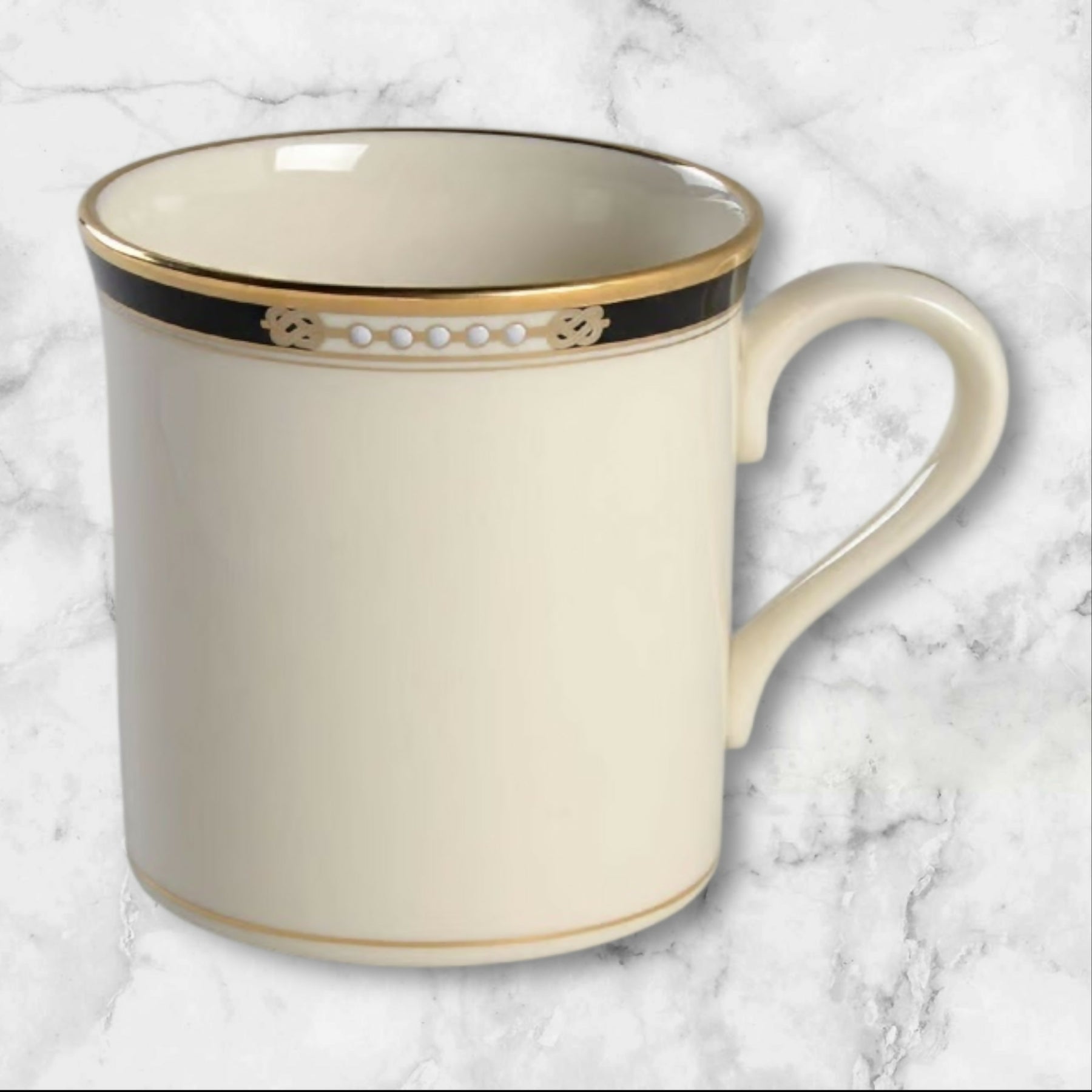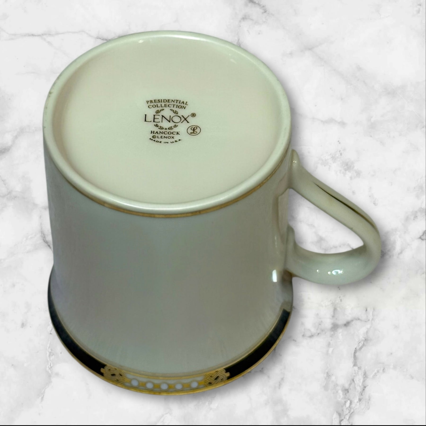 Add timeless sophistication to your table with the Hancock mug by Lenox. Made in the USA from fine ivory china, it showcases a striking black border with gold and enamel accents. Perfect for coffee or tea, this discontinued piece remains a beloved collectible. Gently used and in excellent condition, free of chips or cracks—an elegant addition to any refined tableware collection.