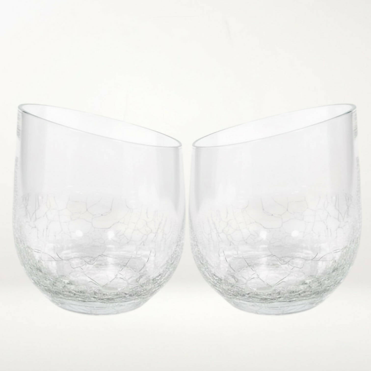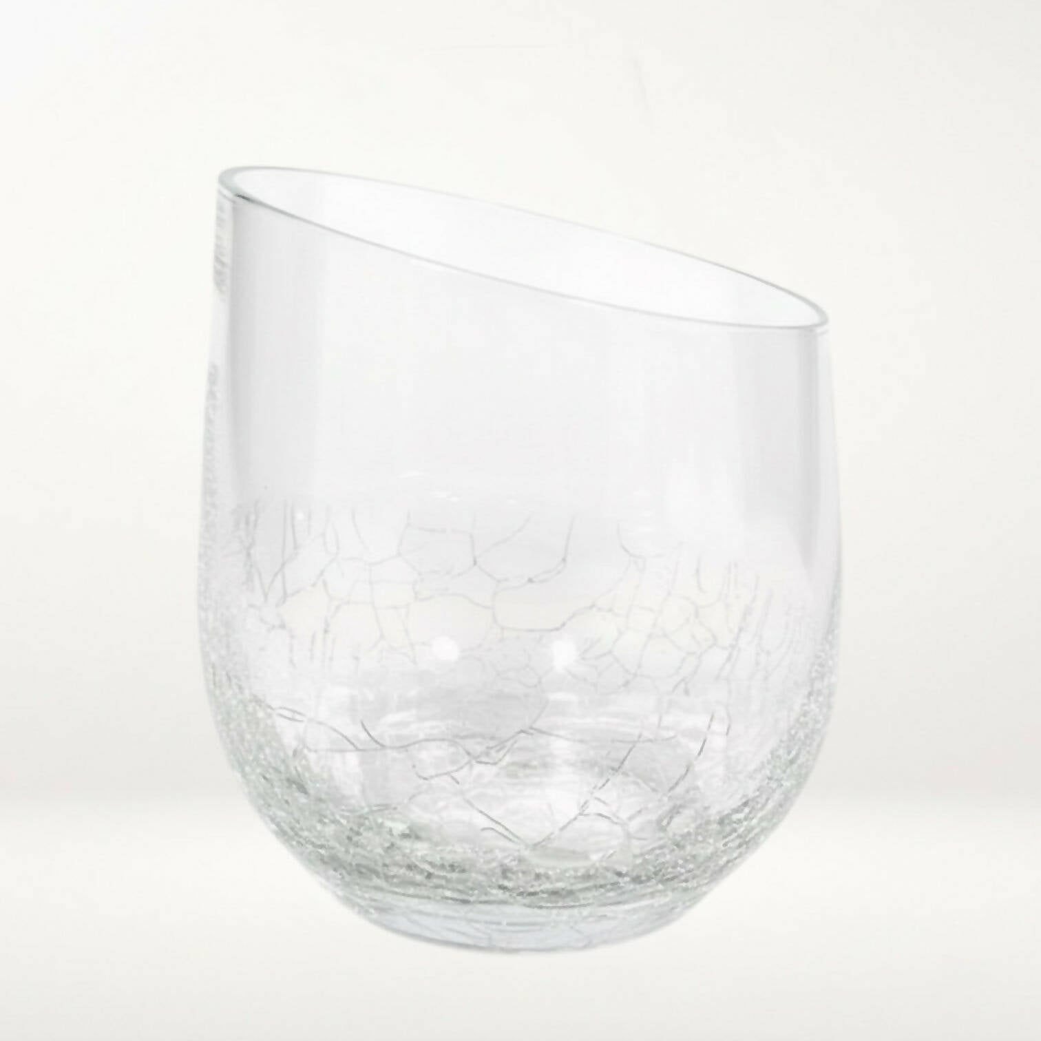This set of 2 Pier 1 Angled Rim Crackle tumblers features a modern slanted rim and a textured crackle base that adds sparkle and visual interest. Crafted from blown glass and now discontinued, these 12 oz tumblers are perfect for cocktails, iced drinks, or everyday serving. Both pieces are in excellent condition with minimal wear—an elegant, eco-friendly addition to any barware collection through Kitchen Switchen Resale.