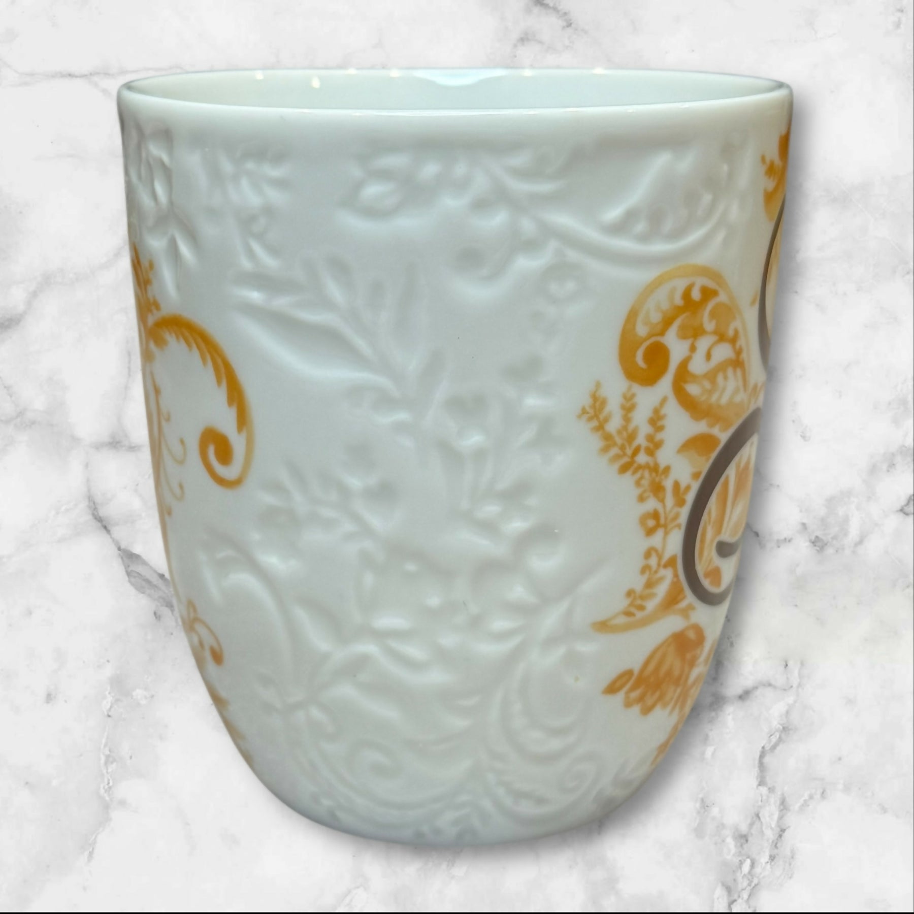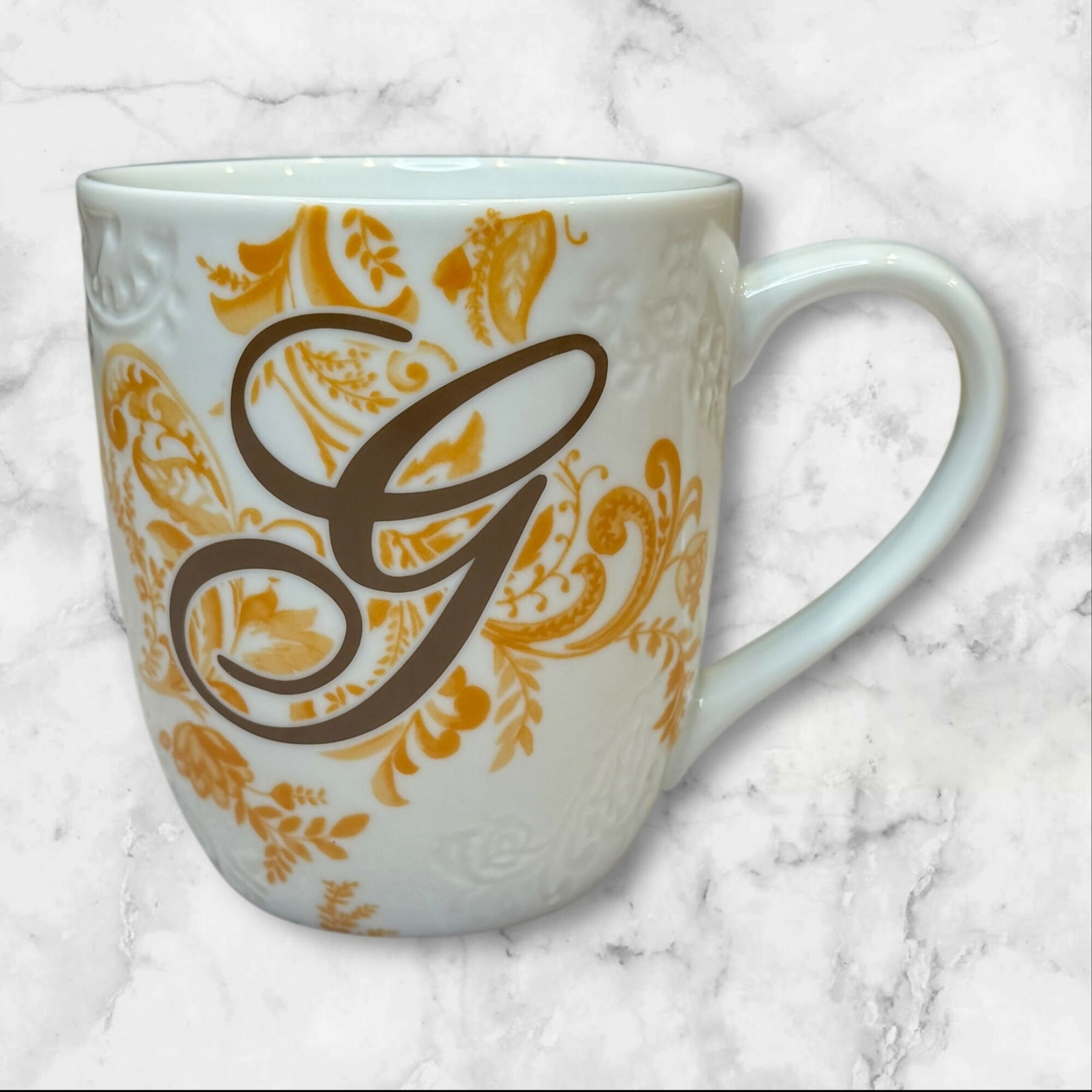 Sip in style with this elegant Pier 1 Imports “Ava” monogram mug, featuring a raised floral pattern and gold scroll design. Crafted from high-quality porcelain, this dishwasher- and microwave-safe mug combines sophistication with everyday functionality. Measures approximately 4 1/8” high by 3.75” wide and holds about 14 oz. In great pre-owned condition with no chips or cracks—perfect for gifting or daily use.