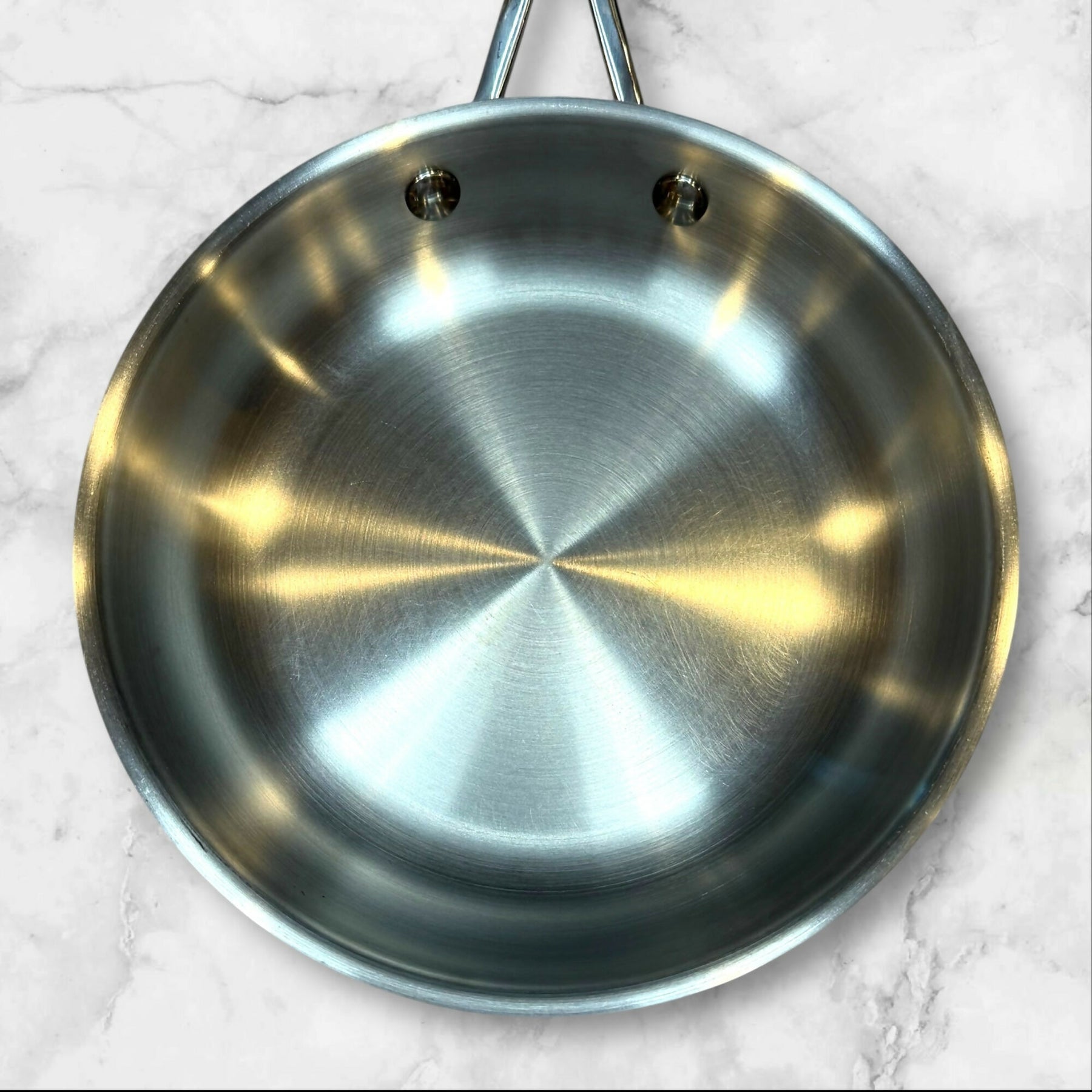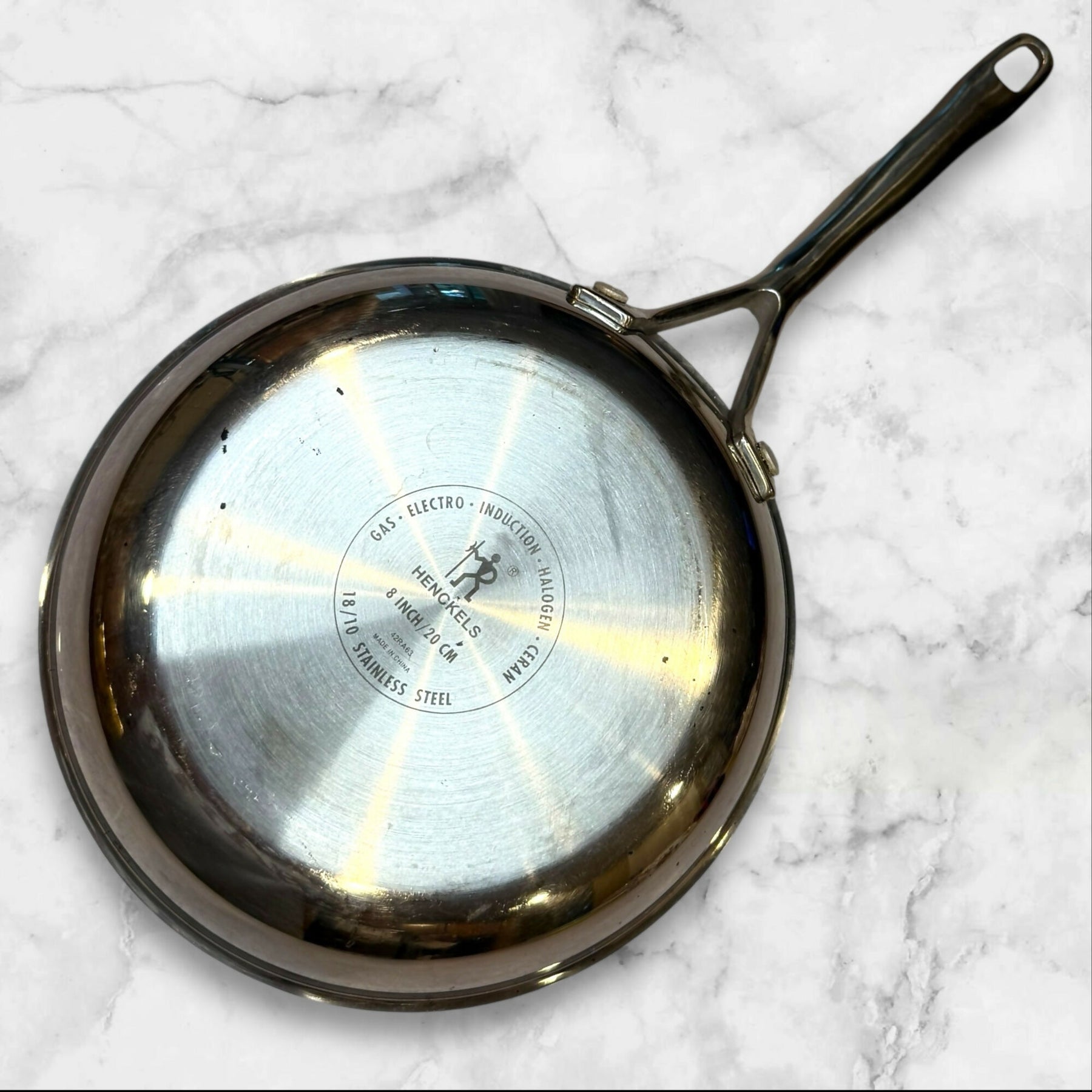 Cook with precision using this Henckels 8-Inch Stainless Steel Fry Pan. Crafted from durable 18/10 stainless steel, it ensures even heat distribution and long-lasting performance. Compatible with all cooktops, including induction, this versatile skillet is perfect for frying, sautéing, and searing smaller portions. In great condition with light use, it’s a reliable piece of professional-grade cookware for everyday meals and an excellent addition to any kitchen.