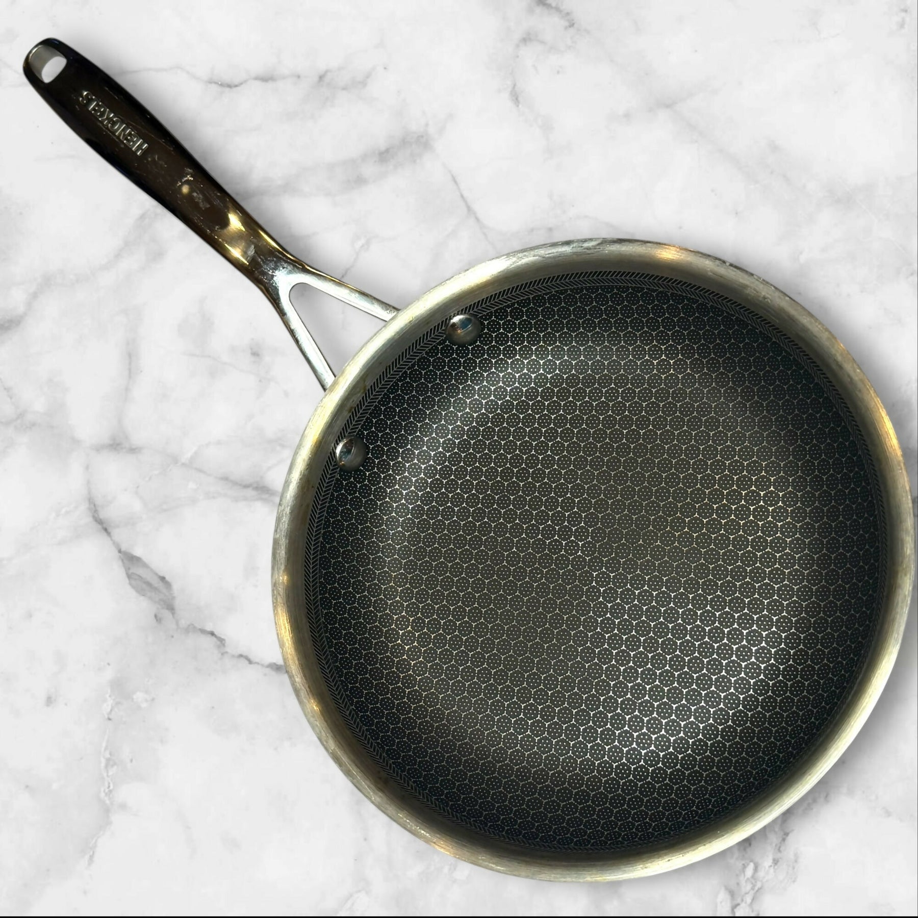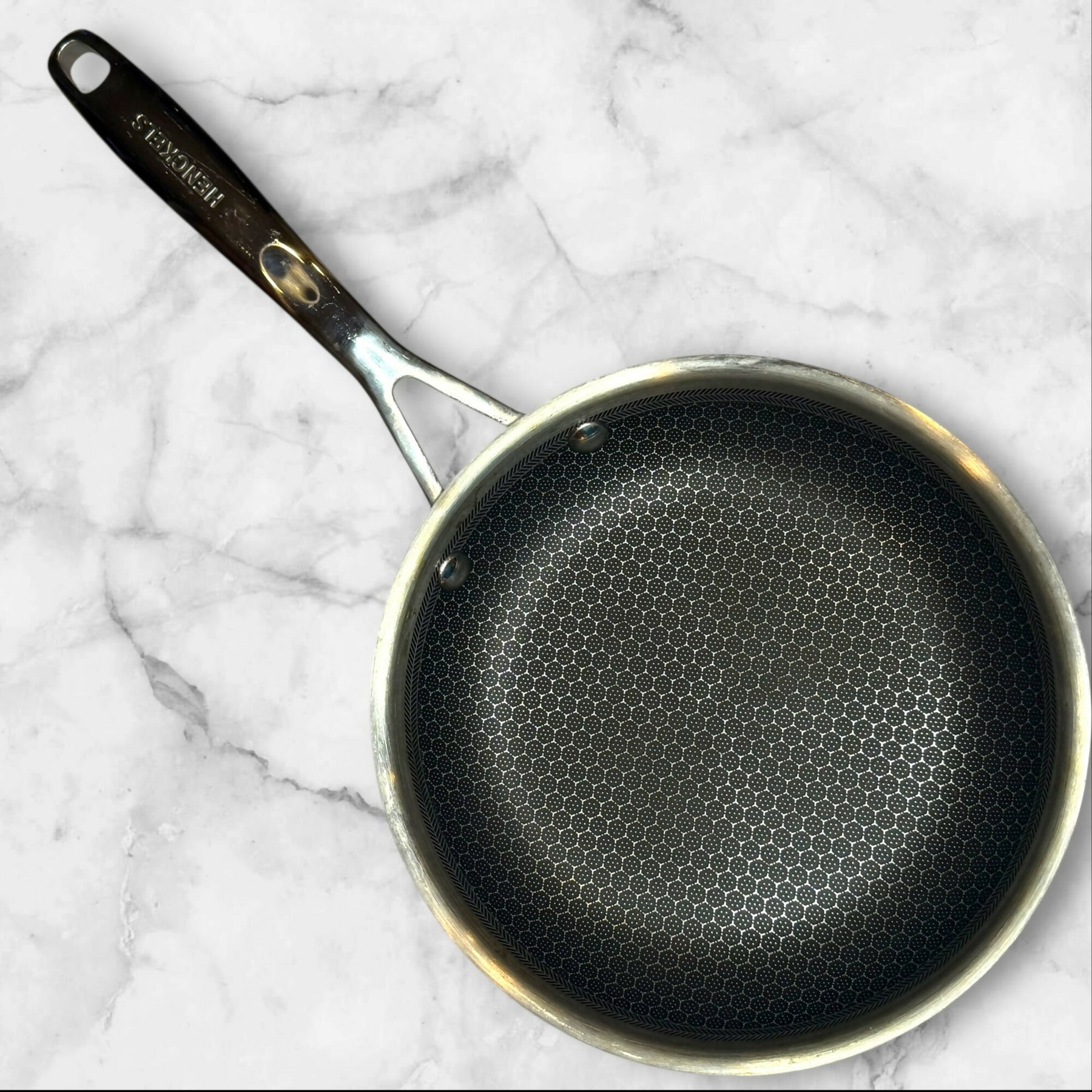 Cook small portions with ease using this Henckels Paradigm 8-Inch Stainless Steel Fry Pan. Designed with a durable nonstick honeycomb pattern reinforced by stainless steel, it provides excellent heat distribution and long-lasting performance. Ideal for frying eggs, sautéing vegetables, or reheating leftovers, this pan works with all cooktops including induction. In good condition with light scratches and normal wear, it remains fully functional and built to last.