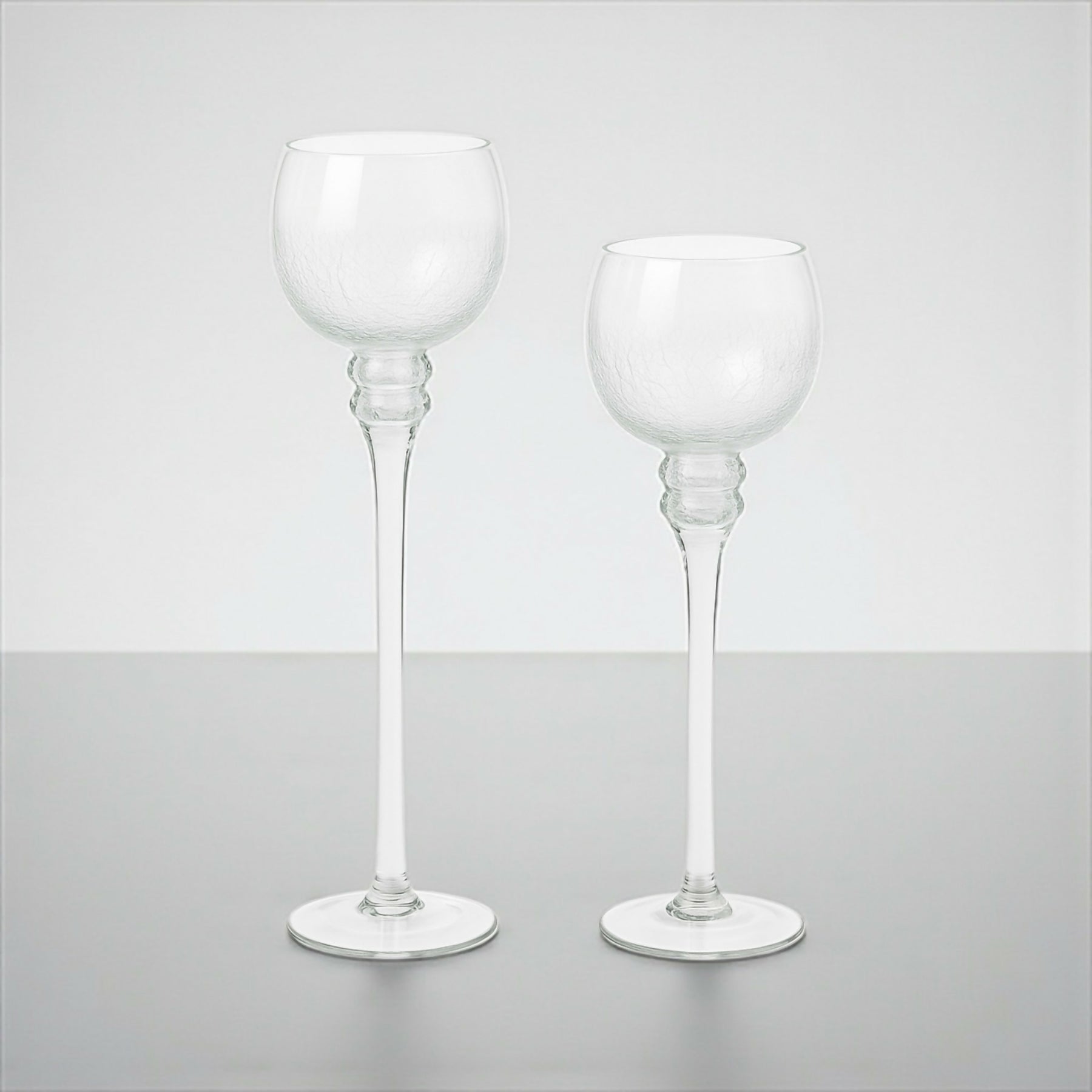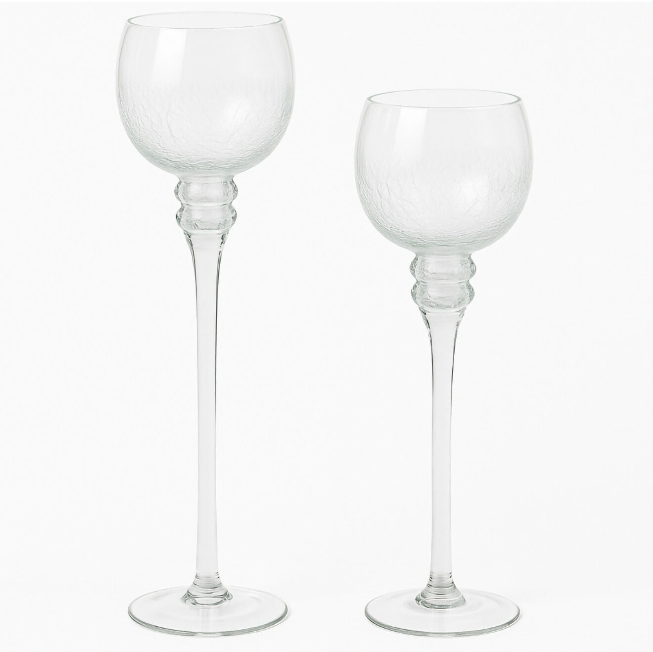 Elevate your décor with this elegant set of crackle glass candlestick holders. Featuring tall stems and a shimmering crackle finish, they add timeless sophistication to any dining table, mantel, or centerpiece display. A beautiful choice for weddings, holidays, or everyday entertaining.