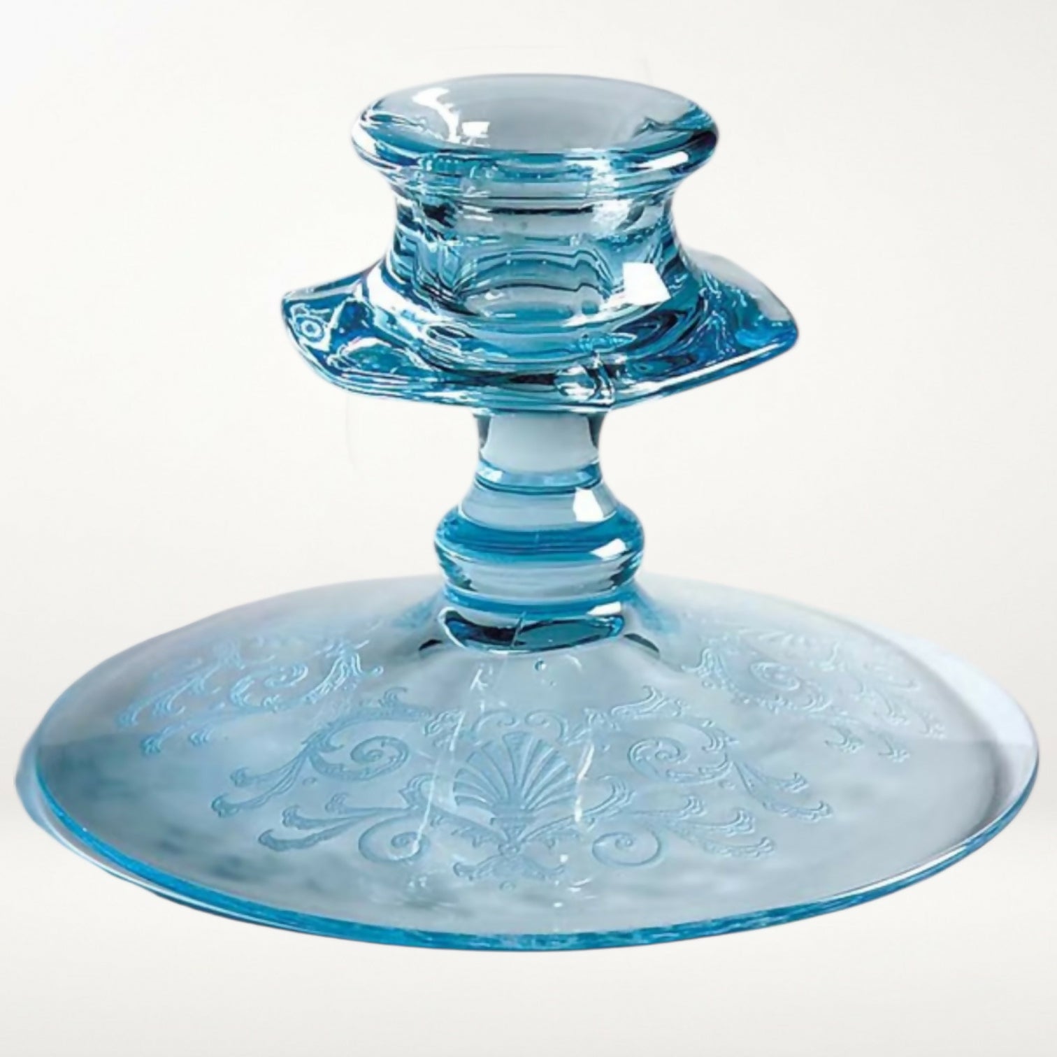 Add a touch of vintage elegance to your table or mantle with this pair of Fostoria Versailles Blue Single Light Candlestick Holders. Beautifully crafted from blown glass, each piece showcases Fostoria’s iconic Versailles etching and soft blue hue. These discontinued pieces are both collectible and timeless. Set of two candlesticks in great condition with no chips or cracks, only gentle wear from age and display.