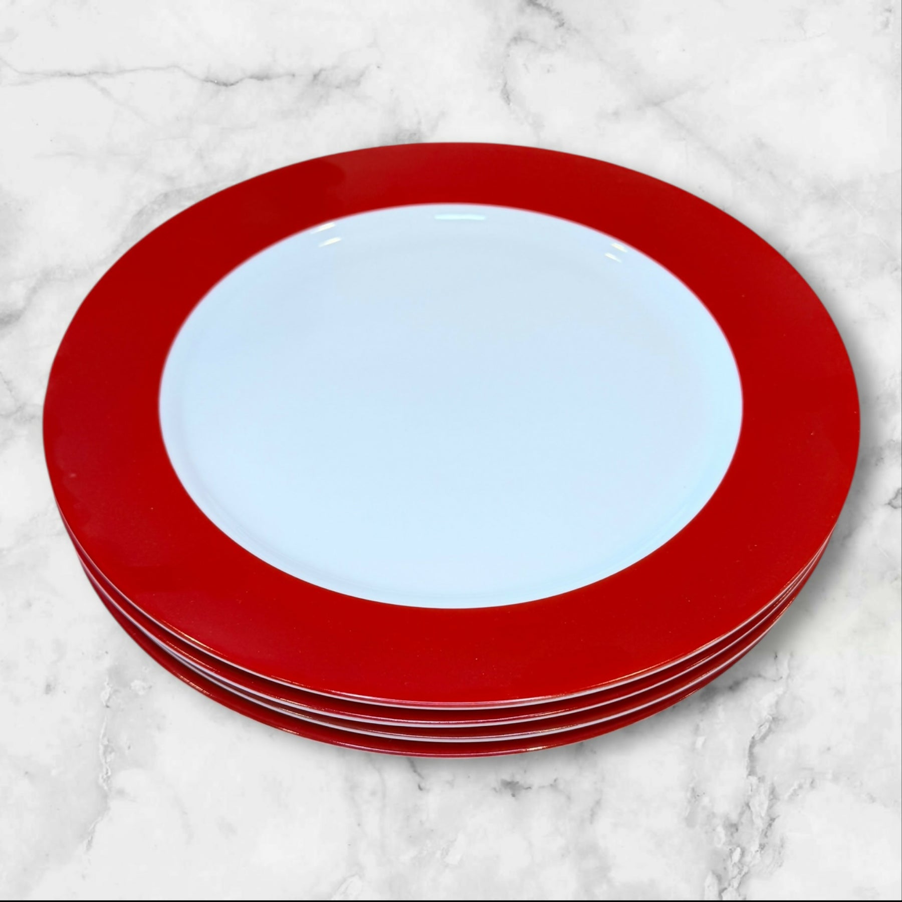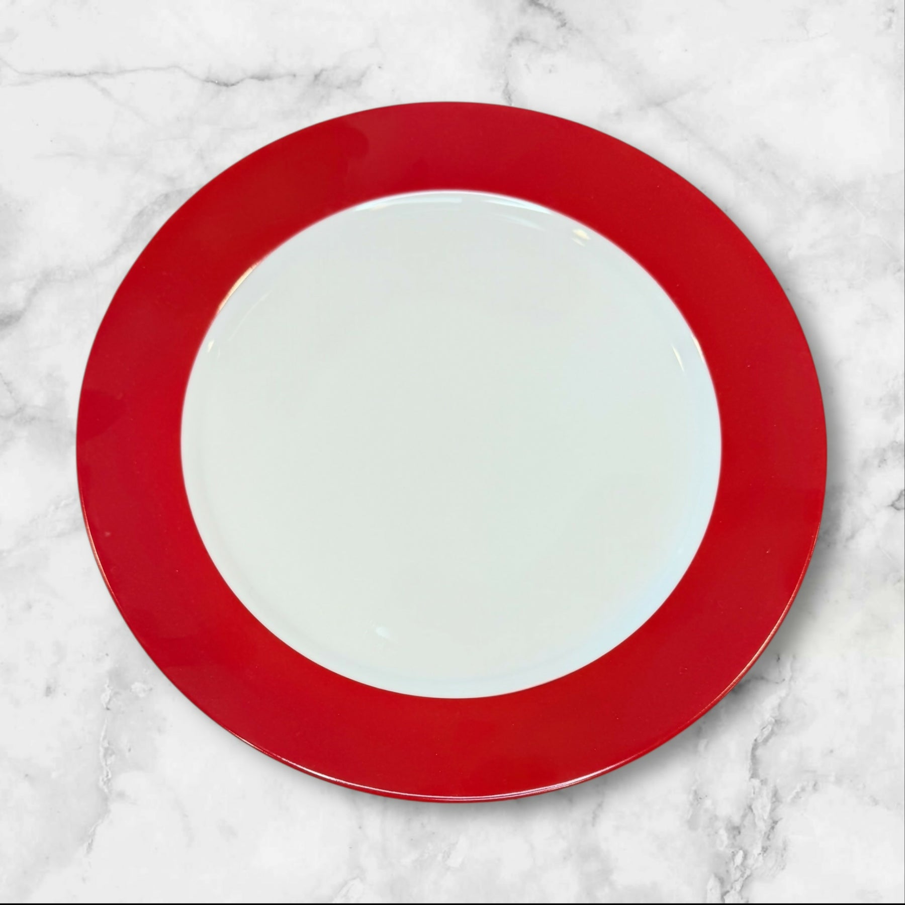 Make a bold statement at your table with this set of 4 Ten Strawberry Street charger plates. Featuring a vibrant glossy red rim paired with a soft light blue center, these high-quality porcelain plates create a striking modern tablescape. Perfect for holiday entertaining, layered place settings, weddings, or event styling. Durable, elegant, and in excellent condition with minimal wear.