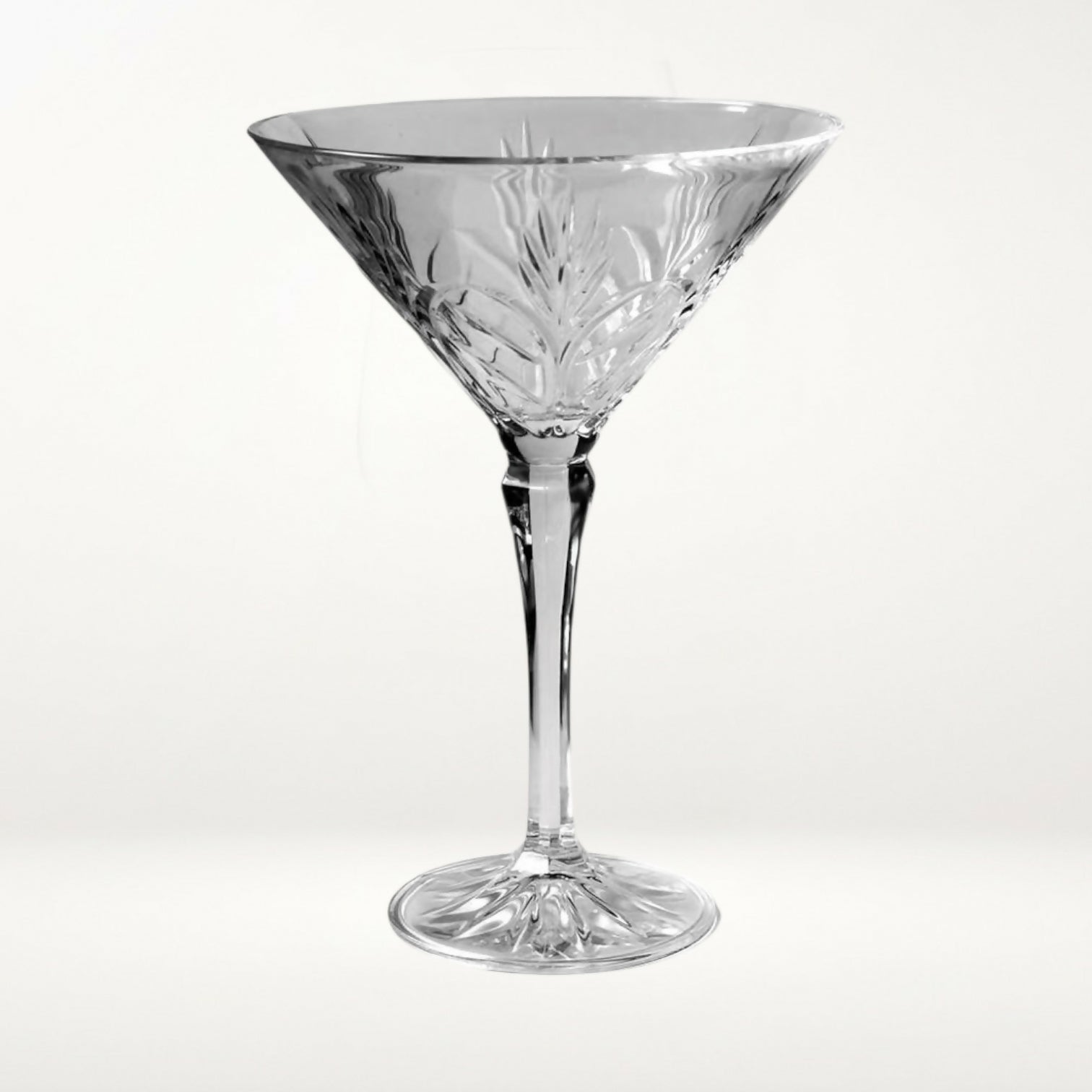 Serve cocktails in timeless elegance with this set of two Portico martini glasses by Crystal Clear Industries. Handcrafted from brilliant lead crystal, each glass features a refined cut-leaf design and radiant clarity. The Portico collection is discontinued and highly sought after. These glasses are in great condition with no chips or cloudiness, perfect for entertaining or adding sparkle to your barware collection.