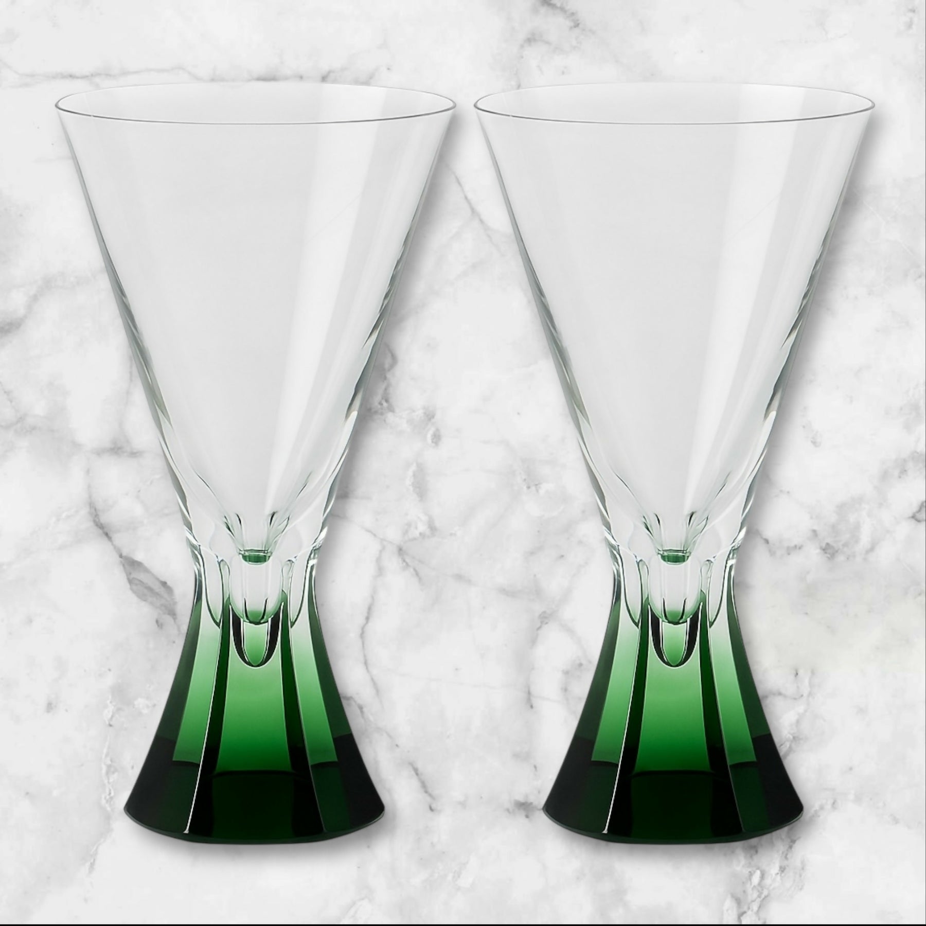 Elevate your cocktail hour with this set of 2 Emerald Teardrop martini glasses, featuring a sculpted crystal design with a bold green base that fades into clear glass. Each glass measures 7 1/8” tall by 4” wide and showcases modern artistry with vintage appeal. Perfect for martinis or signature cocktails, these glasses are in great condition with no chips or cracks—timeless elegance for entertaining.