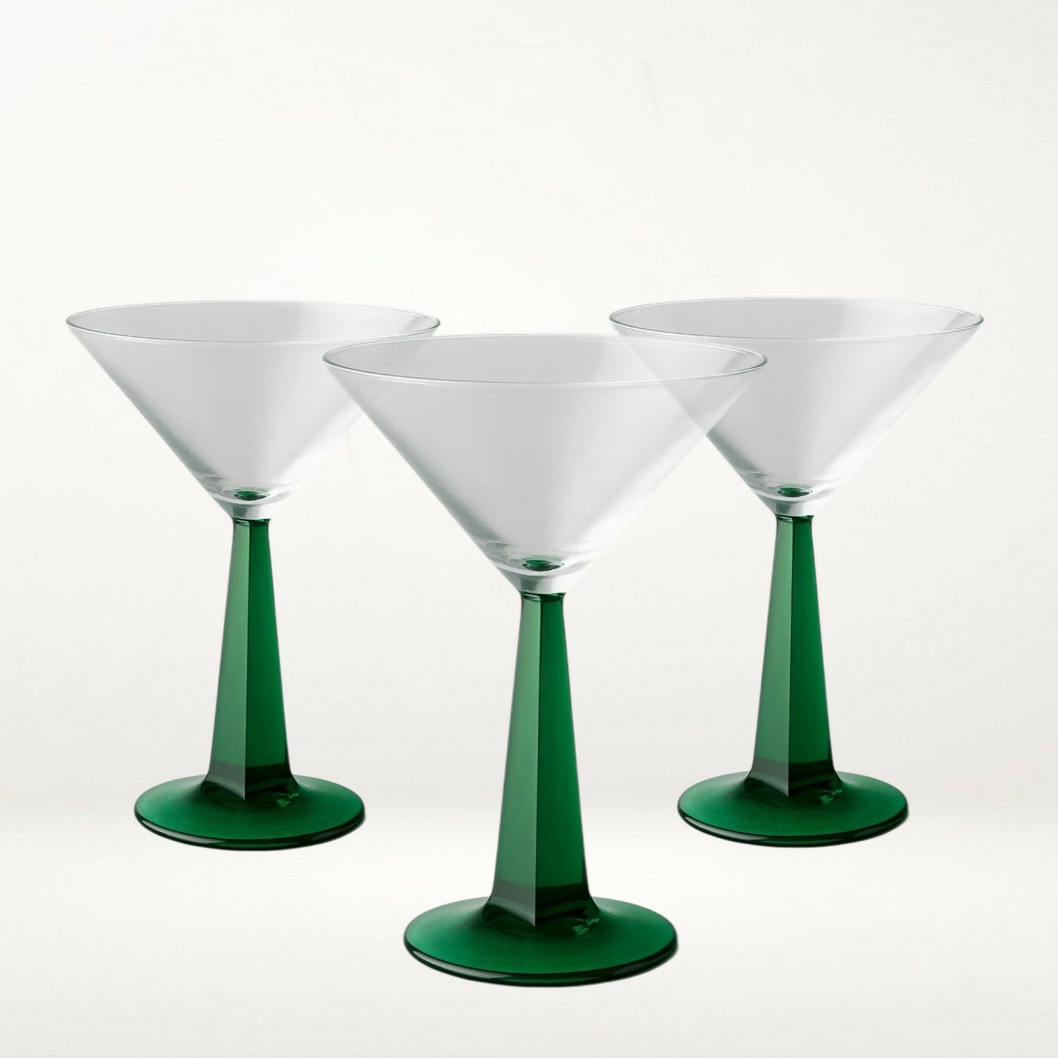 Serve cocktails in style with this set of three martini glasses featuring striking emerald-green stems and clear conical bowls. Their modern, elegant design adds a pop of color to any bar or table setting. Perfect for martinis, cosmopolitans, or festive entertaining. Crafted with durable glass and a weighted base for stability, these glasses combine visual appeal with functionality.