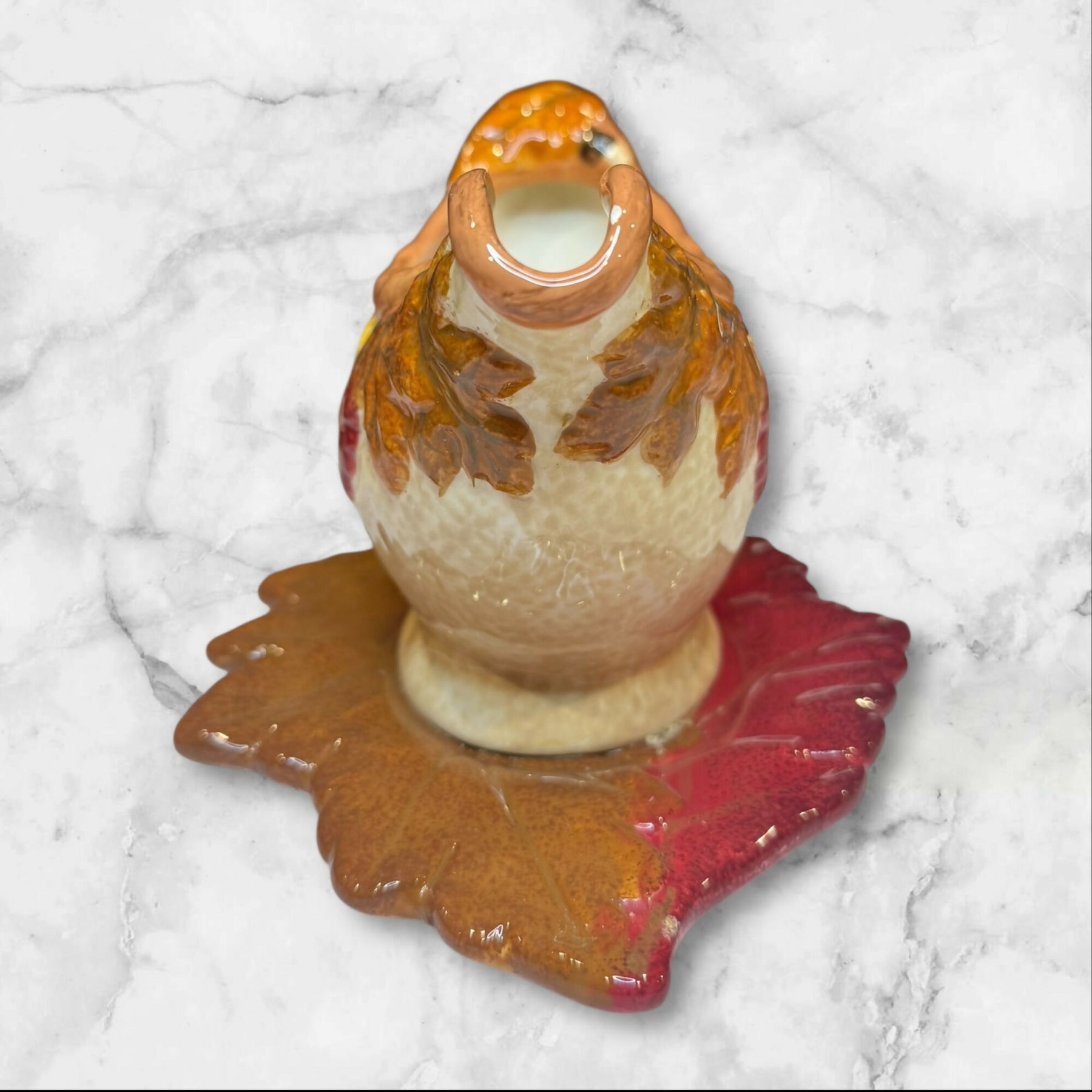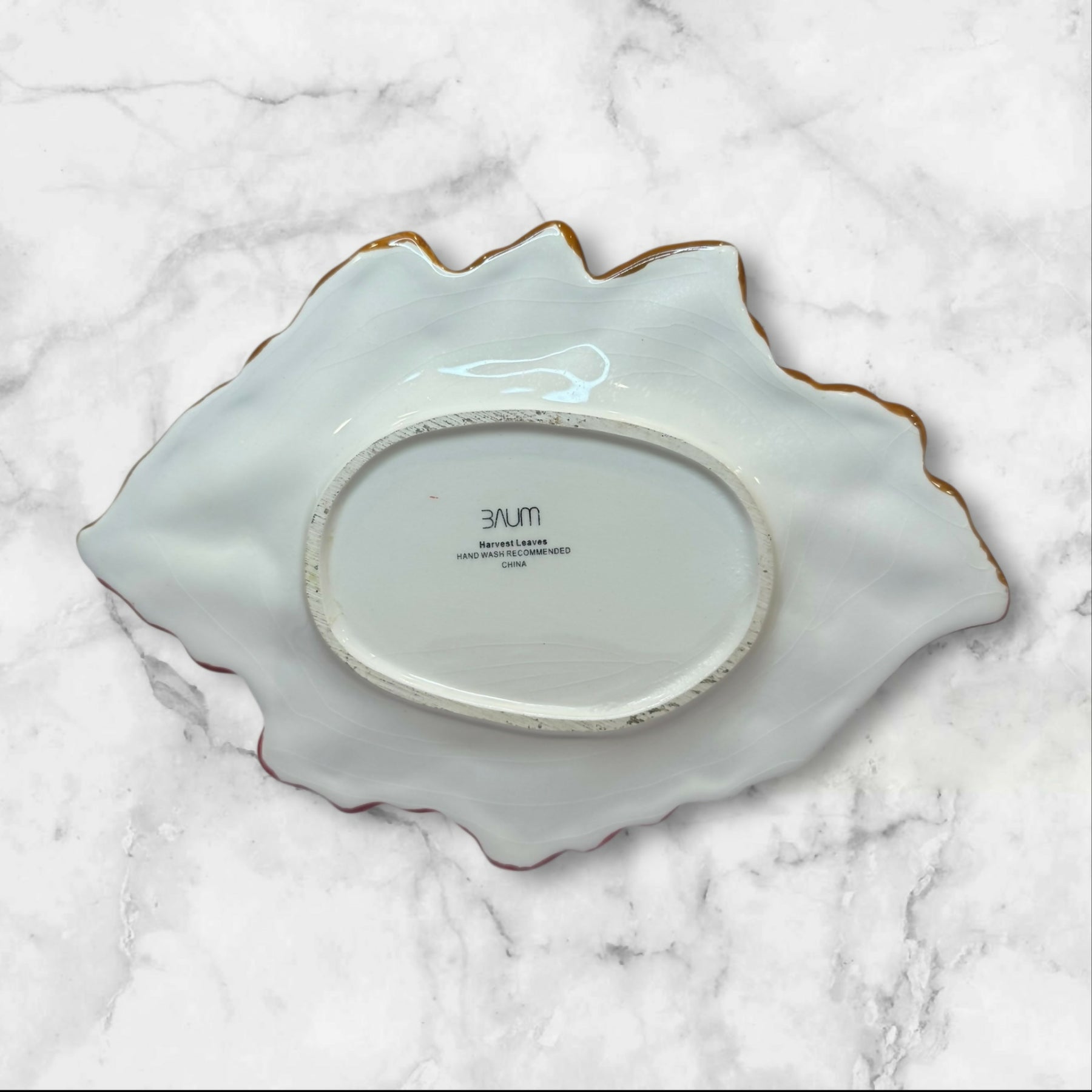 Celebrate the season in style with this Baum Harvest Leaves gravy boat and coordinating leaf-shaped underplate. Featuring a warm autumn palette with embossed leaf details, this hand-painted ceramic piece brings rustic charm to your Thanksgiving or fall table. Measures approximately 8.75” long. There is a small nick on the spout and light crazing, but overall in good pre-owned condition—beautiful for display or serving.