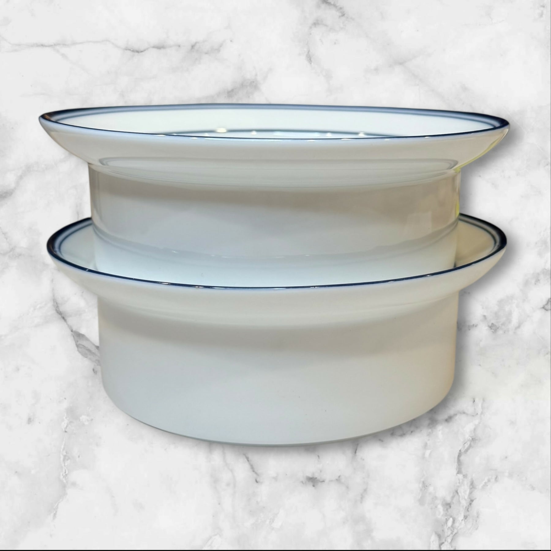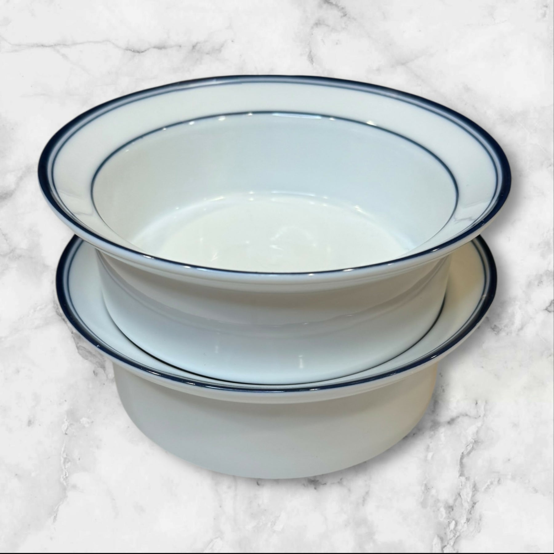 Add timeless elegance to your table with this set of 2 Dansk Allegro Blue bowls. Crafted in Sri Lanka, these versatile bowls feature a deep blue glaze with a clean, modern design perfect for everyday dining or special occasions. Each piece shows only mild utensil marks, retaining their beauty and functionality.