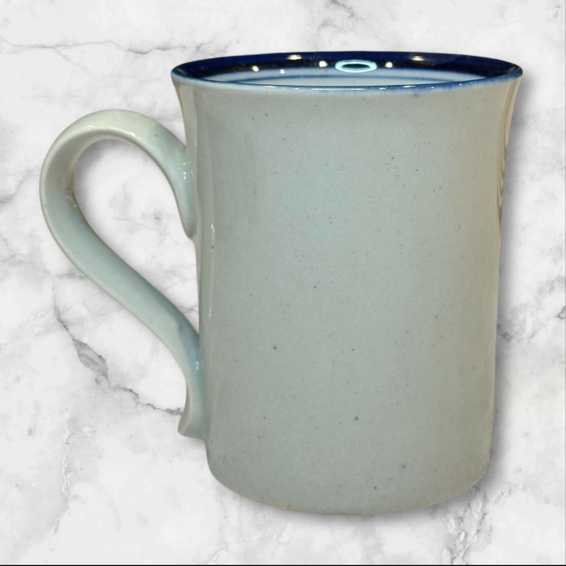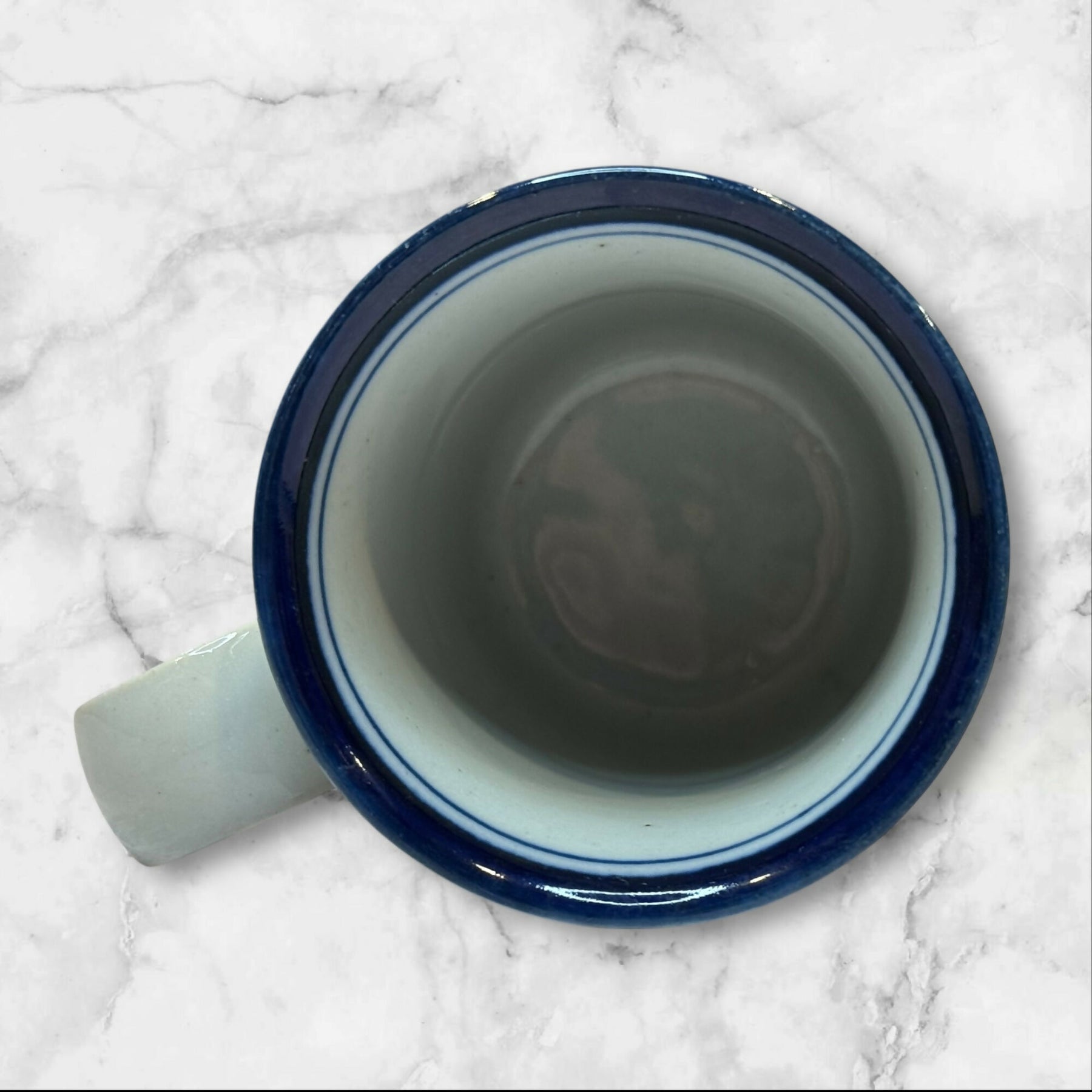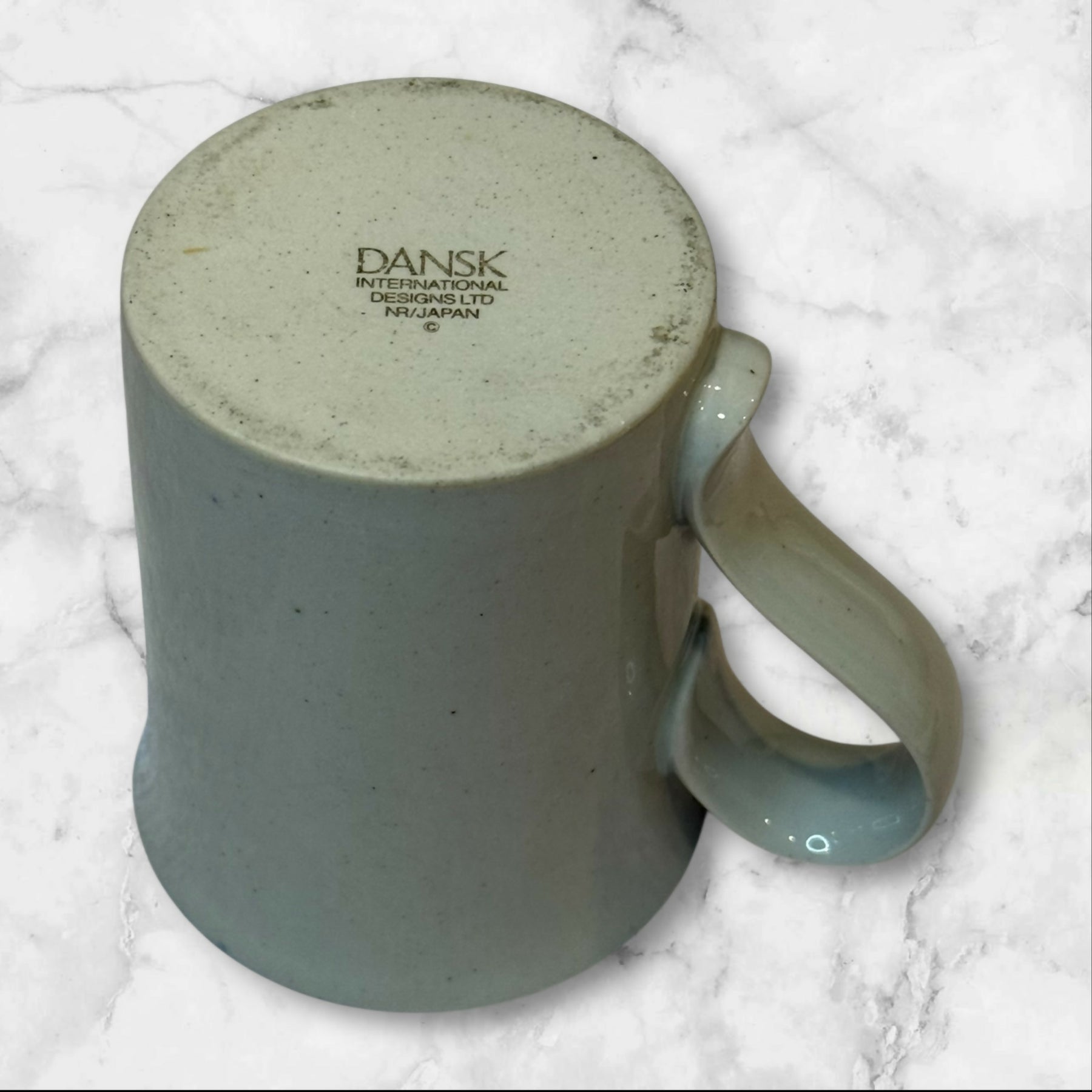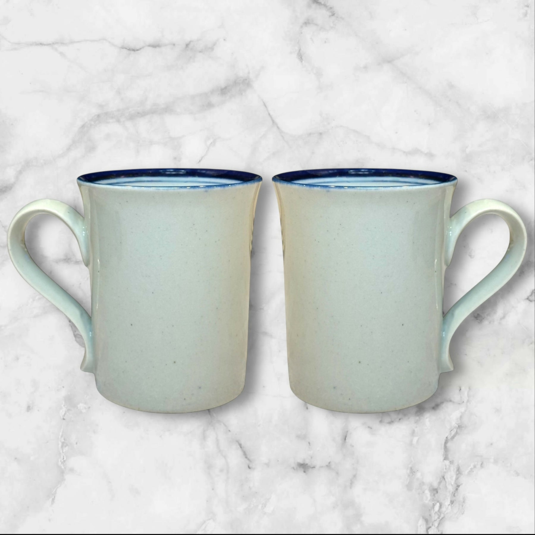 Add a touch of vintage charm to your table with this suspected Dansk Blue Mist stoneware coffee mug set. Designed by Niels Refsgaard and crafted in Japan, these mugs feature a soft beige-gray base with earthy speckles and a navy blue rim. Perfect for everyday use or as a collectible addition, they offer a timeless, minimalist appeal.