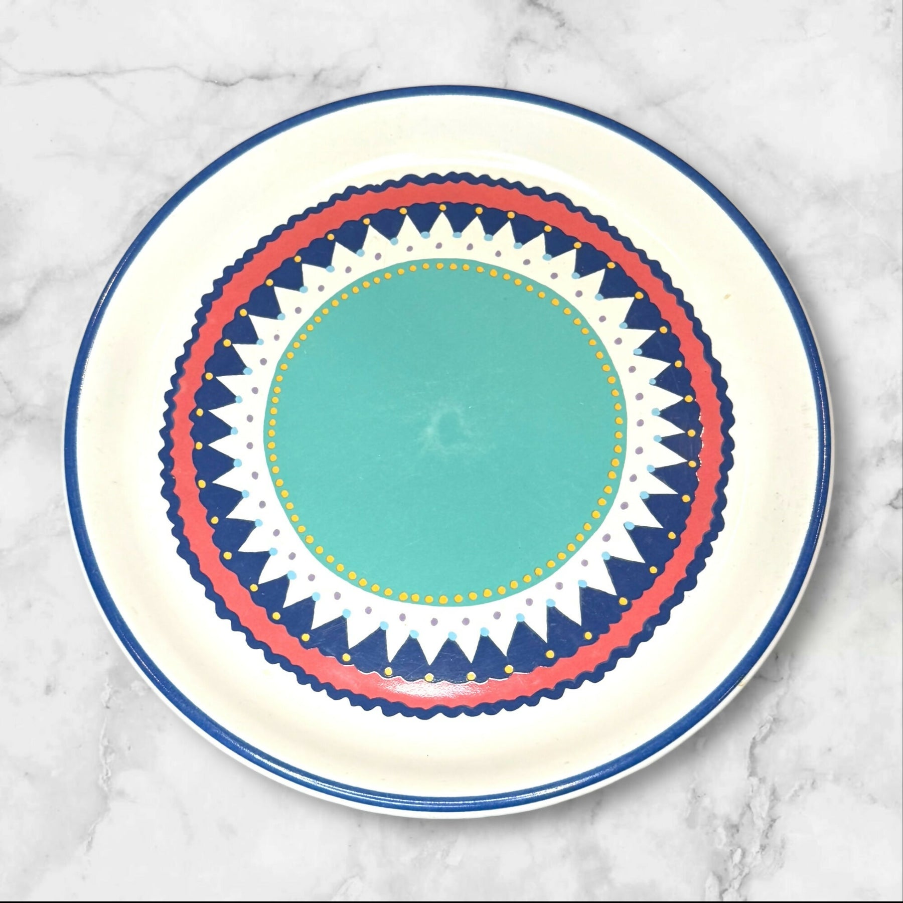 Serve meals with vibrant style using this set of 4 Dansk Carnival dinner plates. Crafted in Japan, these stoneware plates feature bold geometric patterns with turquoise, navy, and red accents for a festive look. Durable and versatile, they are perfect for everyday dining or entertaining. Microwave safe and easy to clean, these Dansk dinner plates combine artistic design with lasting quality for a timeless addition to your collection.