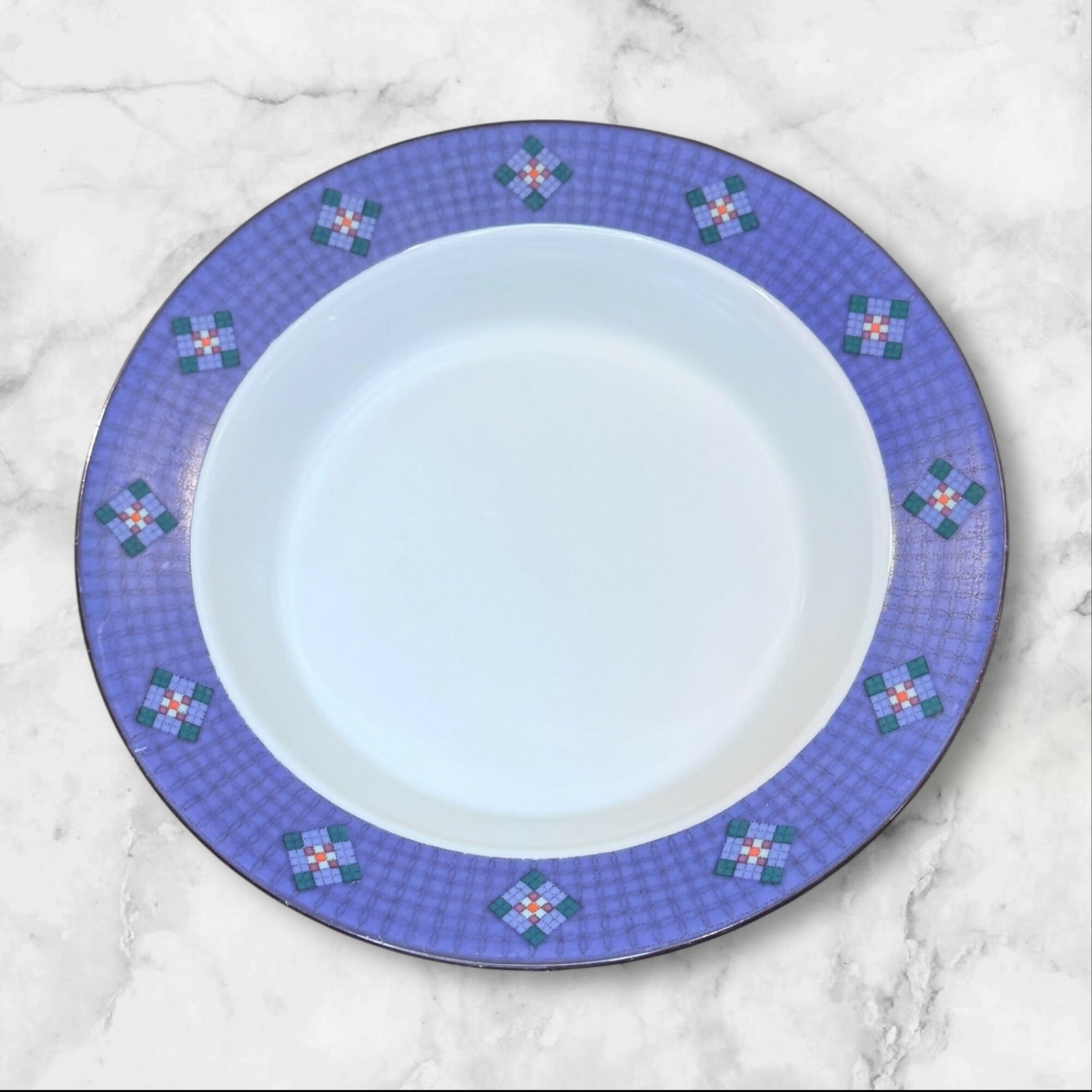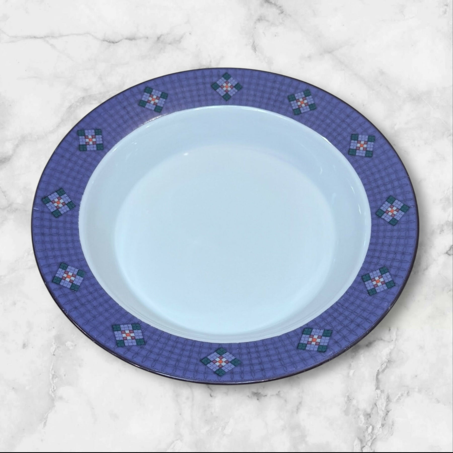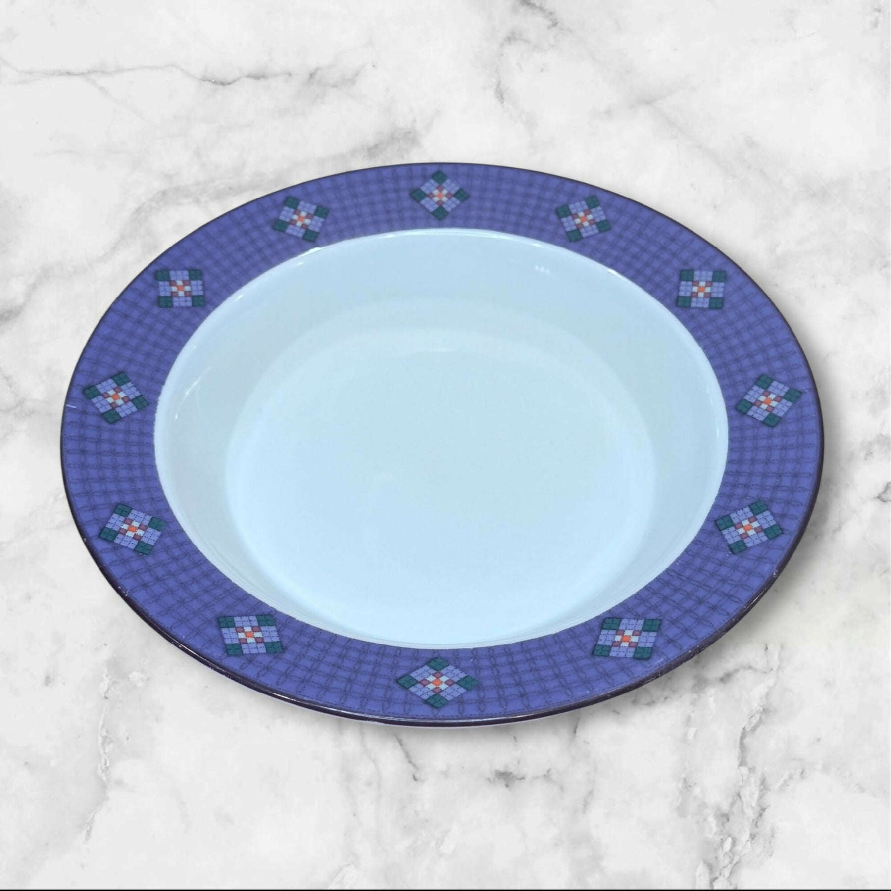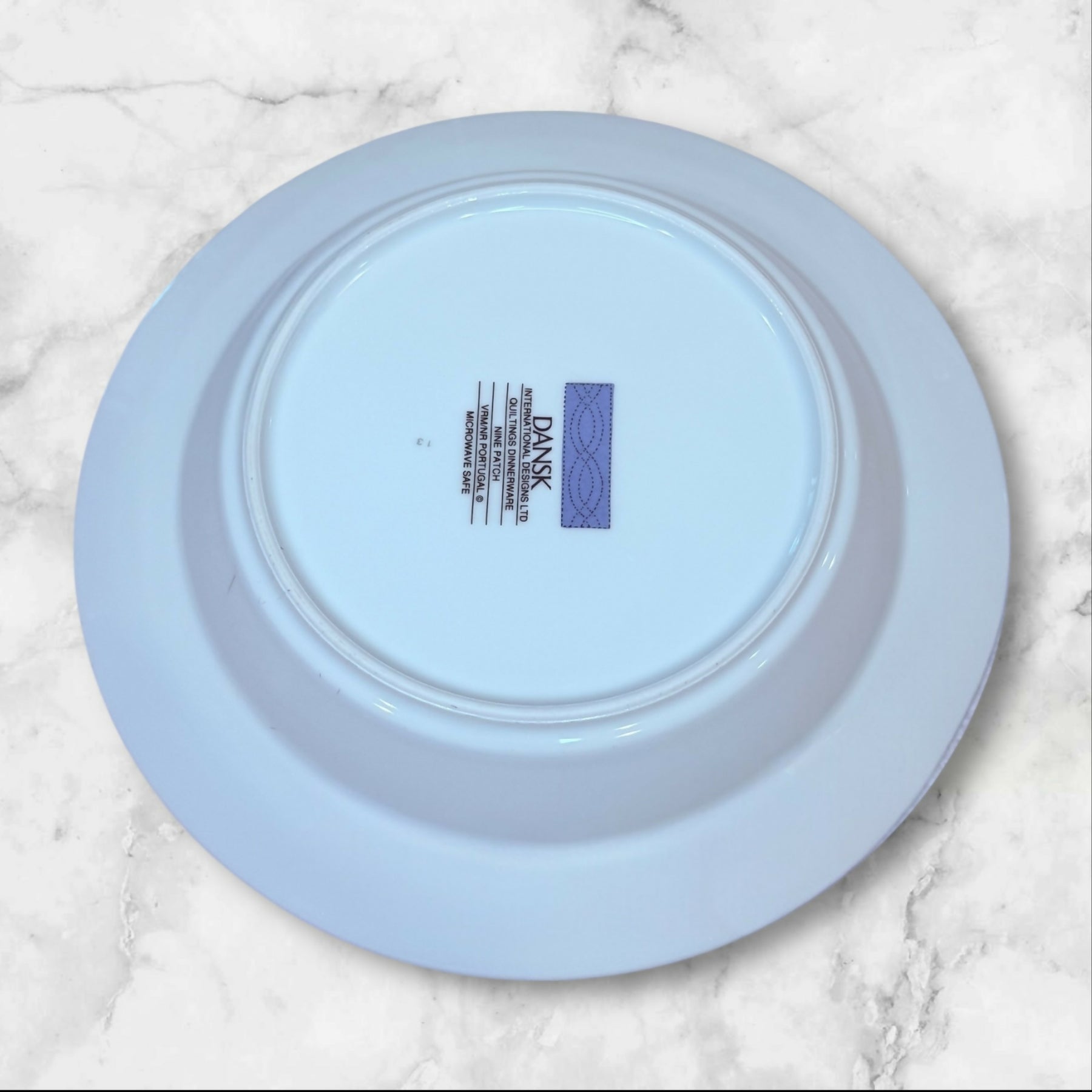 Bring timeless Dansk style to your table with this set of 4 Nine Patch rim soup bowls. Crafted in Portugal, these earthenware bowls feature a bold blue rim with floral accents and white centers. Perfect for soups, pasta, or stews. One bowl has a minor side chip, while the others are in excellent condition. A discontinued and collectible design, ideal for everyday use or completing your set.