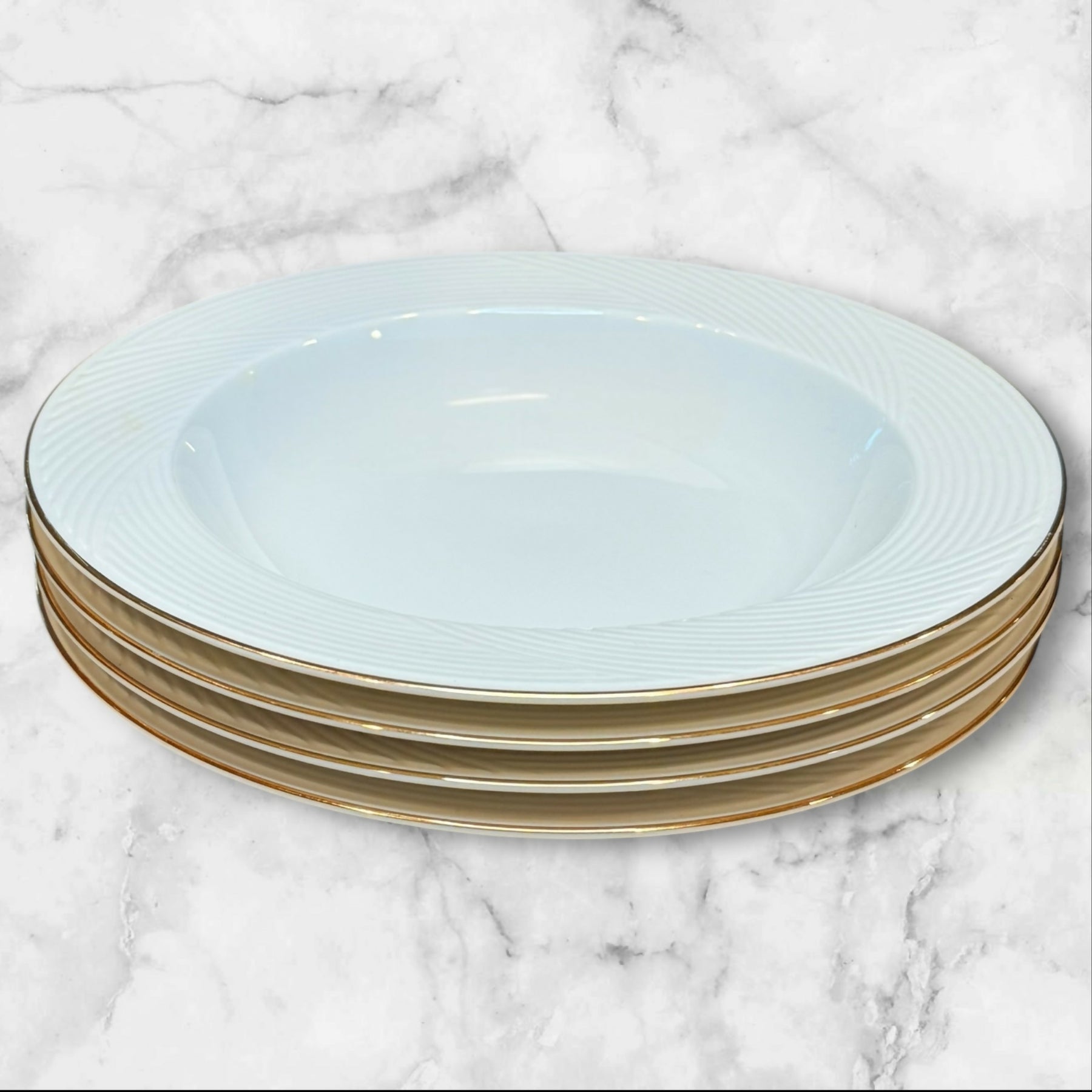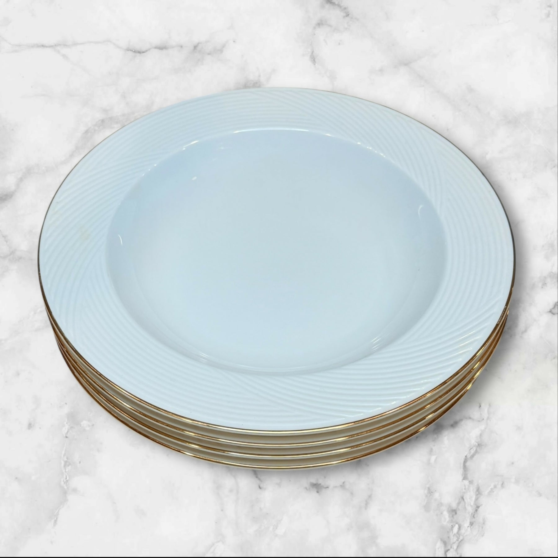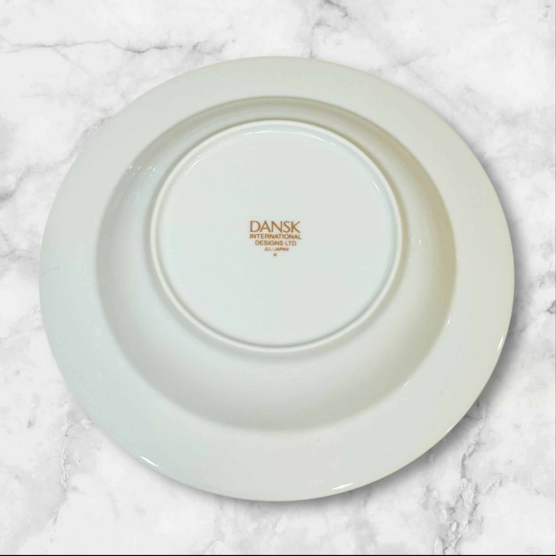 Bring timeless elegance to your table with this set of 4 Dansk Tapestries International Designs soup bowls. Featuring a classic white porcelain body with a refined gold rim and subtle textured detail, these bowls are perfect for serving soups, pastas, or salads. Crafted in Japan, they showcase Dansk’s quality and sophisticated style. All pieces are in excellent condition with minimal signs of prior use.
