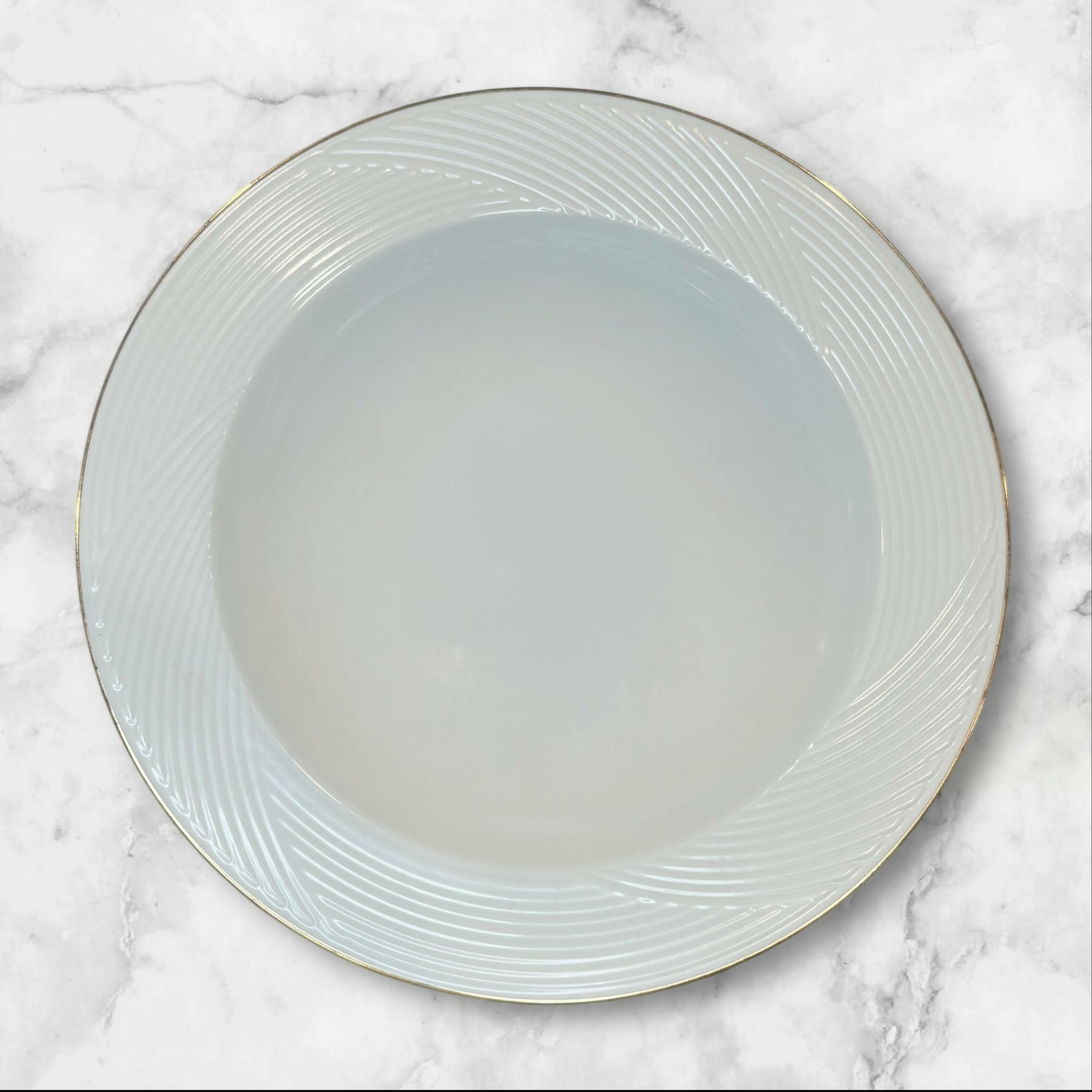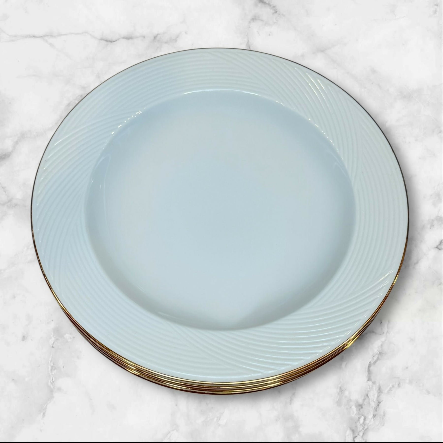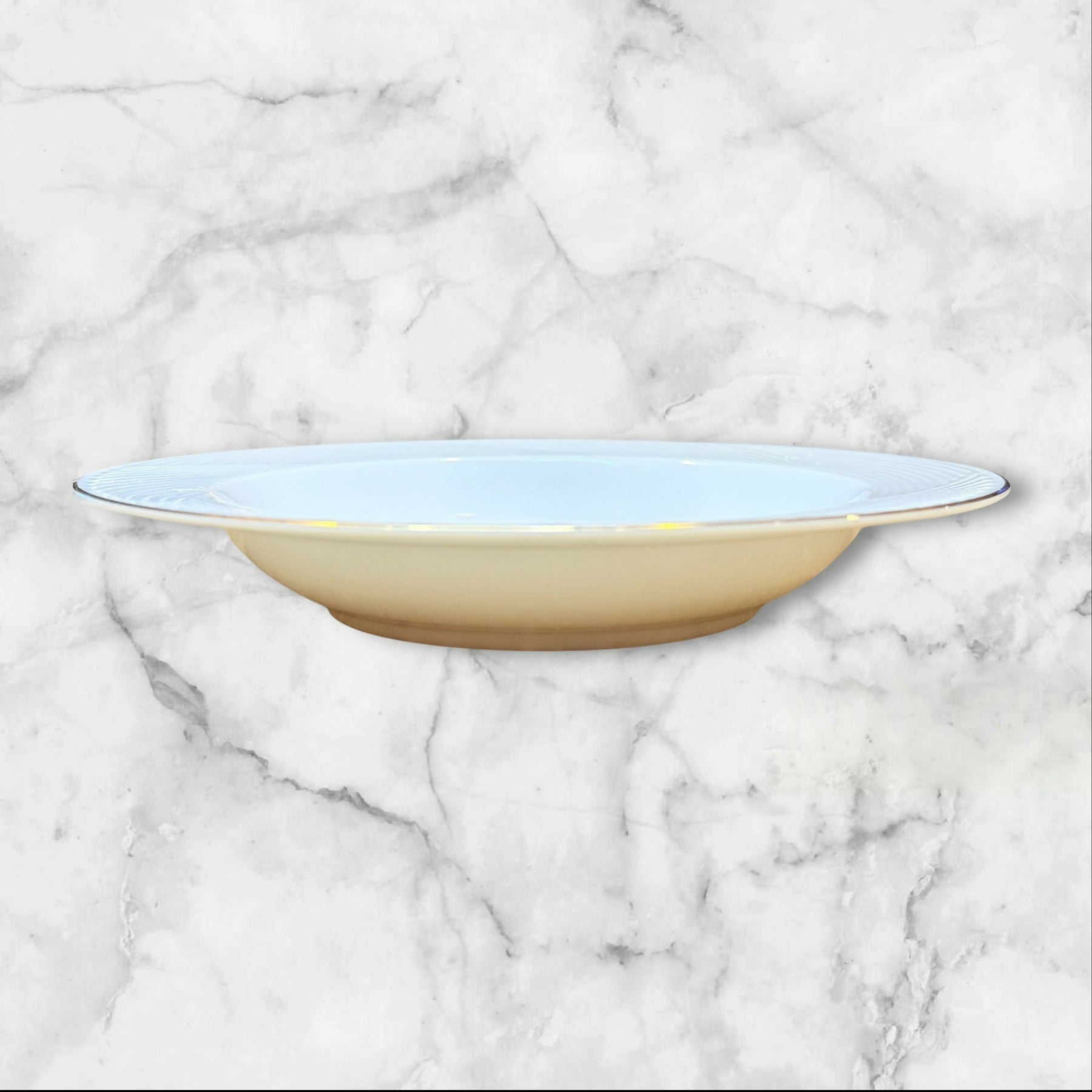 Bring timeless elegance to your table with this set of 4 Dansk Tapestries International Designs soup bowls. Featuring a classic white porcelain body with a refined gold rim and subtle textured detail, these bowls are perfect for serving soups, pastas, or salads. Crafted in Japan, they showcase Dansk’s quality and sophisticated style. All pieces are in excellent condition with minimal signs of prior use.