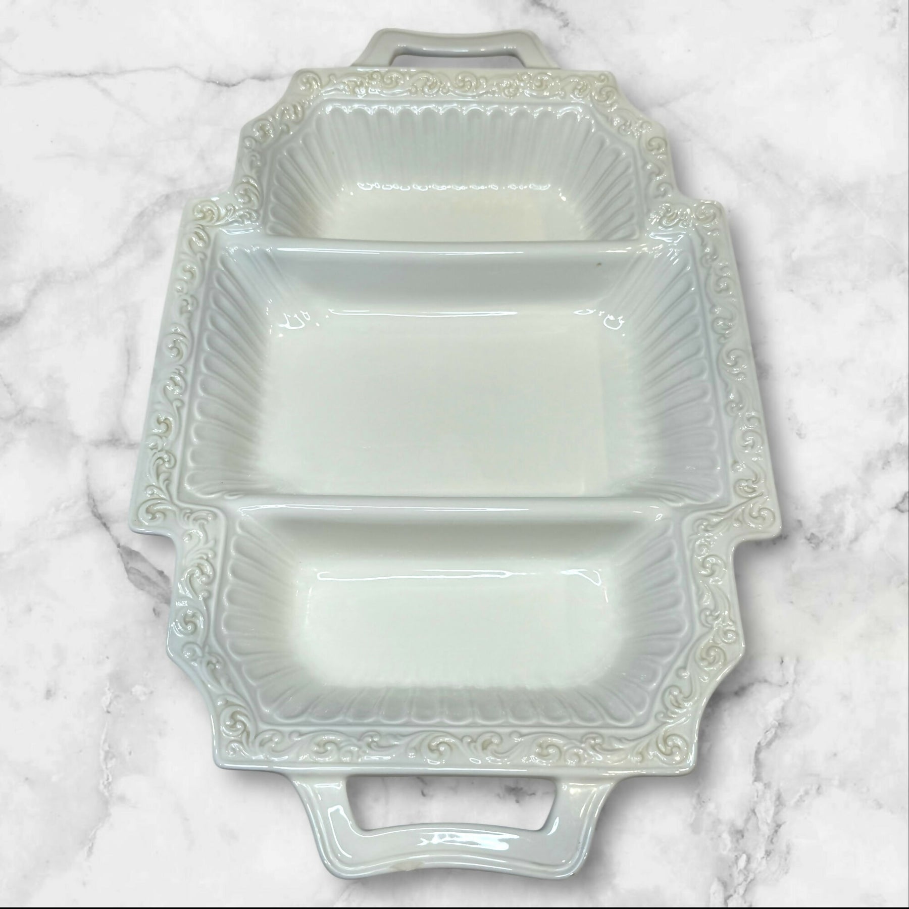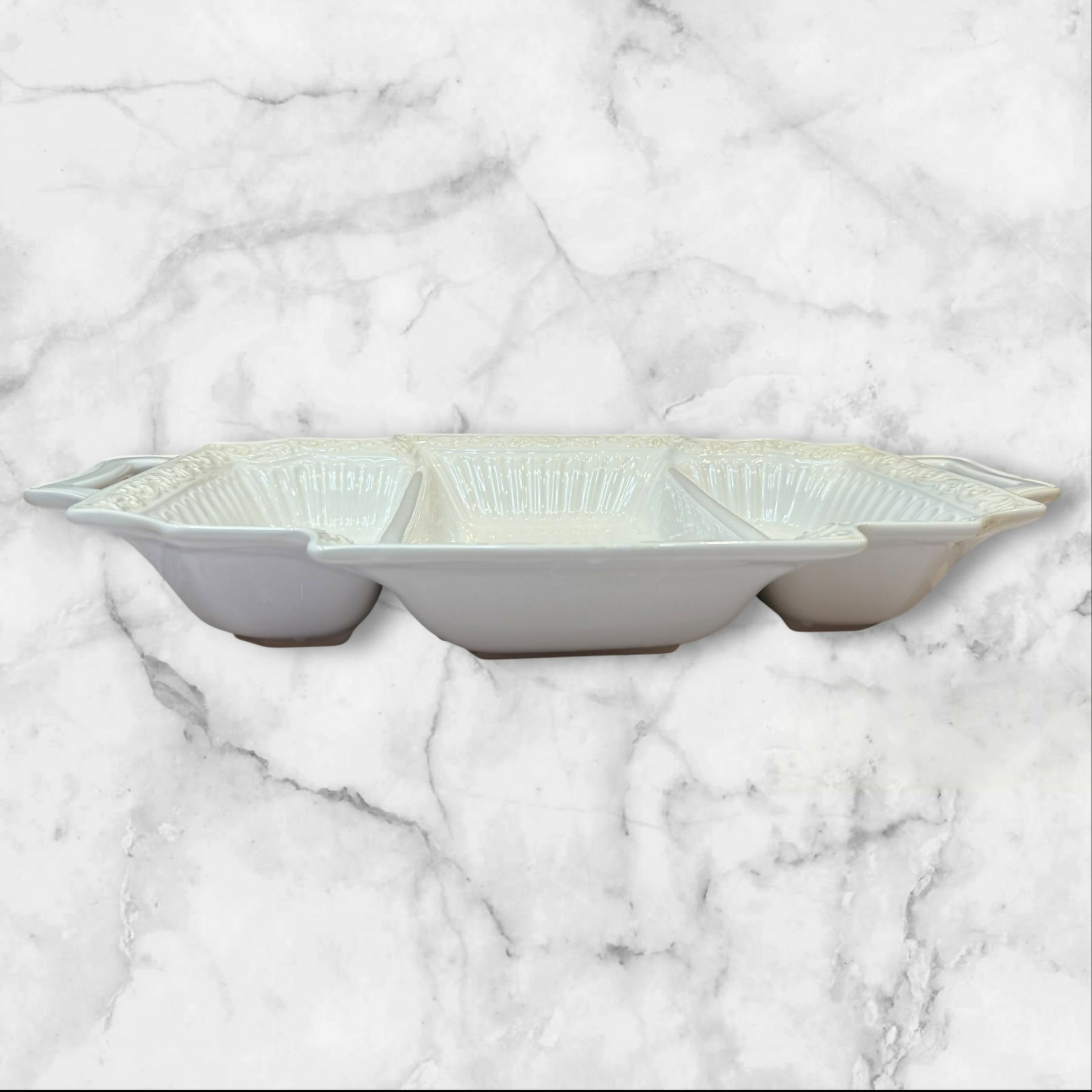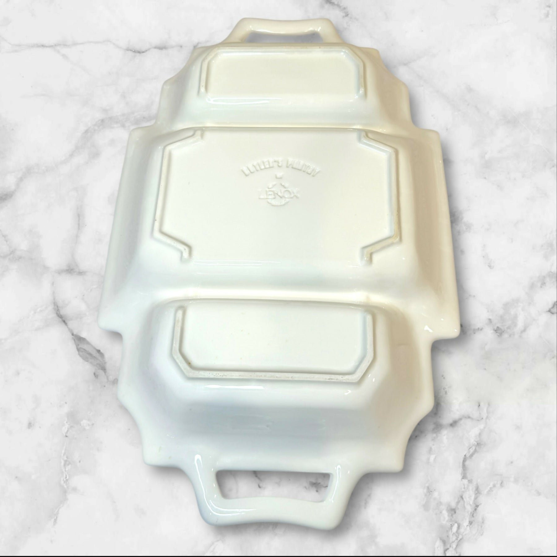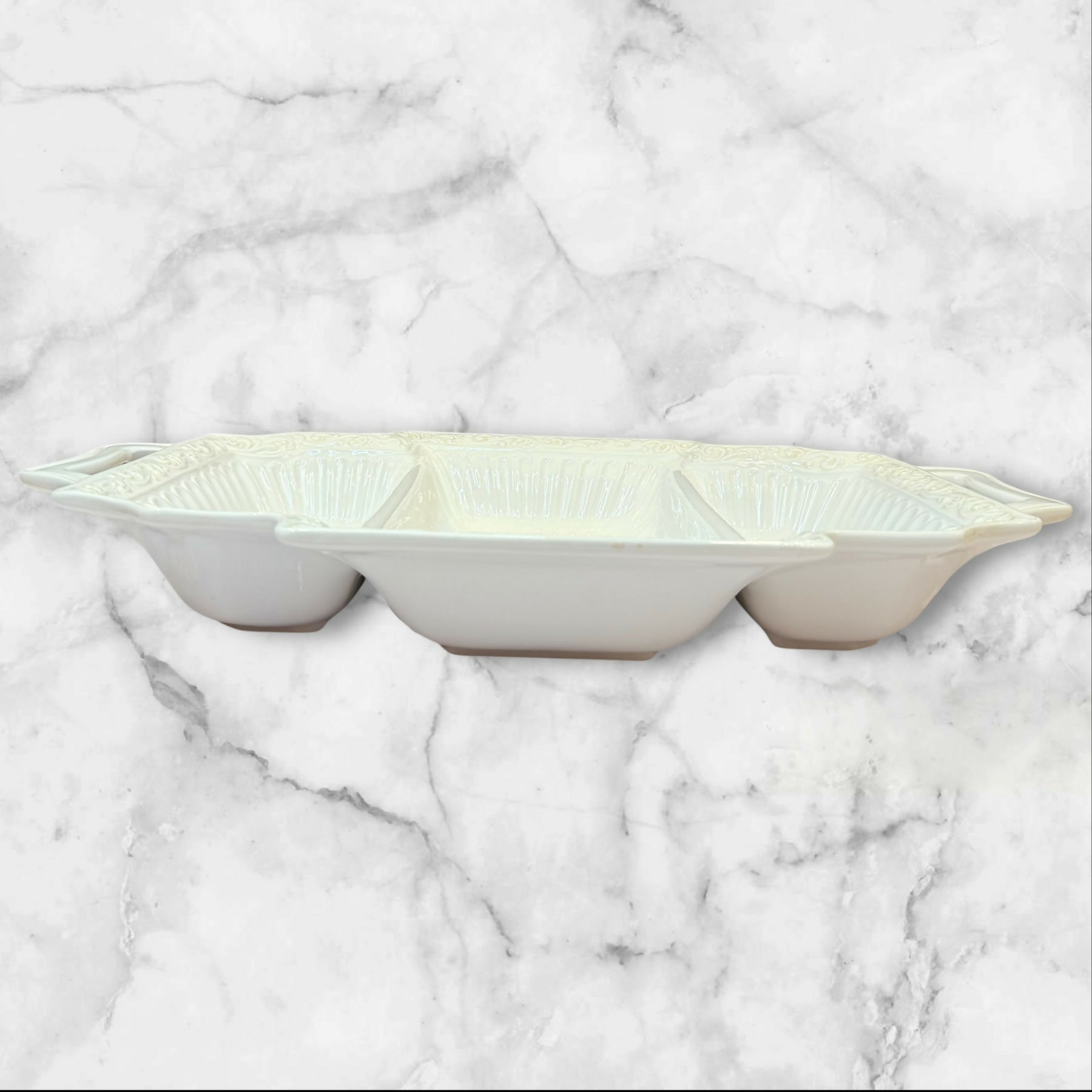 Elevate your serving collection with this Lenox Butler’s Pantry 3-Part Rectangular Divided Server. Featuring elegant embossed detailing and convenient handles, this versatile piece is ideal for serving appetizers, vegetables, or side dishes. Crafted in the USA, it is both microwave and dishwasher safe. In excellent condition with just a few very minor nicks on the side that are barely noticeable. A timeless and functional addition to any table.