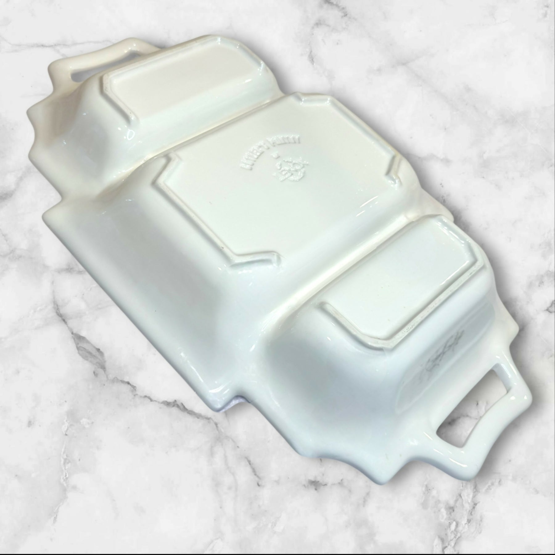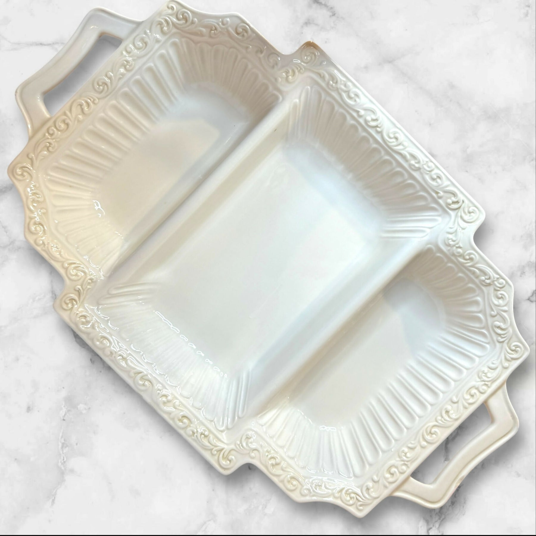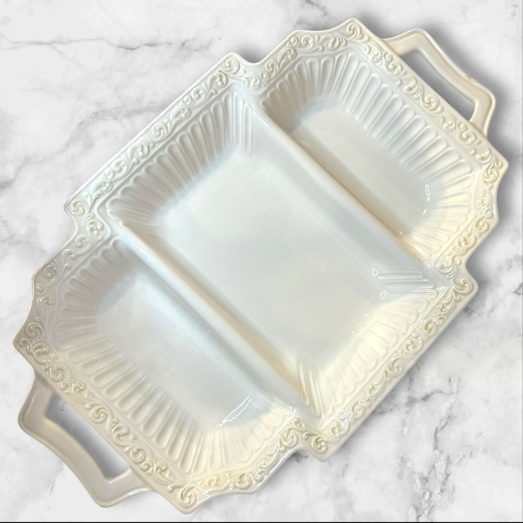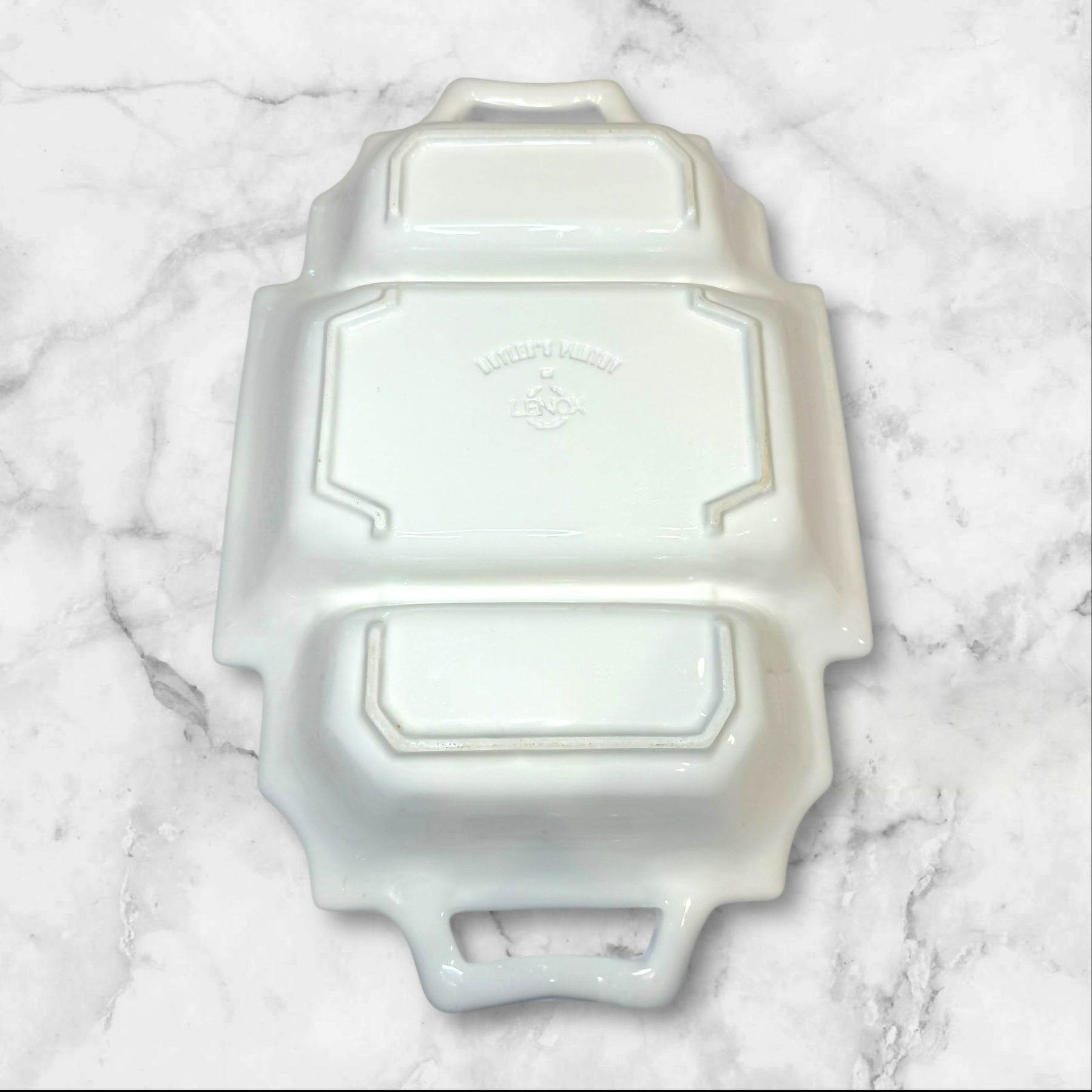 Elevate your serving collection with this Lenox Butler’s Pantry 3-Part Rectangular Divided Server. Featuring elegant embossed detailing and convenient handles, this versatile piece is ideal for serving appetizers, vegetables, or side dishes. Crafted in the USA, it is both microwave and dishwasher safe. In excellent condition with just a few very minor nicks on the side that are barely noticeable. A timeless and functional addition to any table.