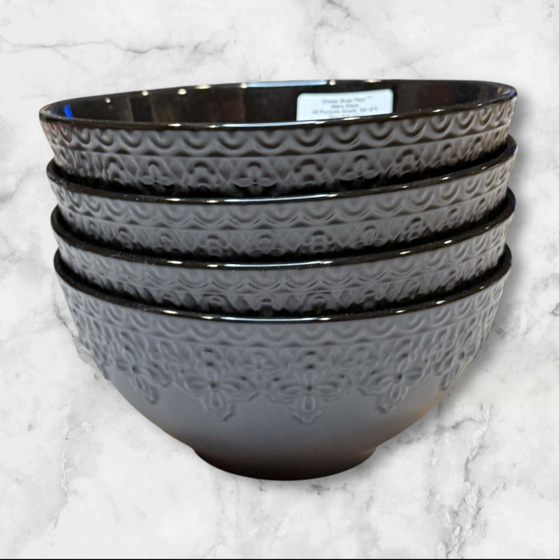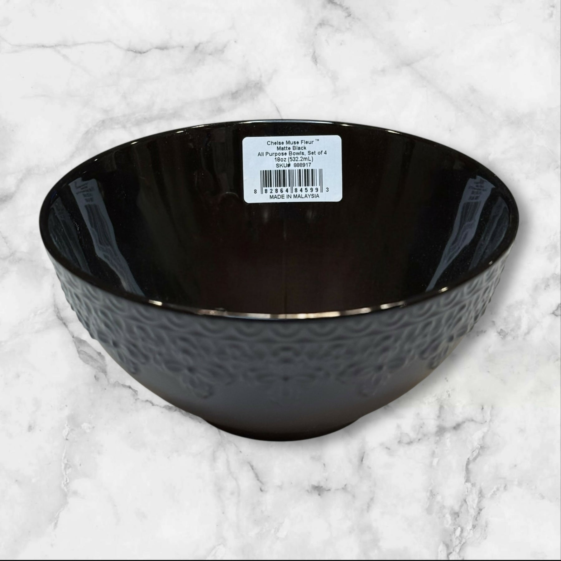 Bring elegance and modern style to your table with this set of Lenox Chelse Muse Fleur Matte Black bowls. Featuring an embossed floral design with a sleek matte finish, these bowls are perfect for soups, salads, pasta, or everyday meals. Each durable stoneware bowl holds 18 ounces and is both microwave and dishwasher safe. This popular and discontinued Lenox collection is hard to find — these bowls are brand new in box.