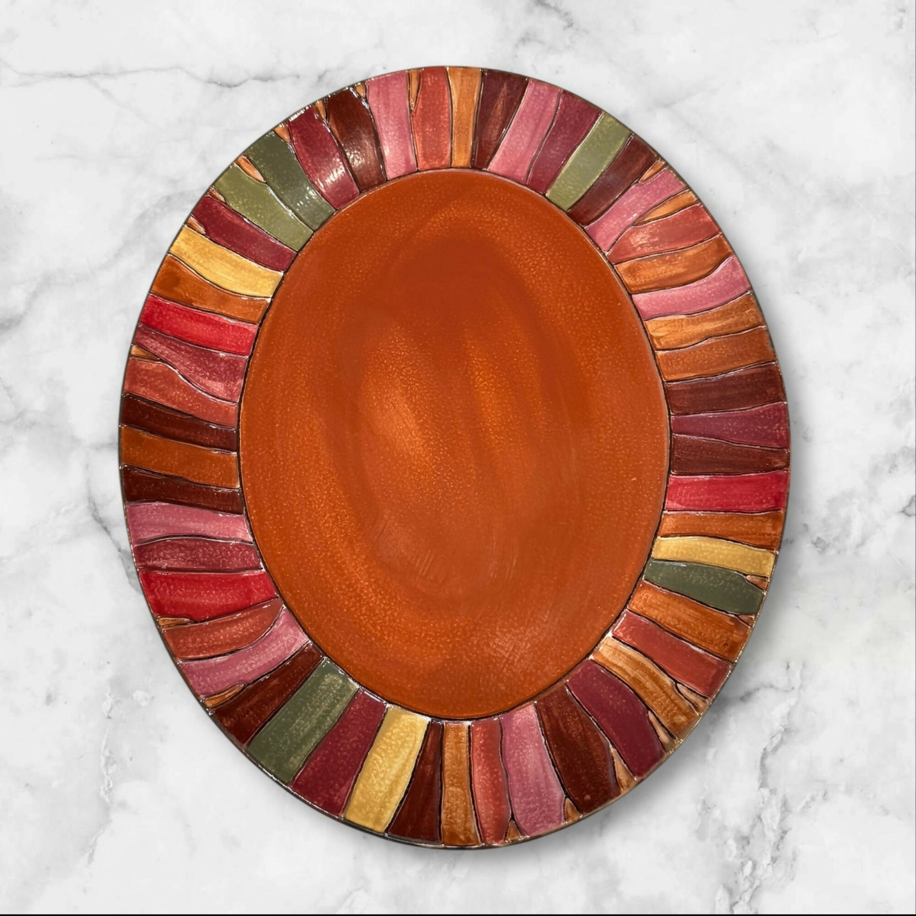 Brighten your table with this vibrant oval serving platter from Pier 1’s Wavy Stripe collection. Crafted from durable stoneware and finished with bold, multicolor striped accents, this discontinued platter is both functional and stylish. Measuring 16 1/8” x 13”, it’s ideal for serving roasts, pasta, appetizers, or desserts at gatherings. Dishwasher safe and made in China, this collectible piece is offered in excellent condition with no chips or cracks.