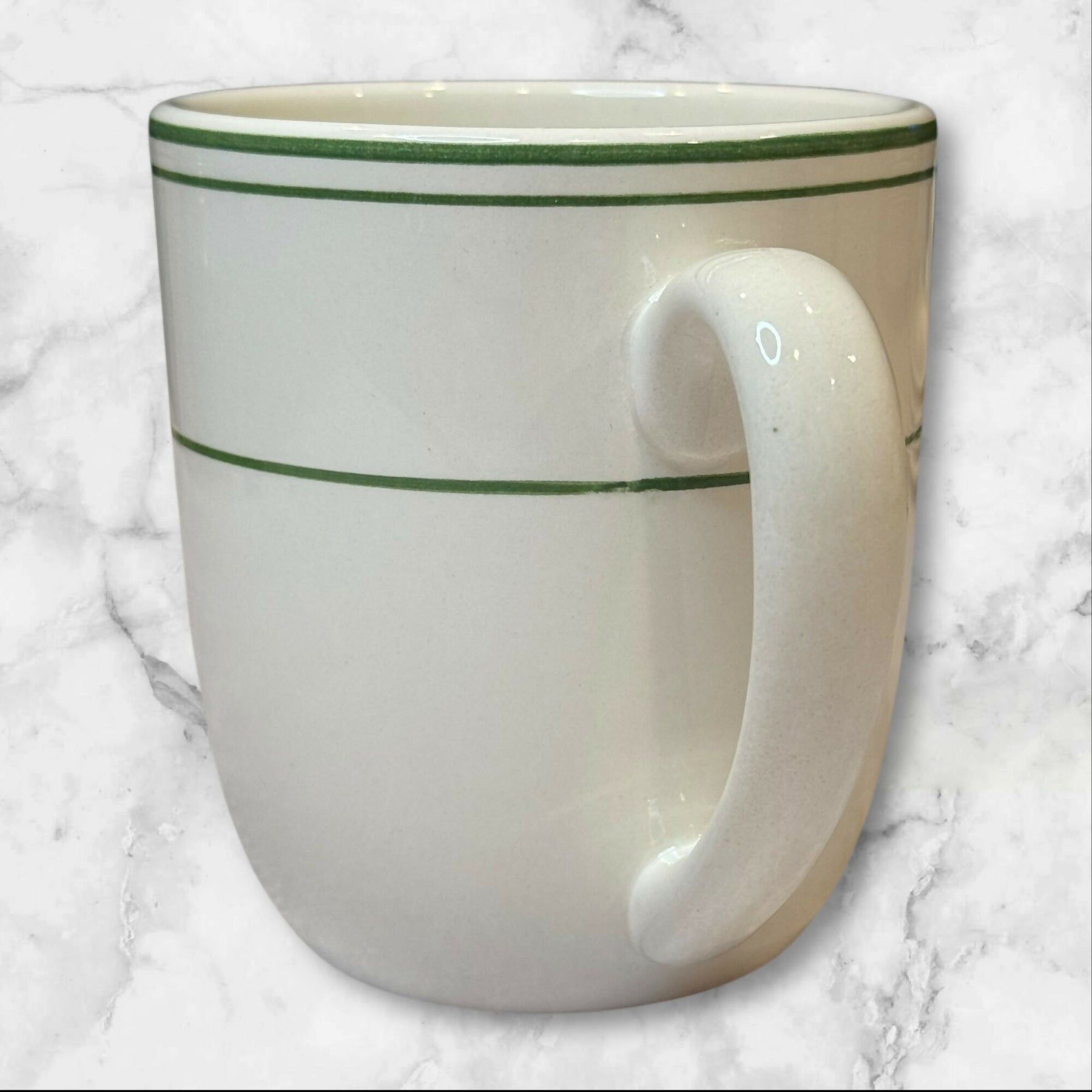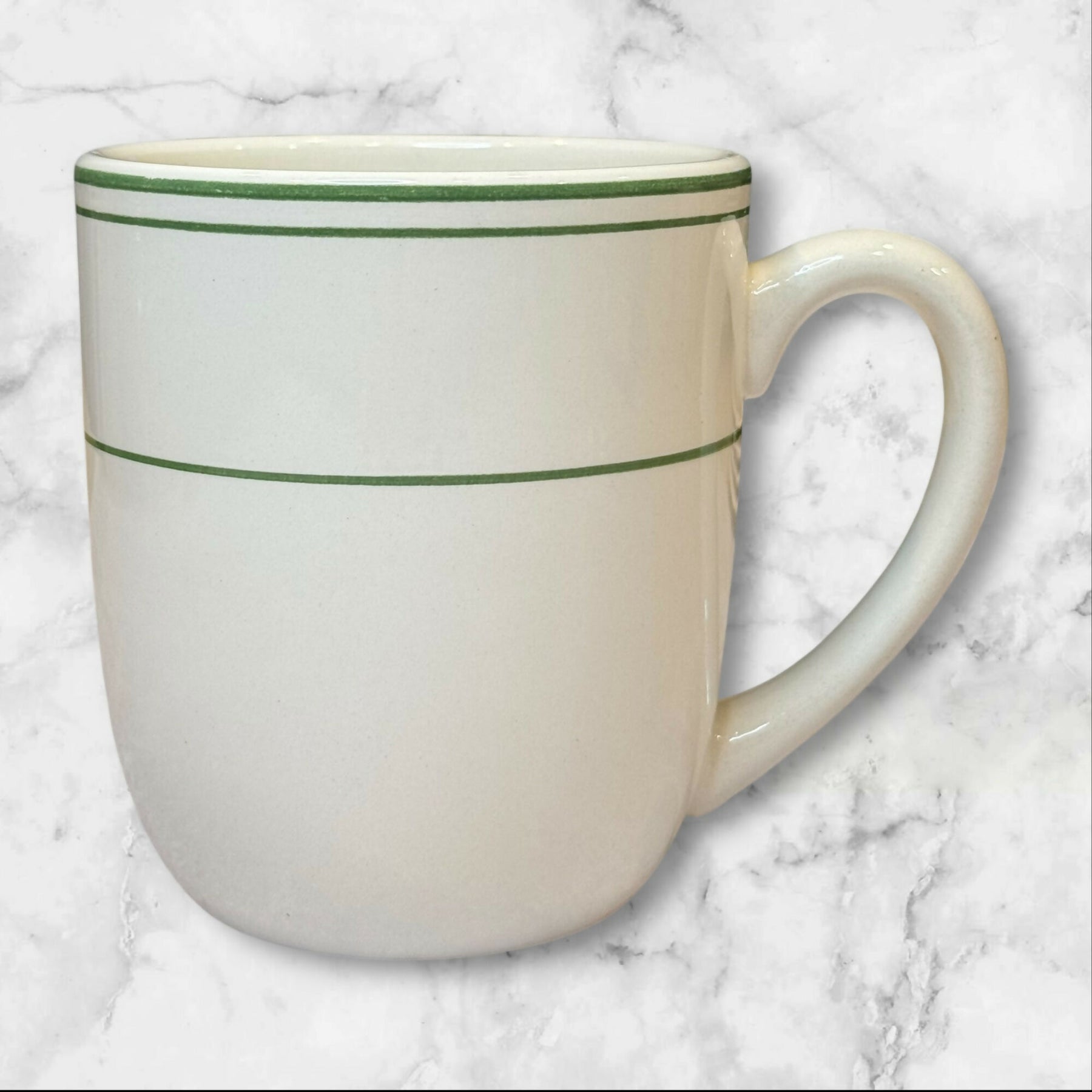 Bring timeless style to your morning coffee with this Pottery Barn Bistro mug. Crafted from durable stoneware, it features a classic ivory glaze with signature green rim stripes. Perfect for adding to an existing collection or enjoying as a stand-alone favorite.