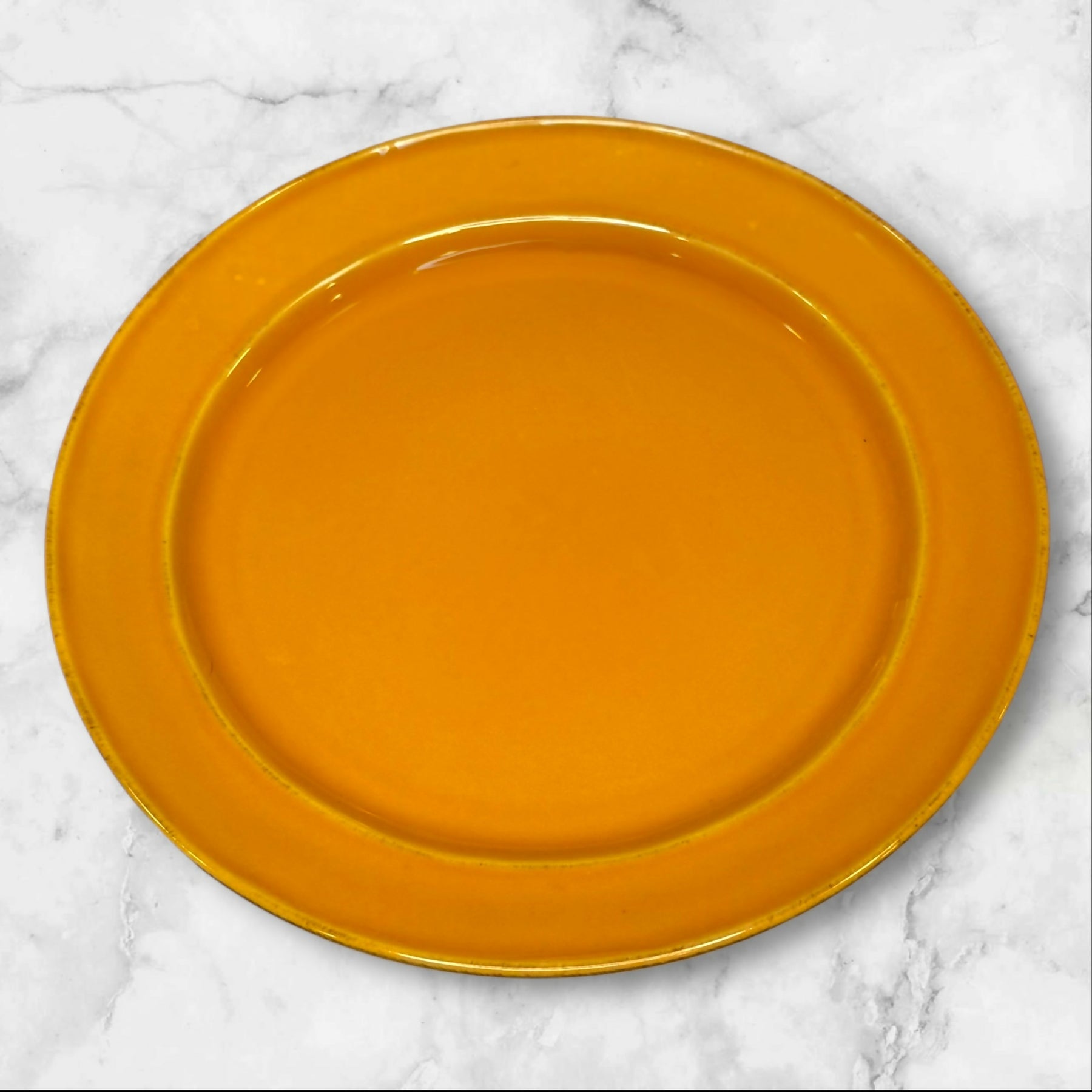 Replace or expand your dinnerware set with this single Pottery Barn Cambria Saffron dinner plate. Crafted in Portugal from durable stoneware, it features a rich golden glaze that adds warmth to any table. Discontinued and hard to find, this plate is perfect for completing your set or keeping as a spare. Microwave and dishwasher safe, it offers both timeless style and everyday practicality.