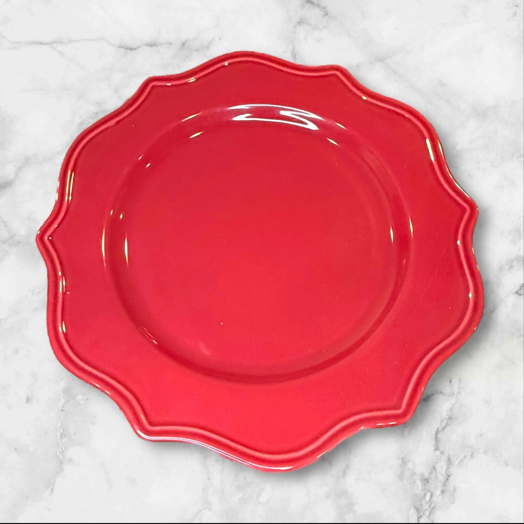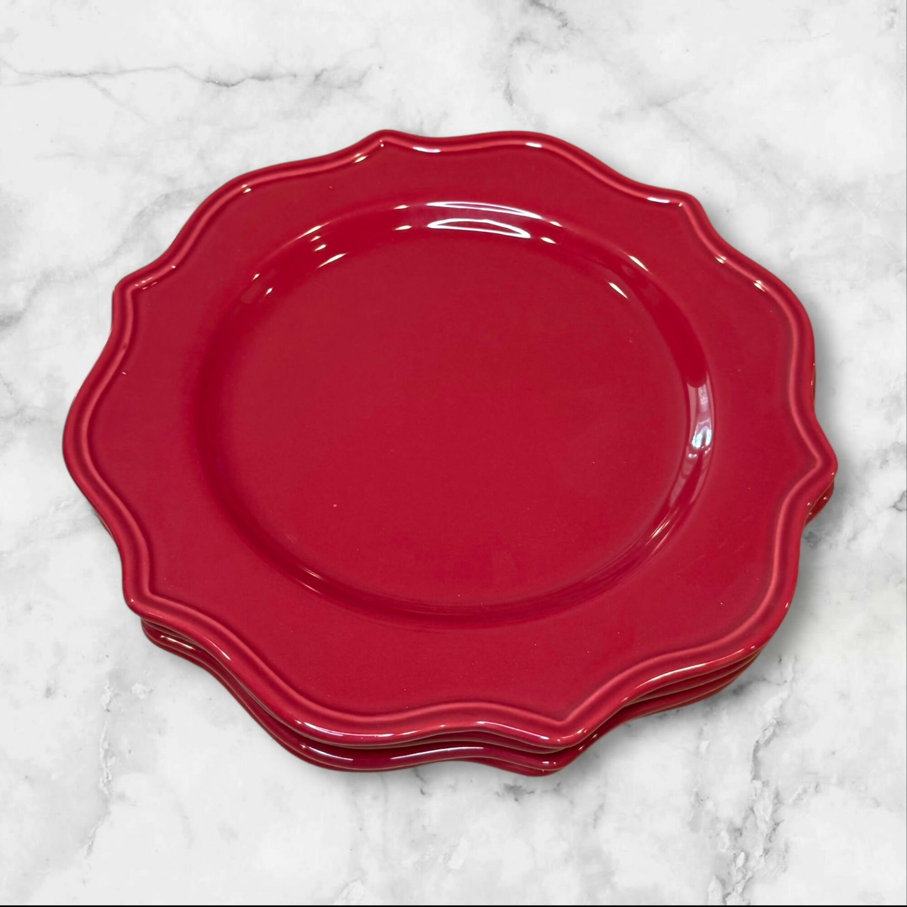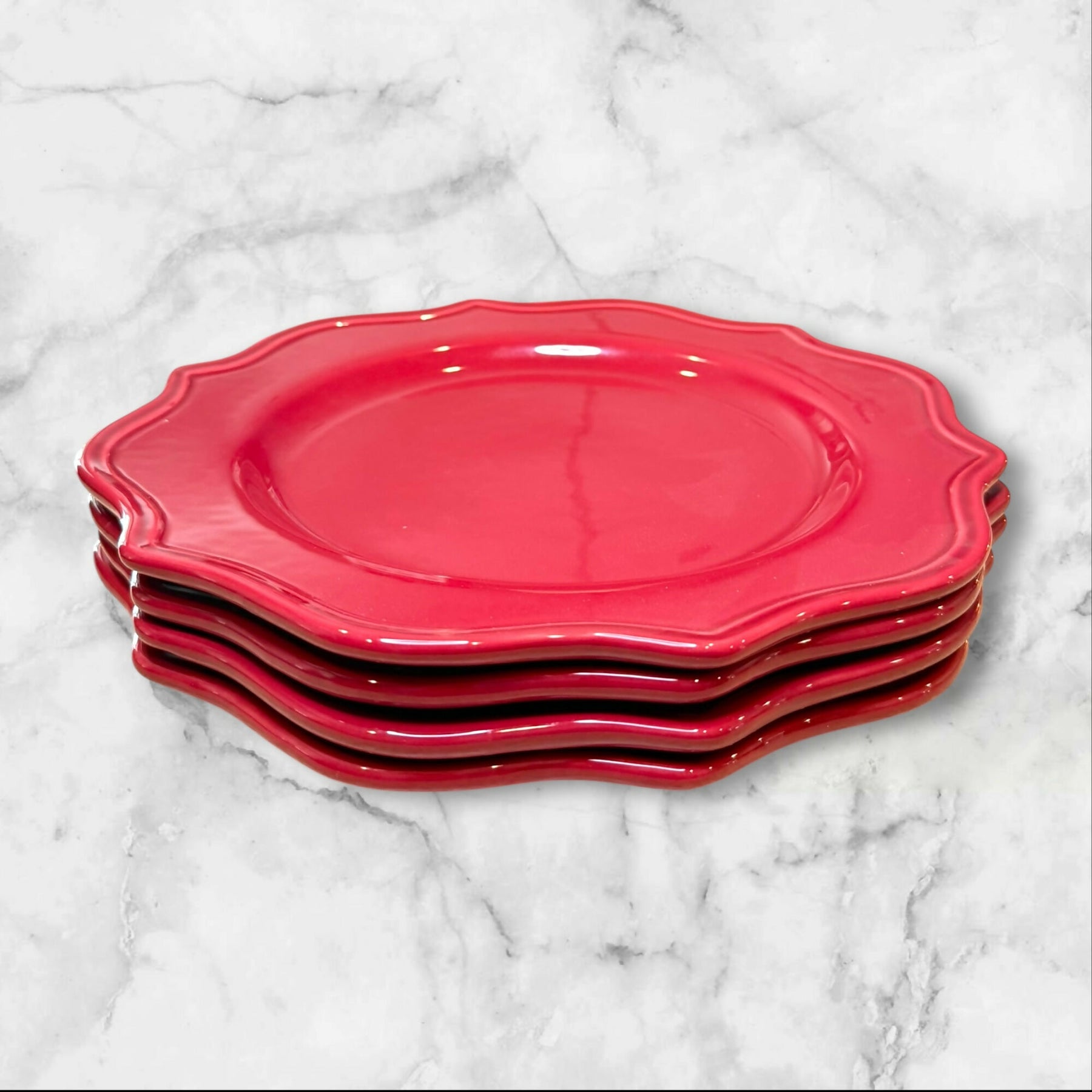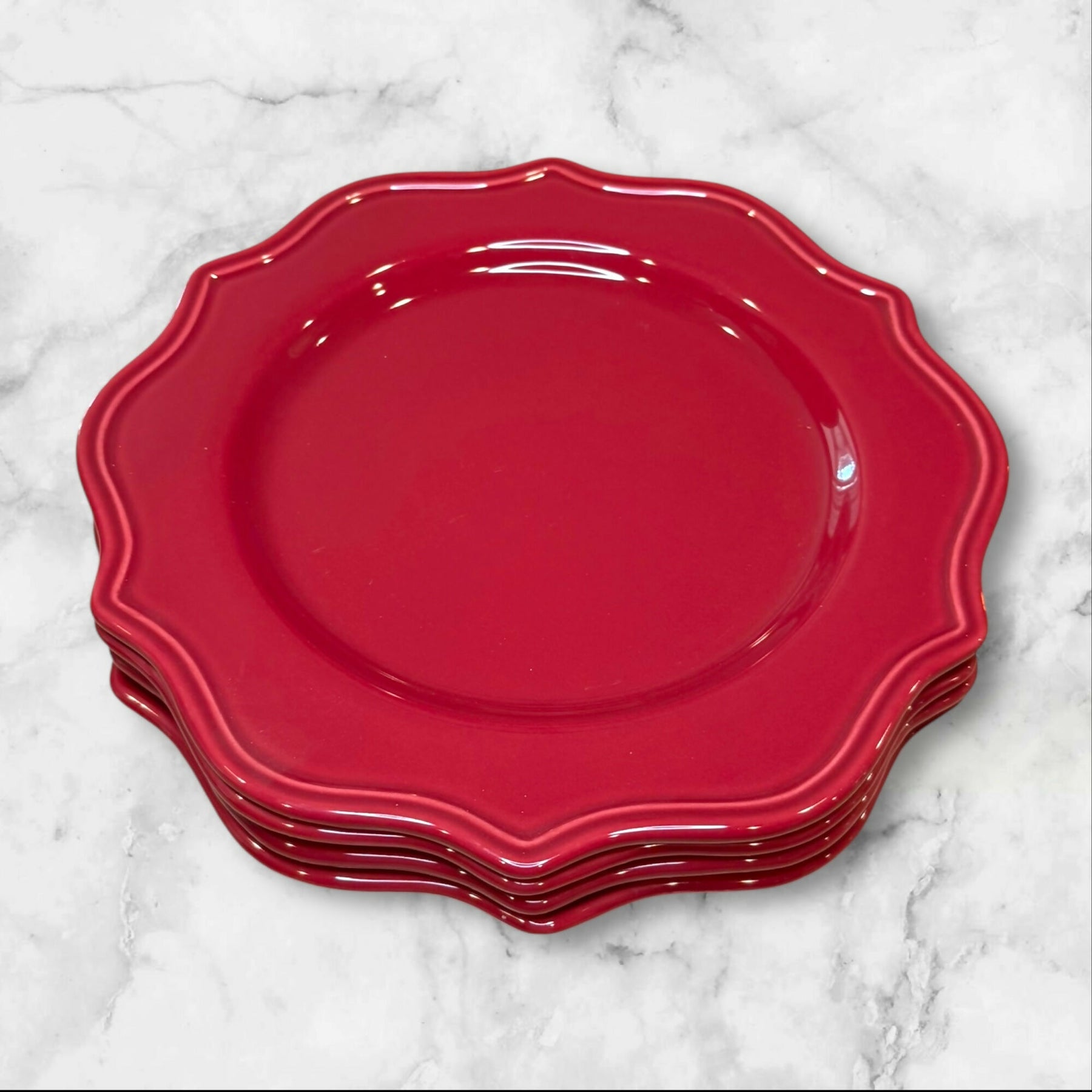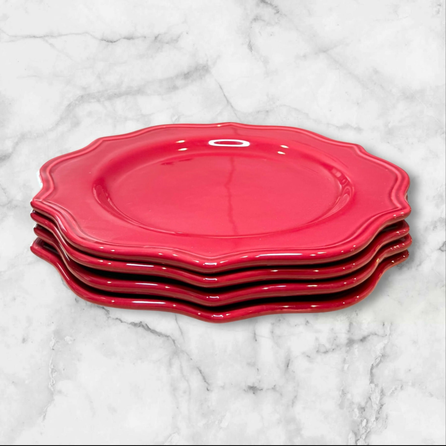 This set of 4 red scalloped-edge dinner plates by Sur La Table is both playful and practical. Made in Portugal, they show only light signs of use and are perfect for casual gatherings or daily meals.