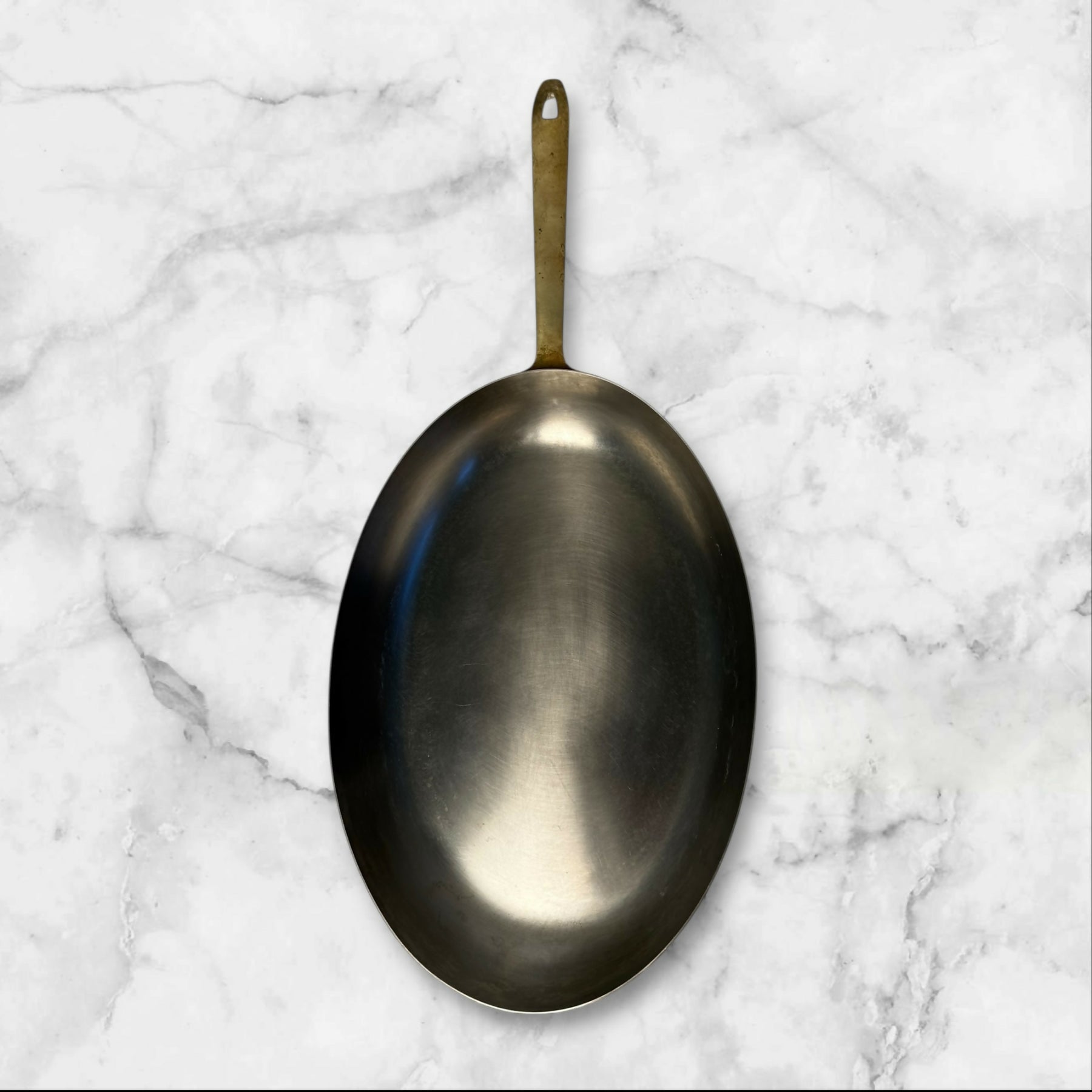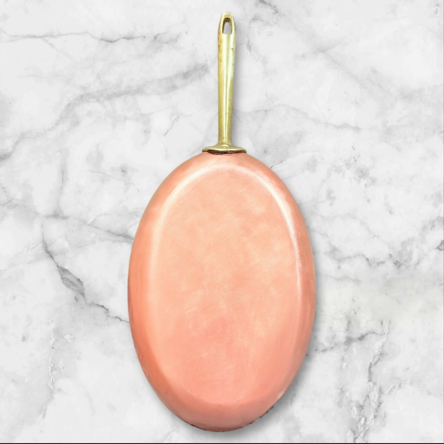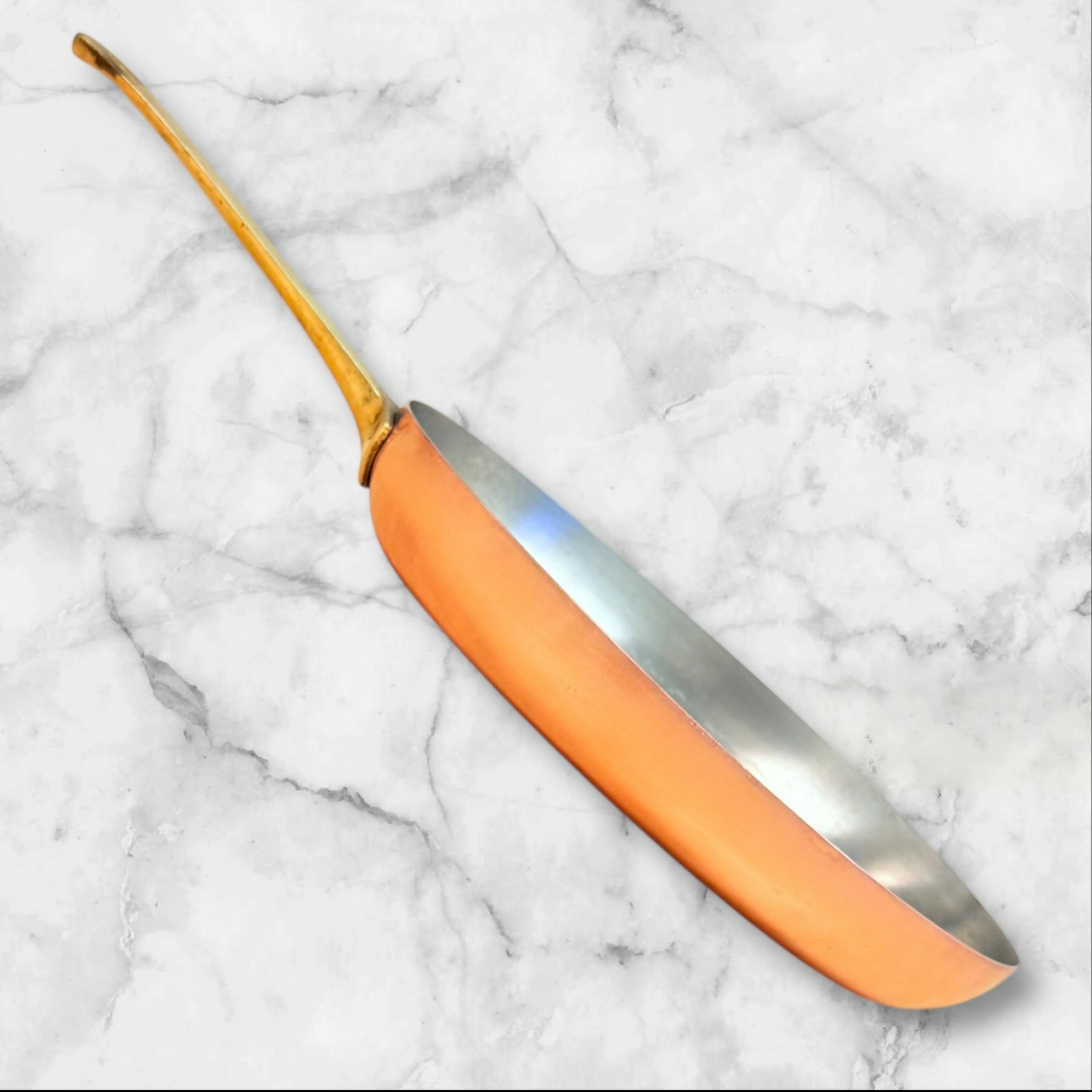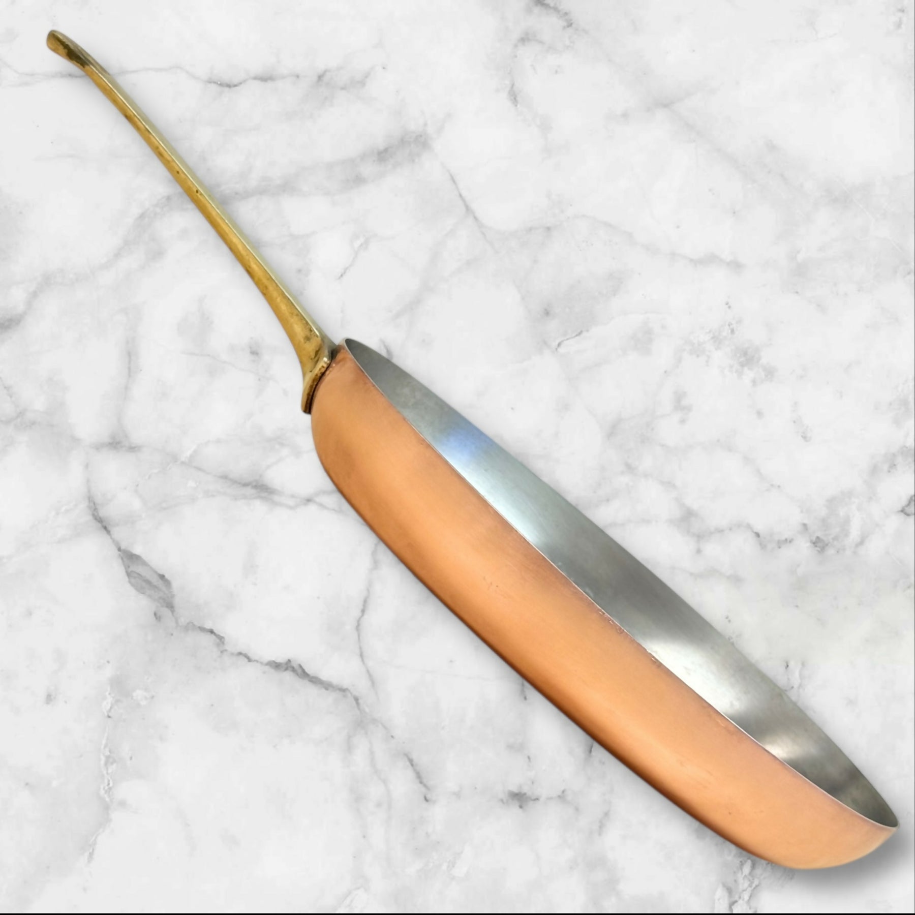 This vintage Paul Revere copper fish fry pan showcases exceptional craftsmanship with its signature oval shape, heavy-gauge copper body, and solid brass handle. Ideal for delicate fish, sautéing, or oven finishing, it offers superior heat responsiveness and classic American cookware styling. Its beautifully patinated interior and polished exterior make it as functional as it is collectible—an excellent piece for copper enthusiasts or everyday gourmet cooking.