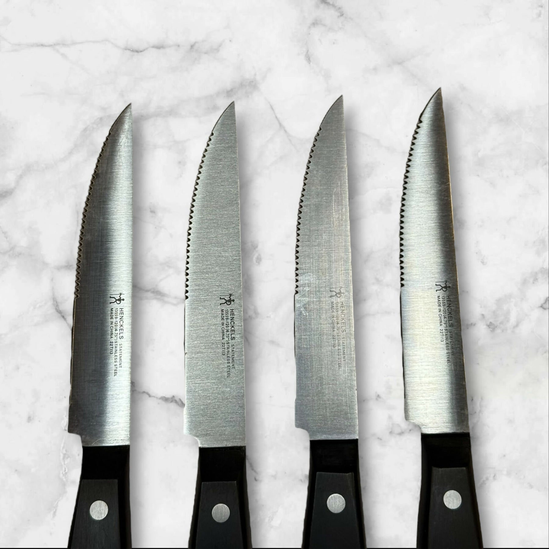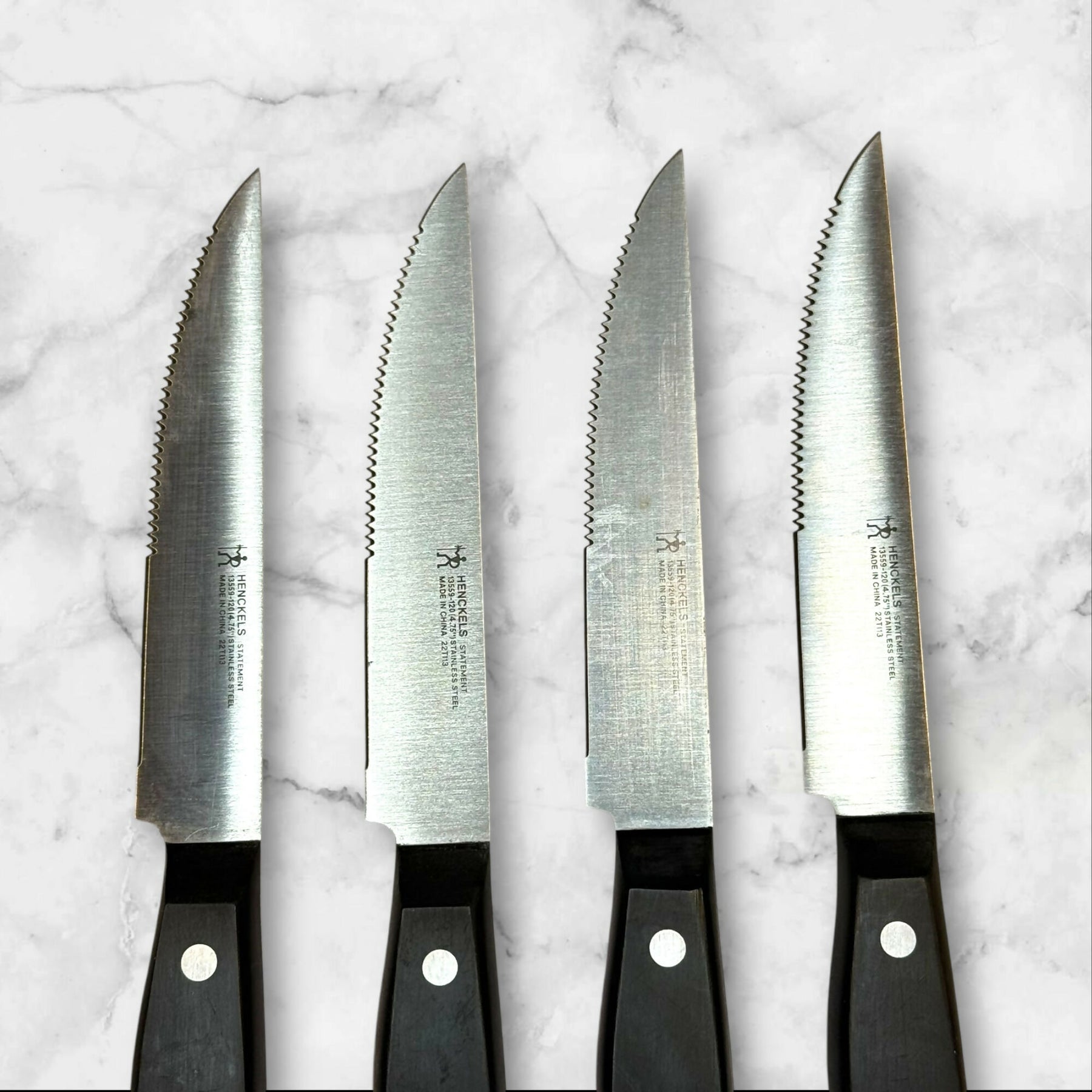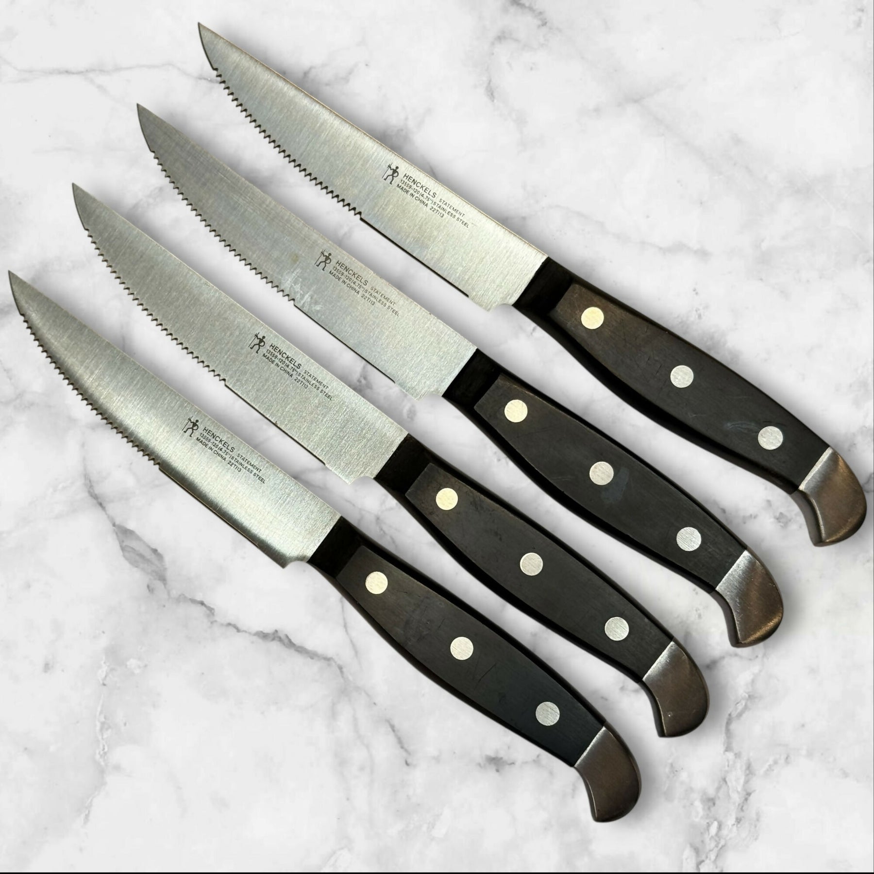 Enjoy precise cutting with this set of 4 Henckels Statement steak knives. Featuring 5-inch serrated stainless steel blades and durable black triple-riveted handles, these knives offer balance, comfort, and long-lasting sharpness. At 9 inches overall, they are perfectly sized for steaks, chops, or everyday dining. Crafted by Henckels, a trusted cutlery brand, this set is in great condition and ready to serve at your table.