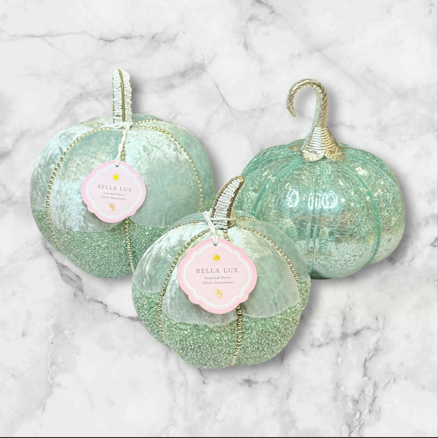 Add refined autumn elegance to your seasonal décor with this coordinated set of three decorative pumpkins. Featuring two Bella Lux velvet pumpkins with delicate beaded accents and one complementary teal crackle glass pumpkin, this curated trio blends soft texture with luminous glass for a balanced, designer-inspired look. Perfect for mantels, shelves, or tabletop displays, this set offers timeless fall style with versatile appeal.