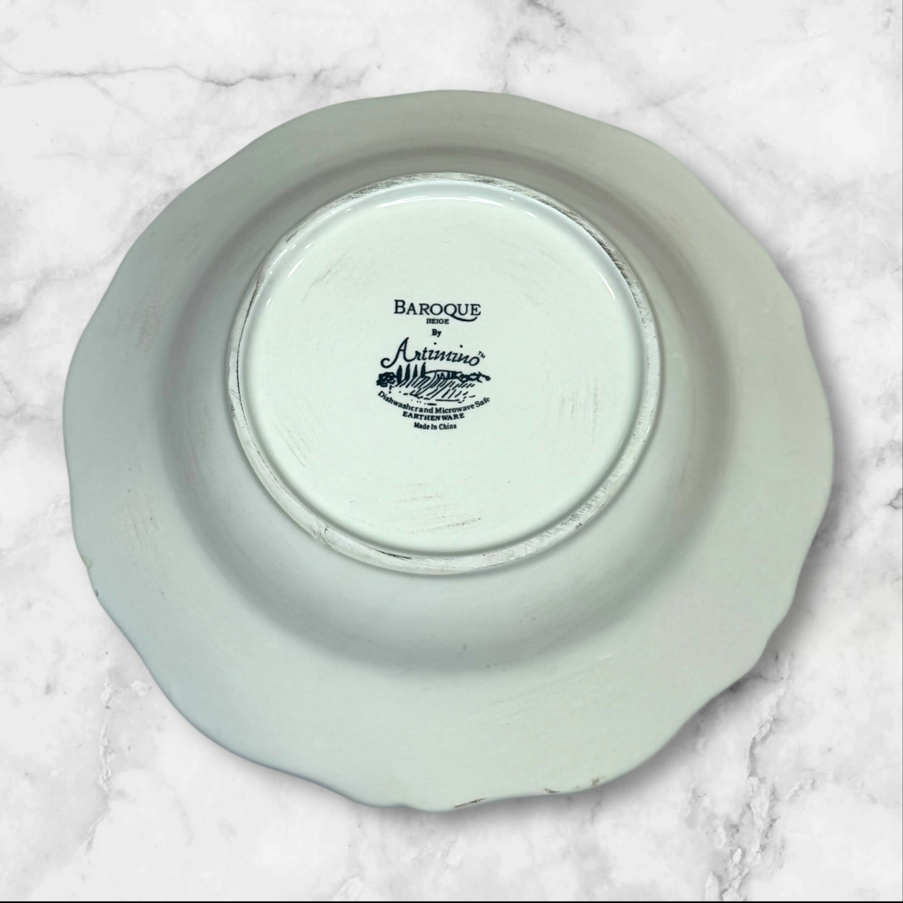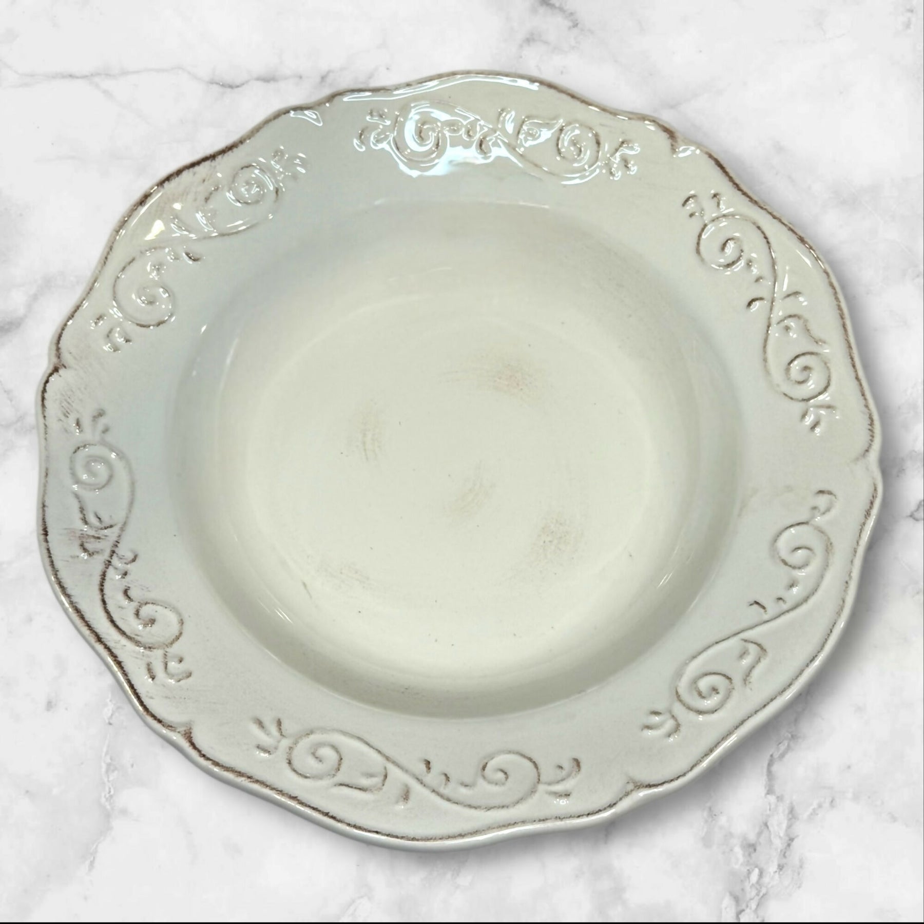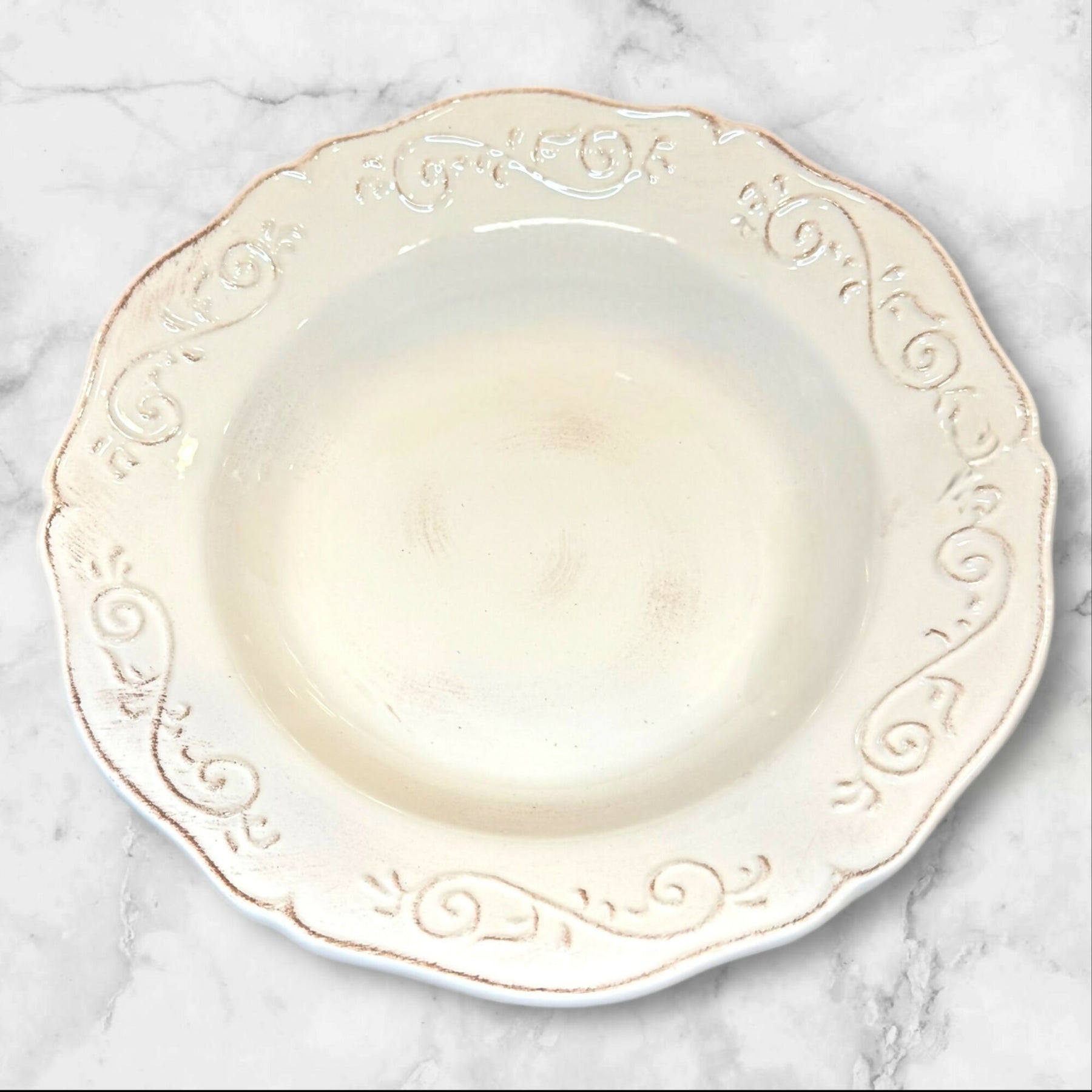 Add elegant charm to your table with this set of 4 Artimino Baroque Beige large rim soup bowls. Each piece features classic embossed scrollwork and a warm beige glaze for timeless appeal. Crafted from durable earthenware, these discontinued bowls are perfect for serving soups, salads, or pasta. All four are in great condition with minimal utensil wear — a beautiful addition to any table setting.