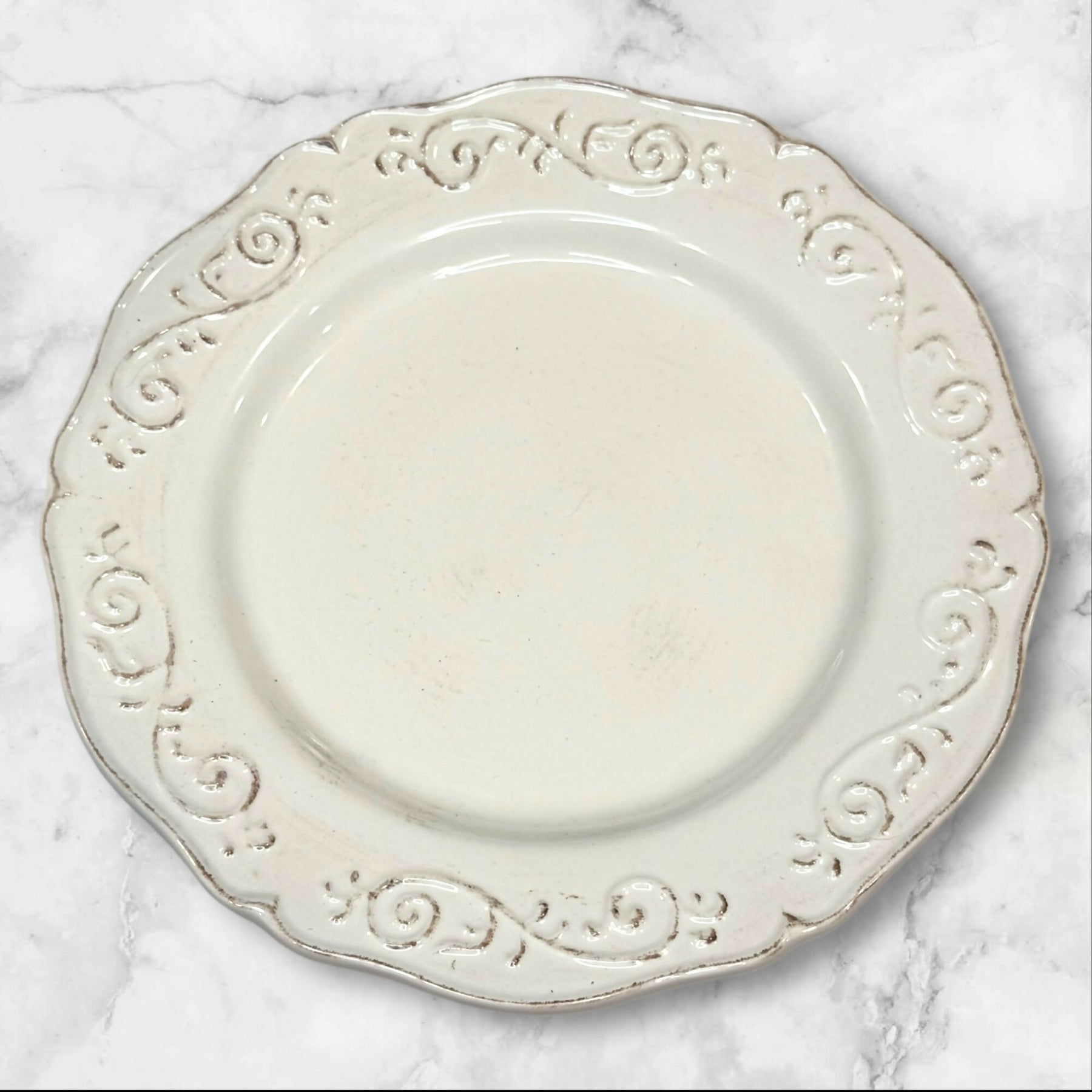 Enhance your table setting with this elegant set of 4 Artimino Baroque Beige salad plates. Featuring intricate embossed scroll detailing and a soft beige glaze, these discontinued earthenware plates bring timeless beauty to any occasion. Ideal for salads, desserts, or small entrées, they combine durability with vintage charm. All four plates are in great condition with minimal utensil wear — a lovely, classic addition to your collection.