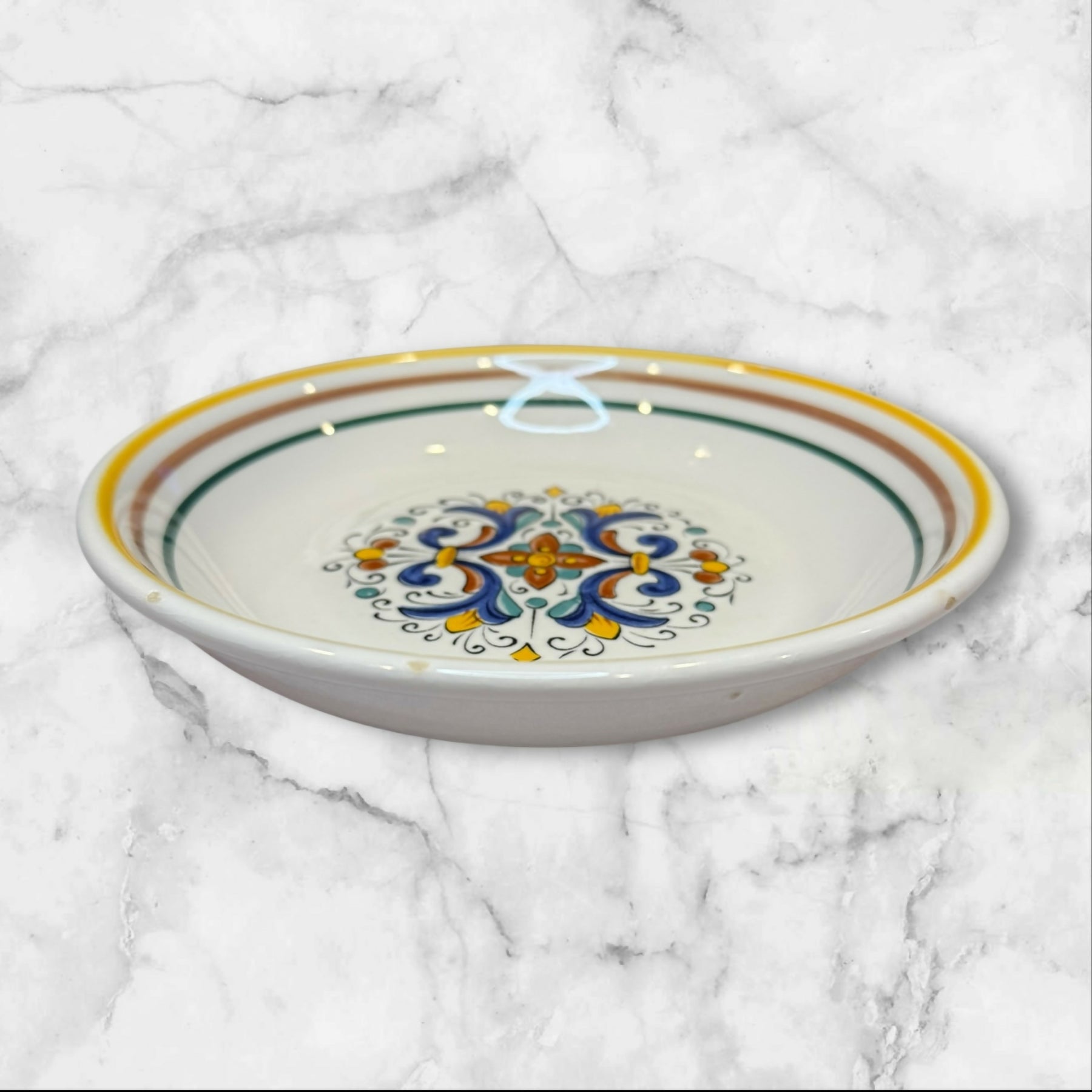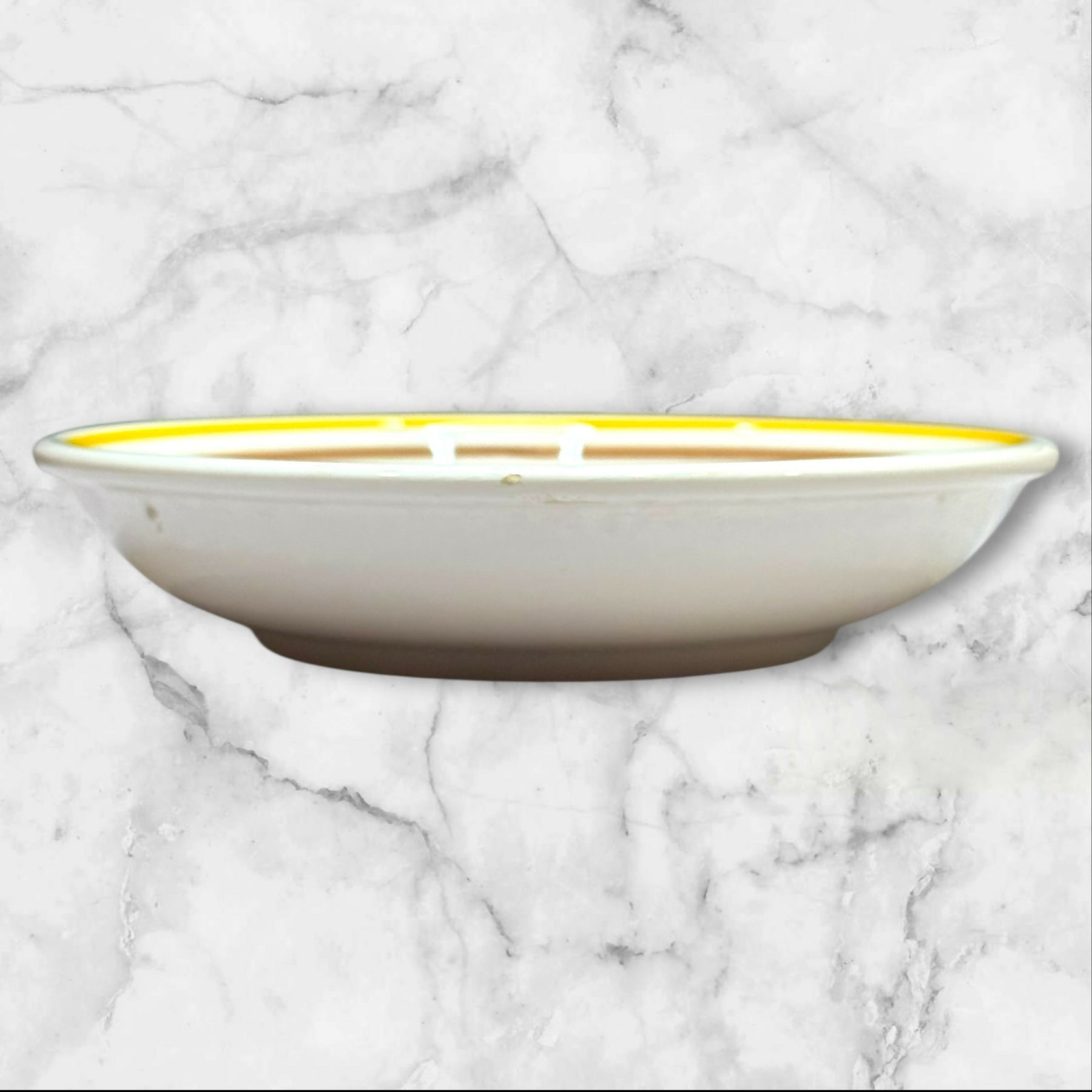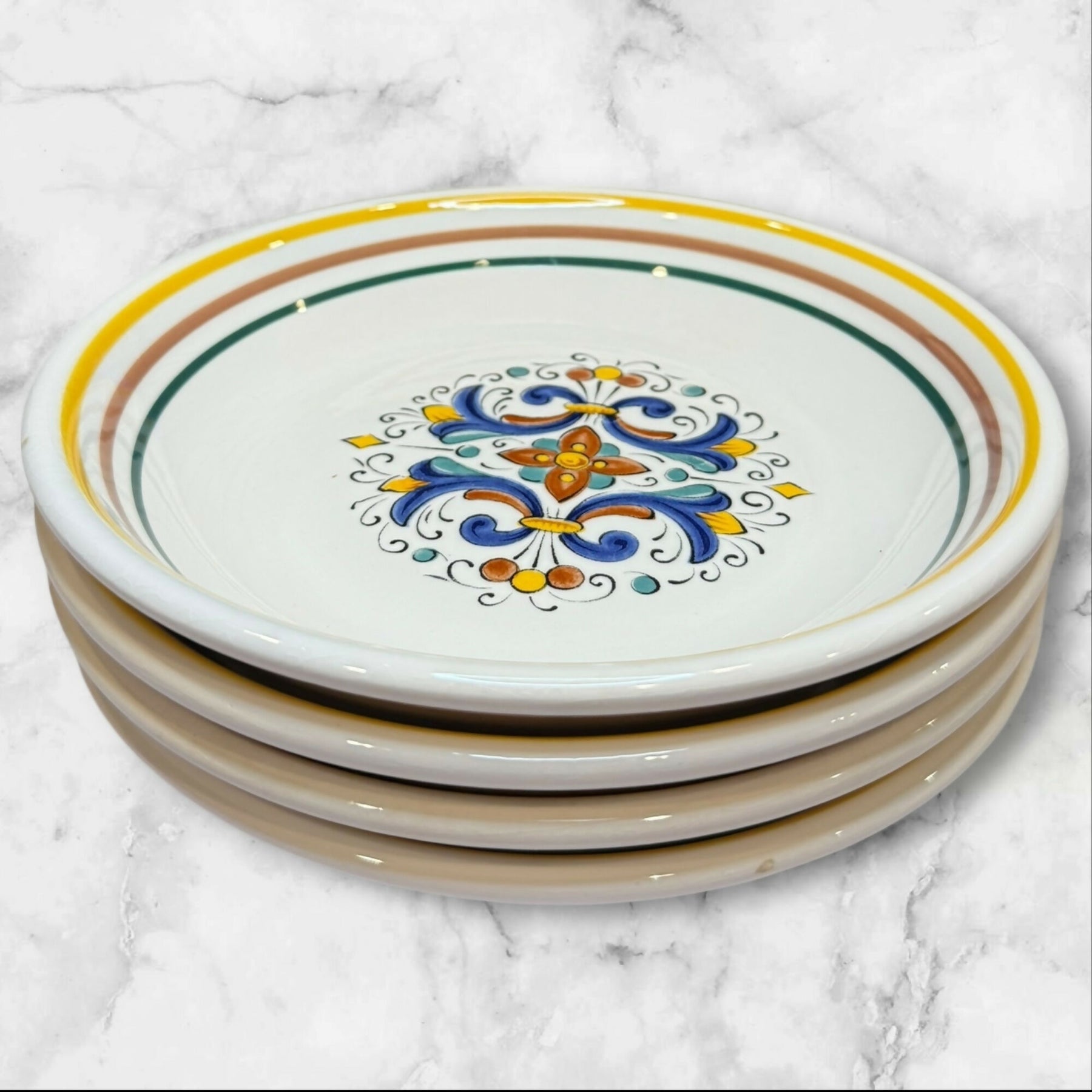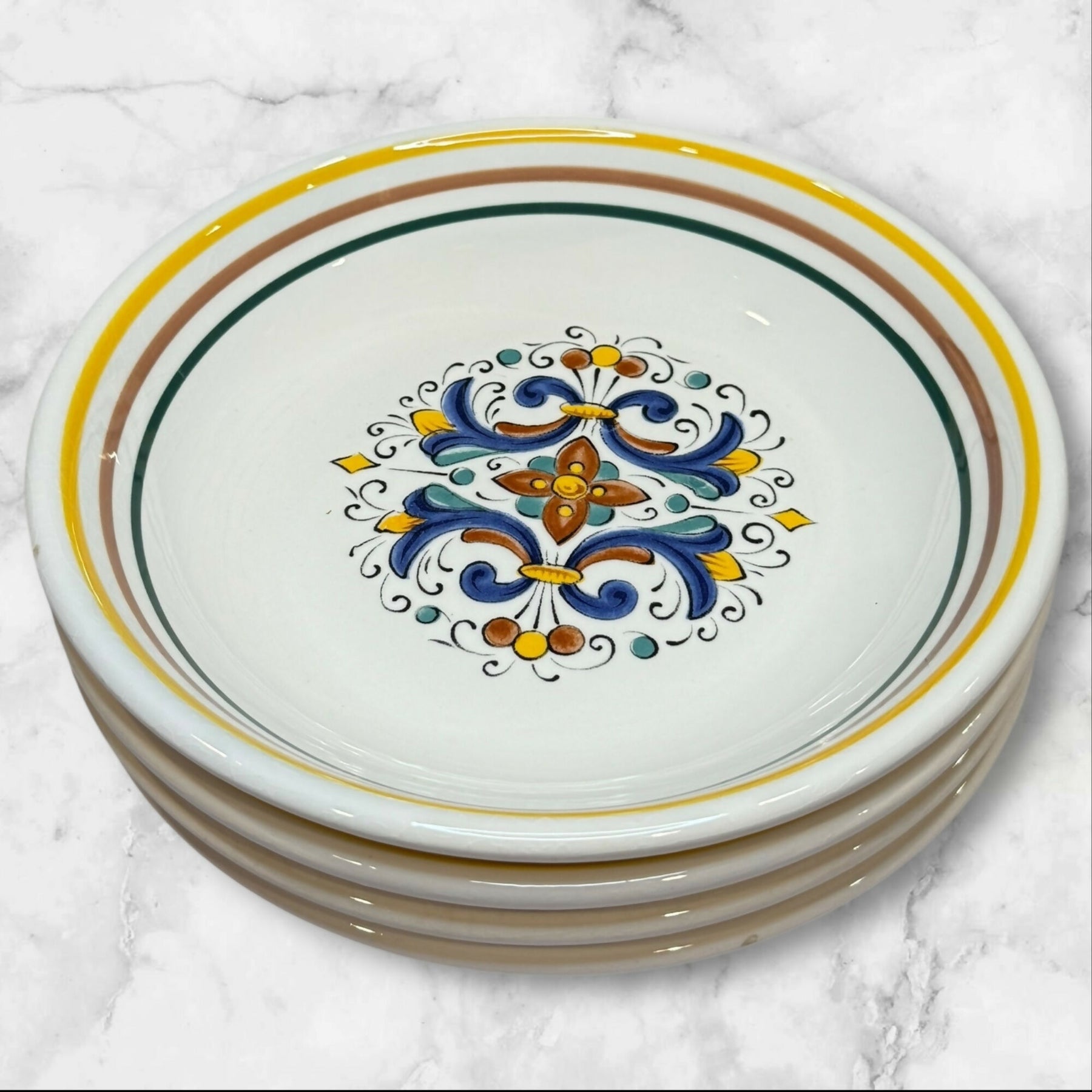 Add vibrant European charm to your table with this set of 4 Boston Warehouse BWA8 pasta bowls. Crafted in Italy, each piece showcases colorful hand-painted scrollwork and rich yellow, blue, and green bands. Perfect for serving pasta, salads, or hearty soups, these discontinued bowls offer artisan style and quality craftsmanship for everyday dining or display. A beautiful find for collectors of Italian ceramics.