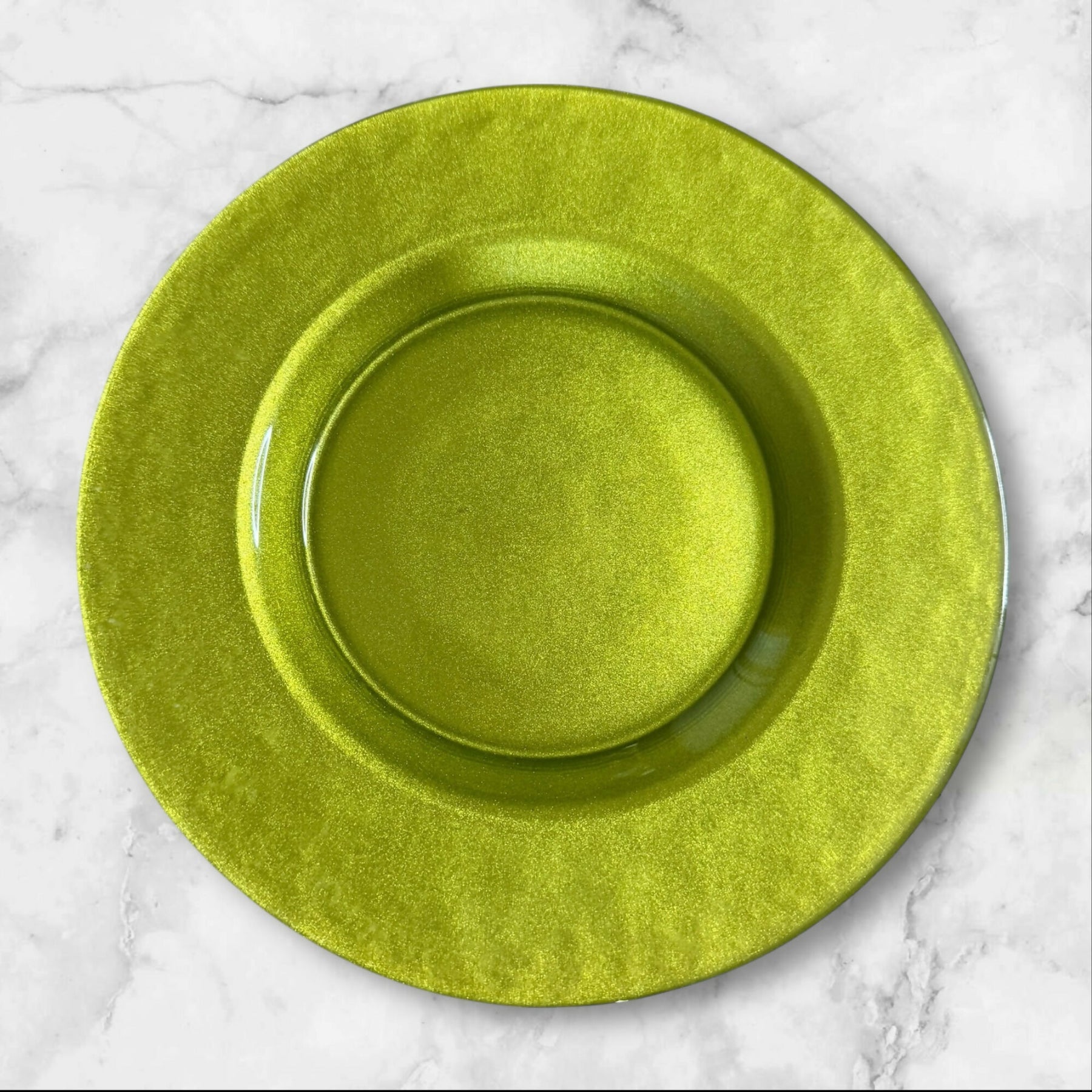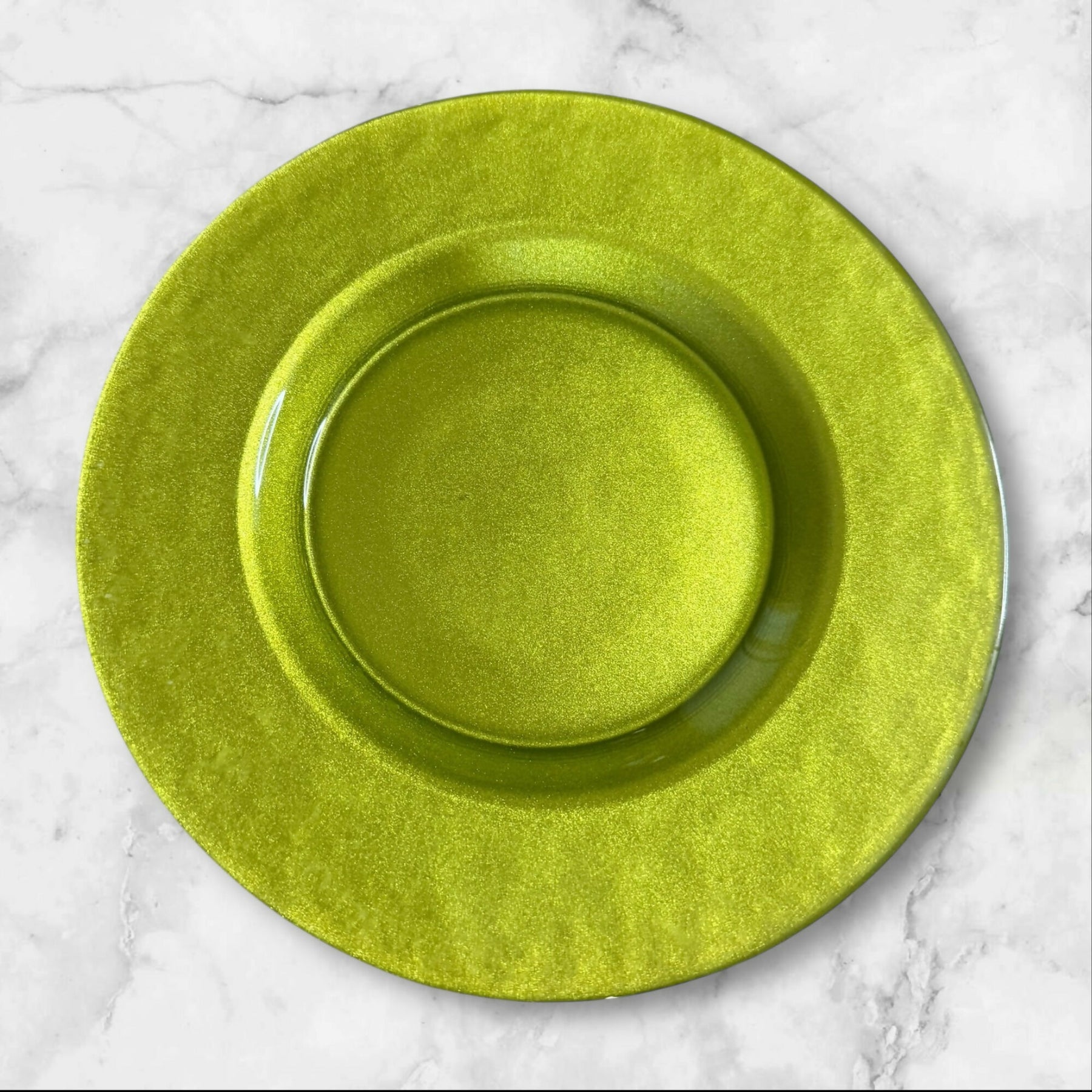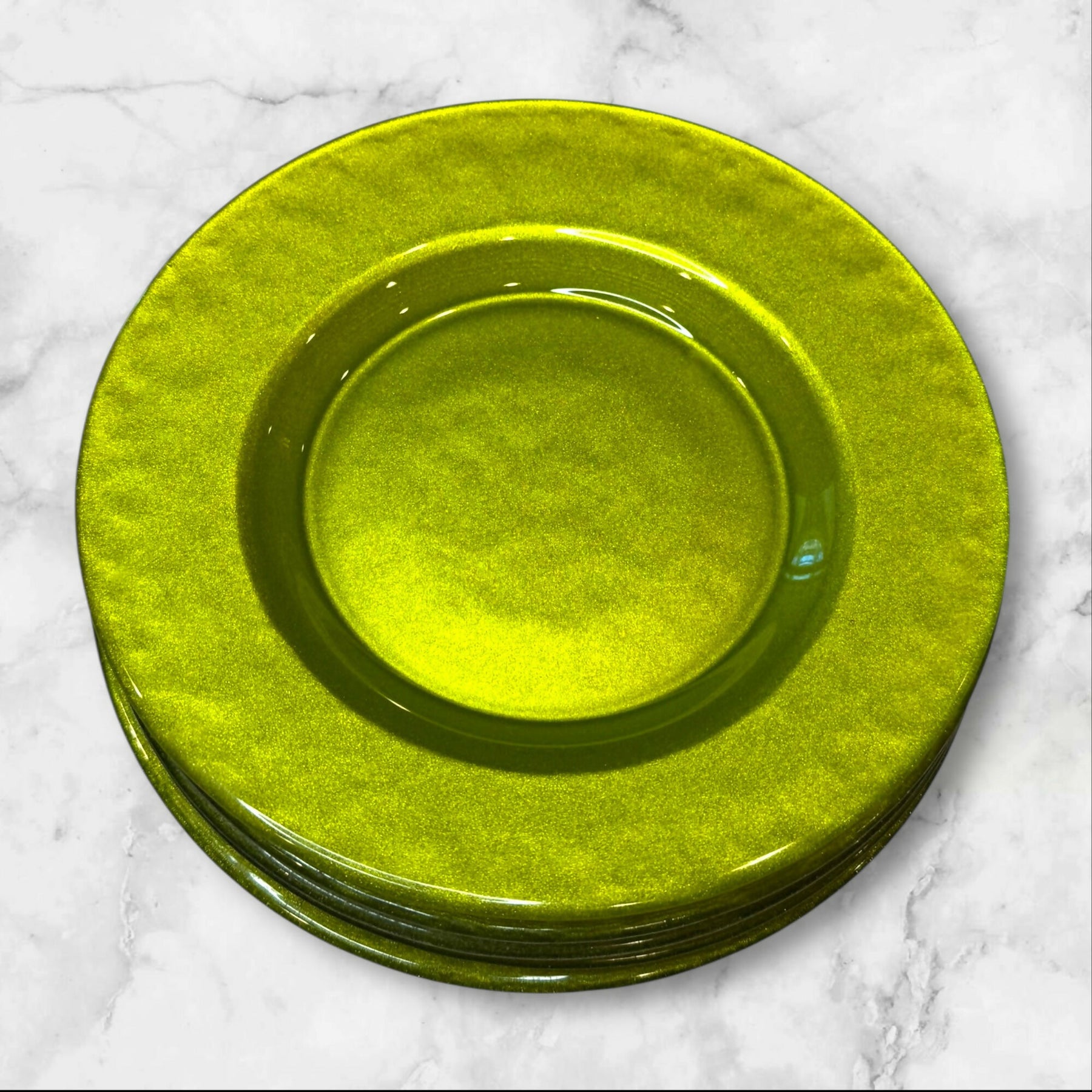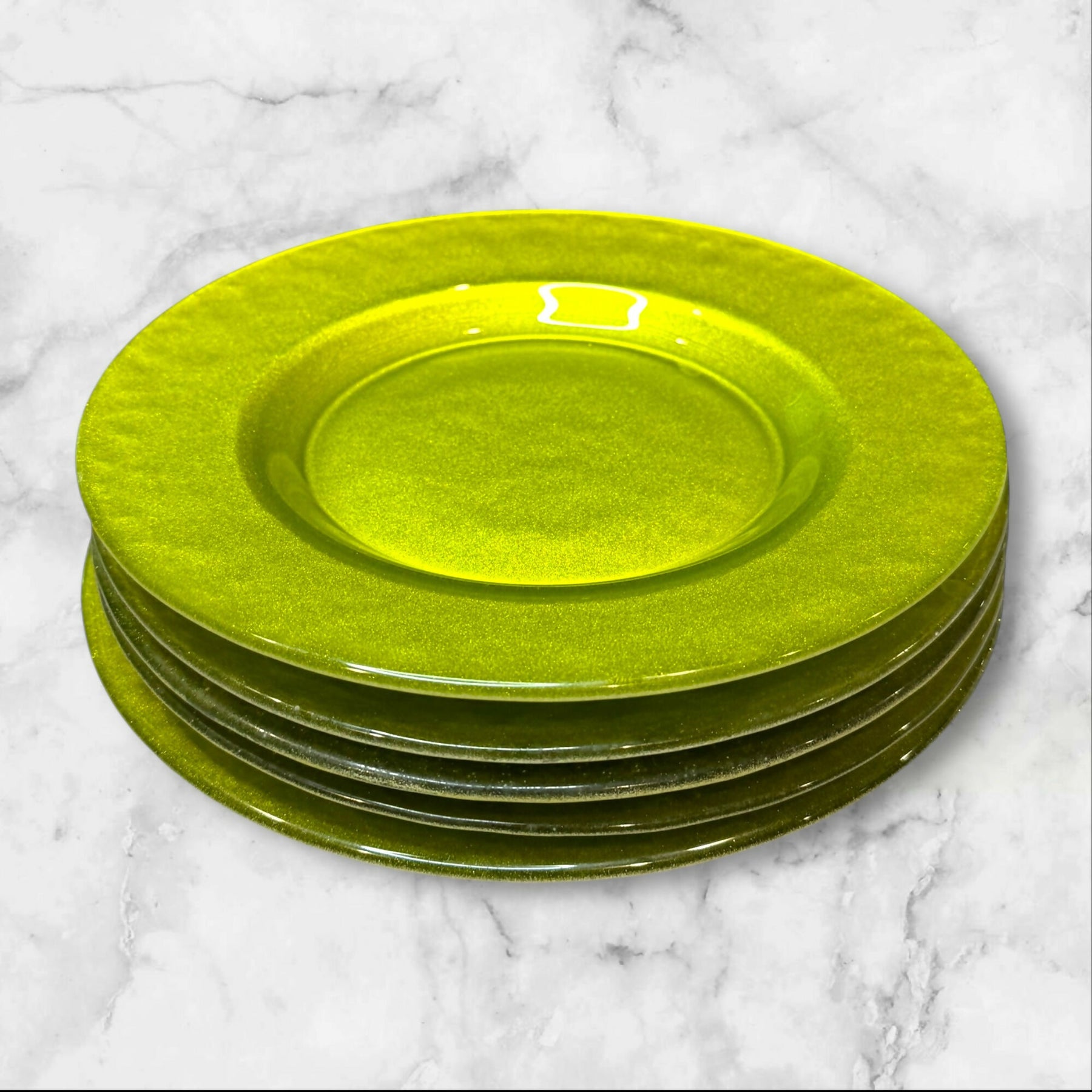 Add a vibrant pop of color to your table with this set of 5 green glass salad plates. Their subtle shimmer finish creates a striking presentation for salads, desserts, or appetizers. Perfect for everyday dining or entertaining, these plates bring a touch of modern elegance and eco-conscious charm to any table setting. Beautifully crafted and well cared for, they’re ready to elevate your dining experience.