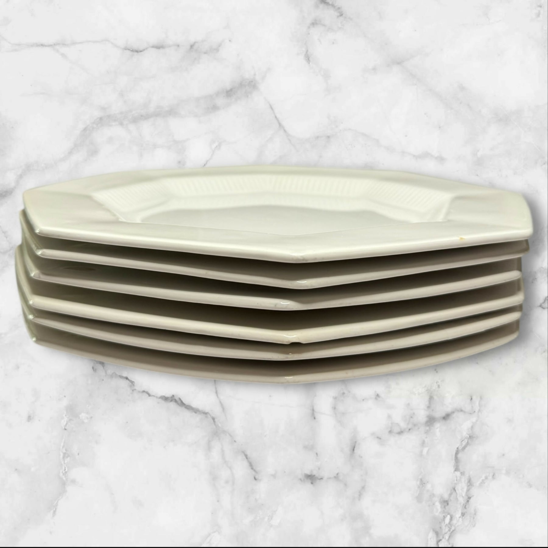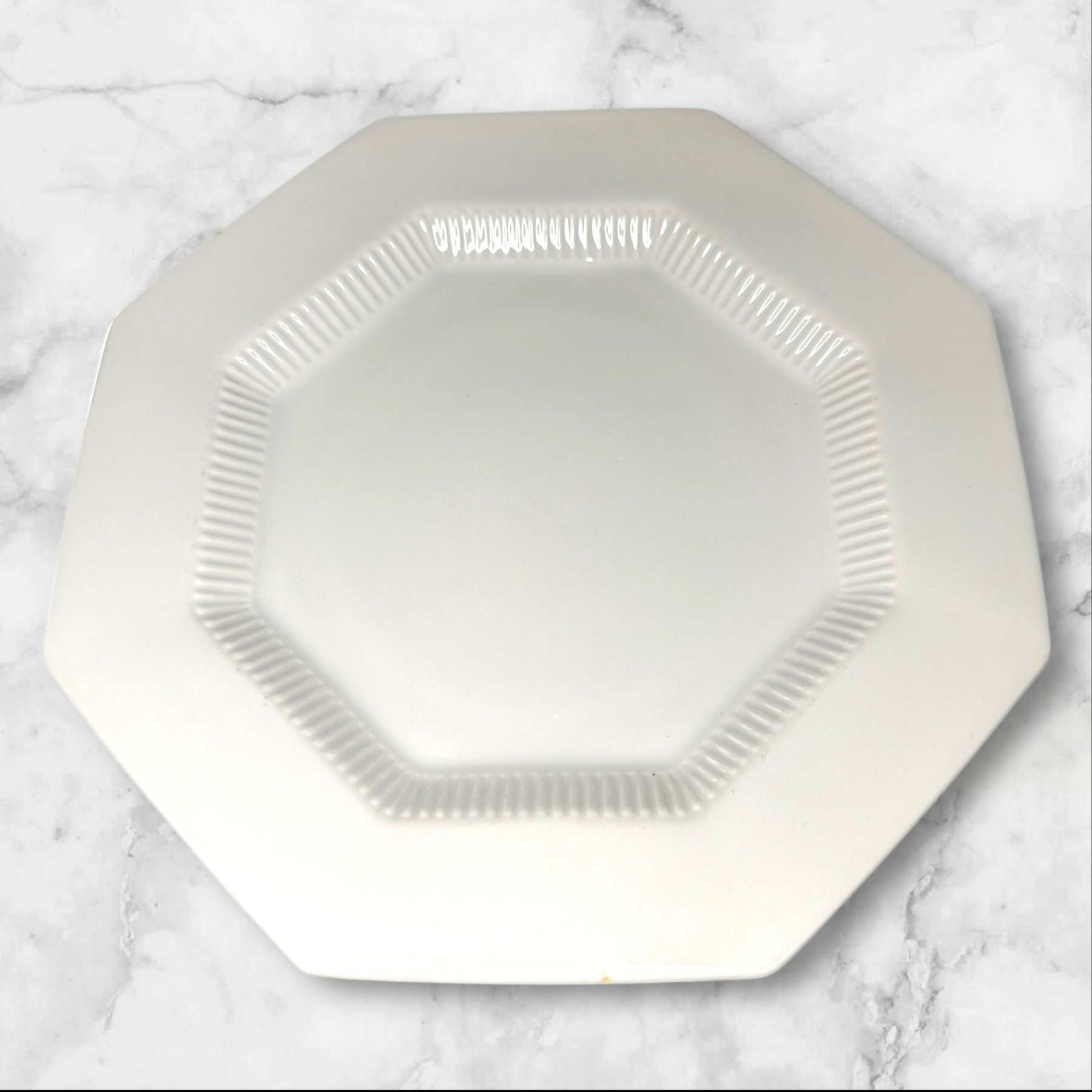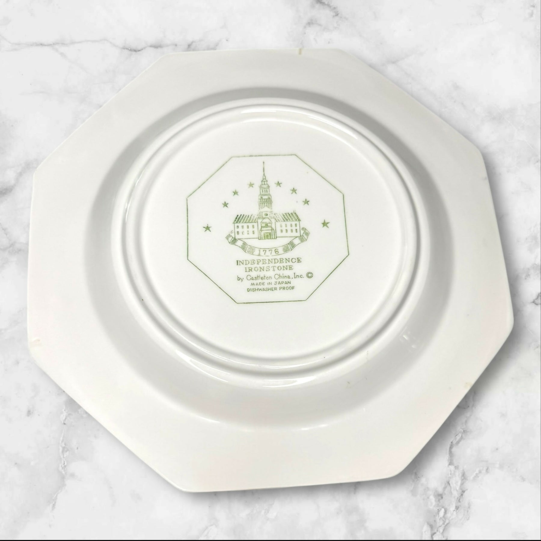 Timeless and elegant, this set of 6 Independence White dinner plates is crafted from durable ironstone in Japan. Featuring a crisp white glaze and octagonal shape, these discontinued plates add vintage charm to any table. Two plates have small chips on the bottom, and one shows crazing and light discoloration. Remaining plates are in good condition—perfect for collectors or everyday use.