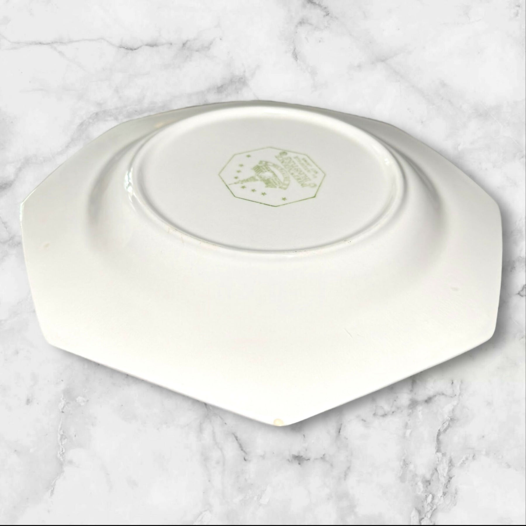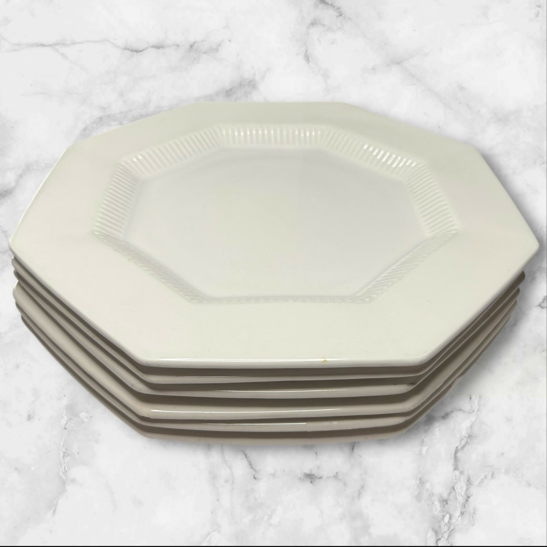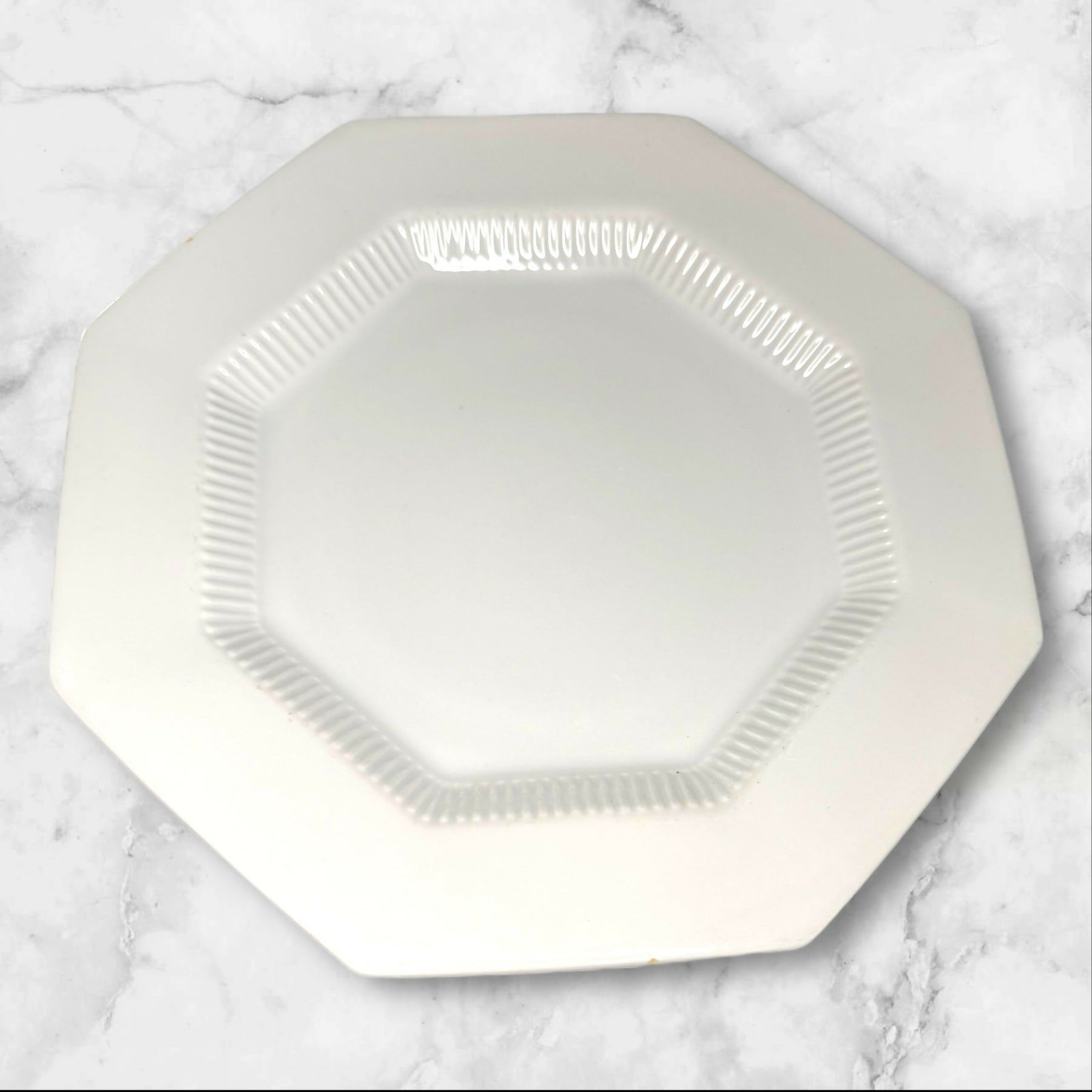 Timeless and elegant, this set of 6 Independence White dinner plates is crafted from durable ironstone in Japan. Featuring a crisp white glaze and octagonal shape, these discontinued plates add vintage charm to any table. Two plates have small chips on the bottom, and one shows crazing and light discoloration. Remaining plates are in good condition—perfect for collectors or everyday use.