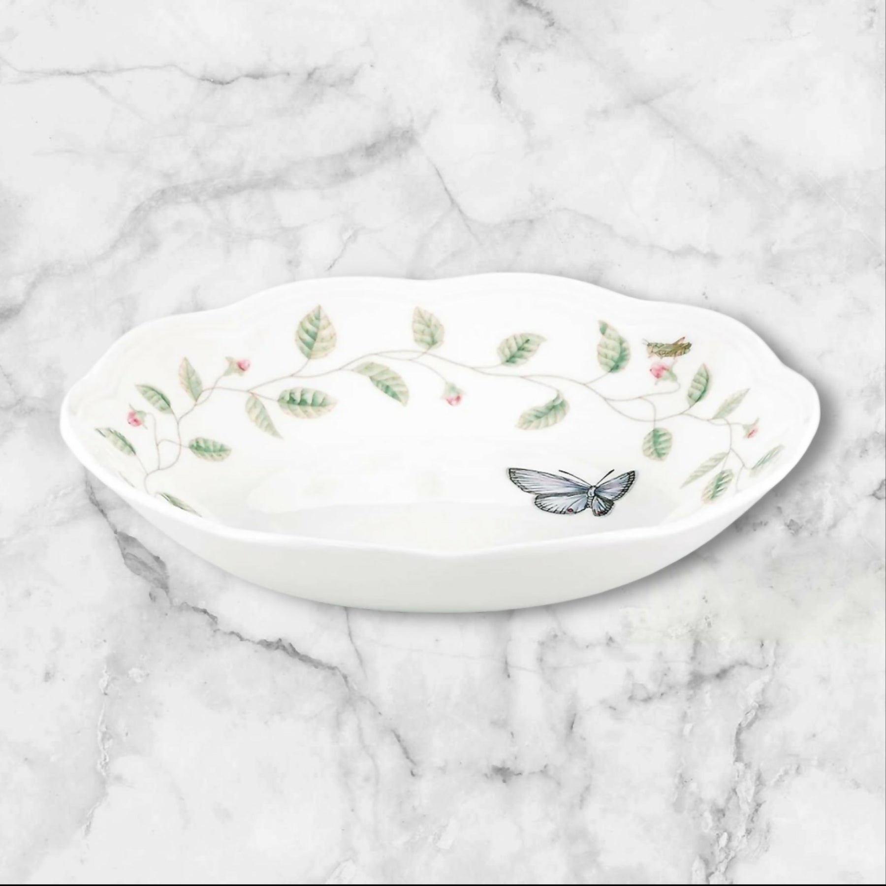 Bring the beauty of nature to your table with this set of six Lenox Butterfly Meadow bowls. Featuring soft blue butterflies and floral accents on a scalloped rim, each 20-ounce porcelain bowl captures timeless charm and elegance. Perfect for soups, salads, or pasta, they’re durable and dishwasher safe. In excellent pre-owned condition with only minor utensil marks and no chips, cracks, or stains.