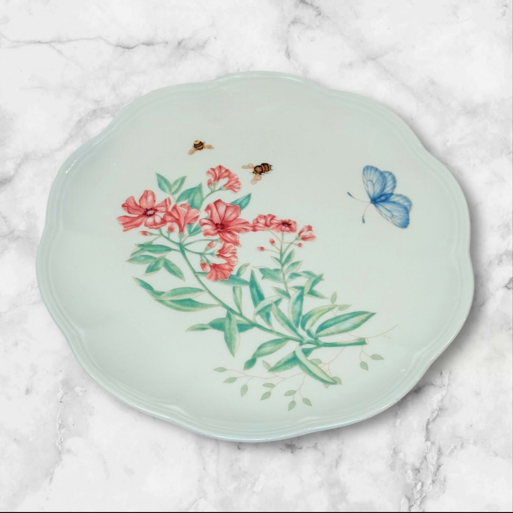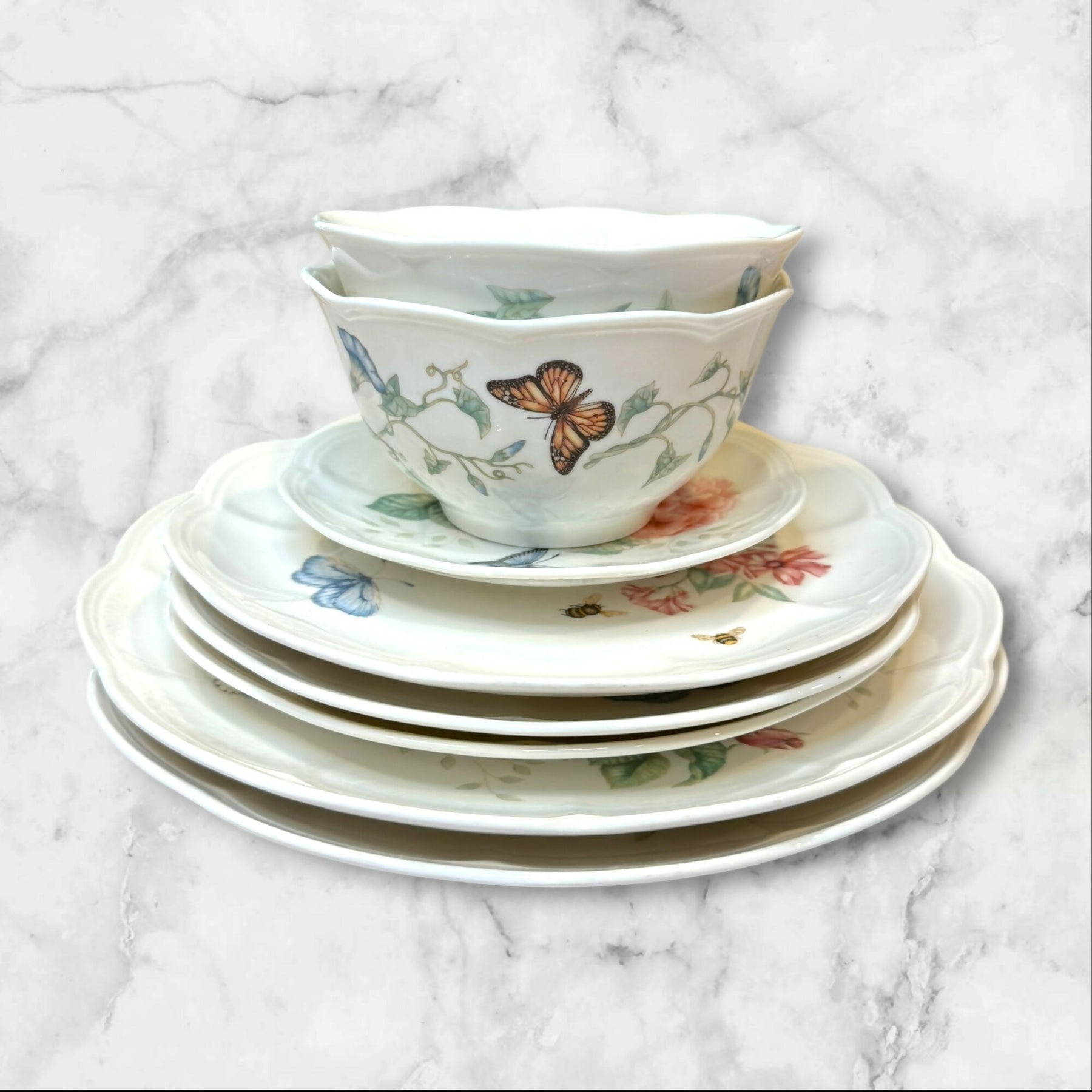 Bring the charm of nature to your table with this 8-piece Lenox Butterfly Meadow dinnerware set. Featuring detailed butterfly, dragonfly, and floral motifs by Louise Le Luyer, each piece showcases Lenox’s signature scalloped edge and fine porcelain craftsmanship. This mixed assortment includes bowls, salad, and dinner plates — all in excellent, gently used condition, perfect for everyday or special occasions.