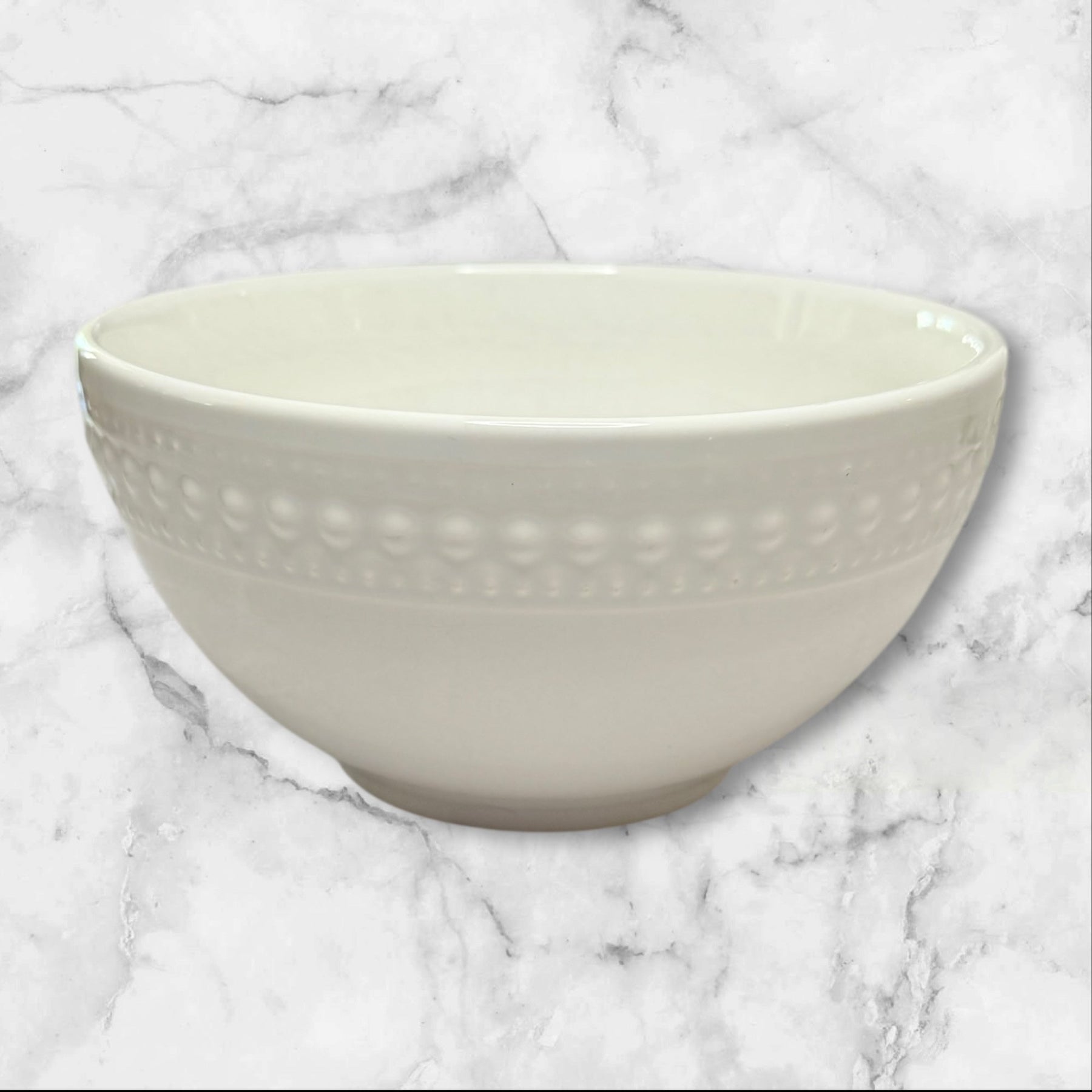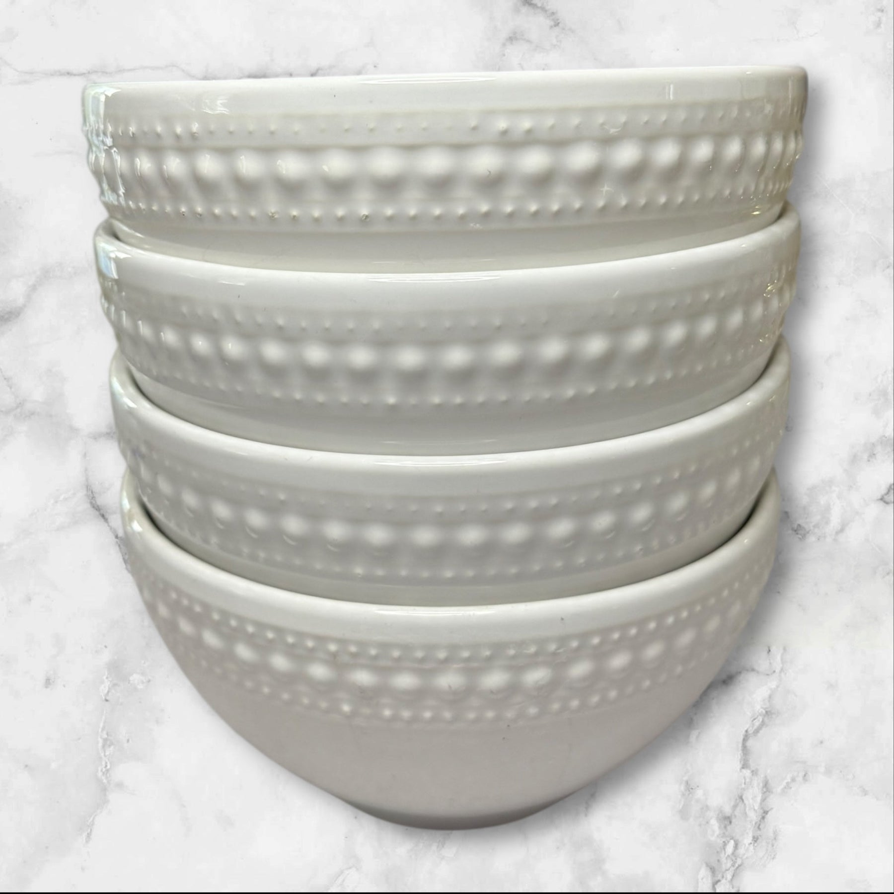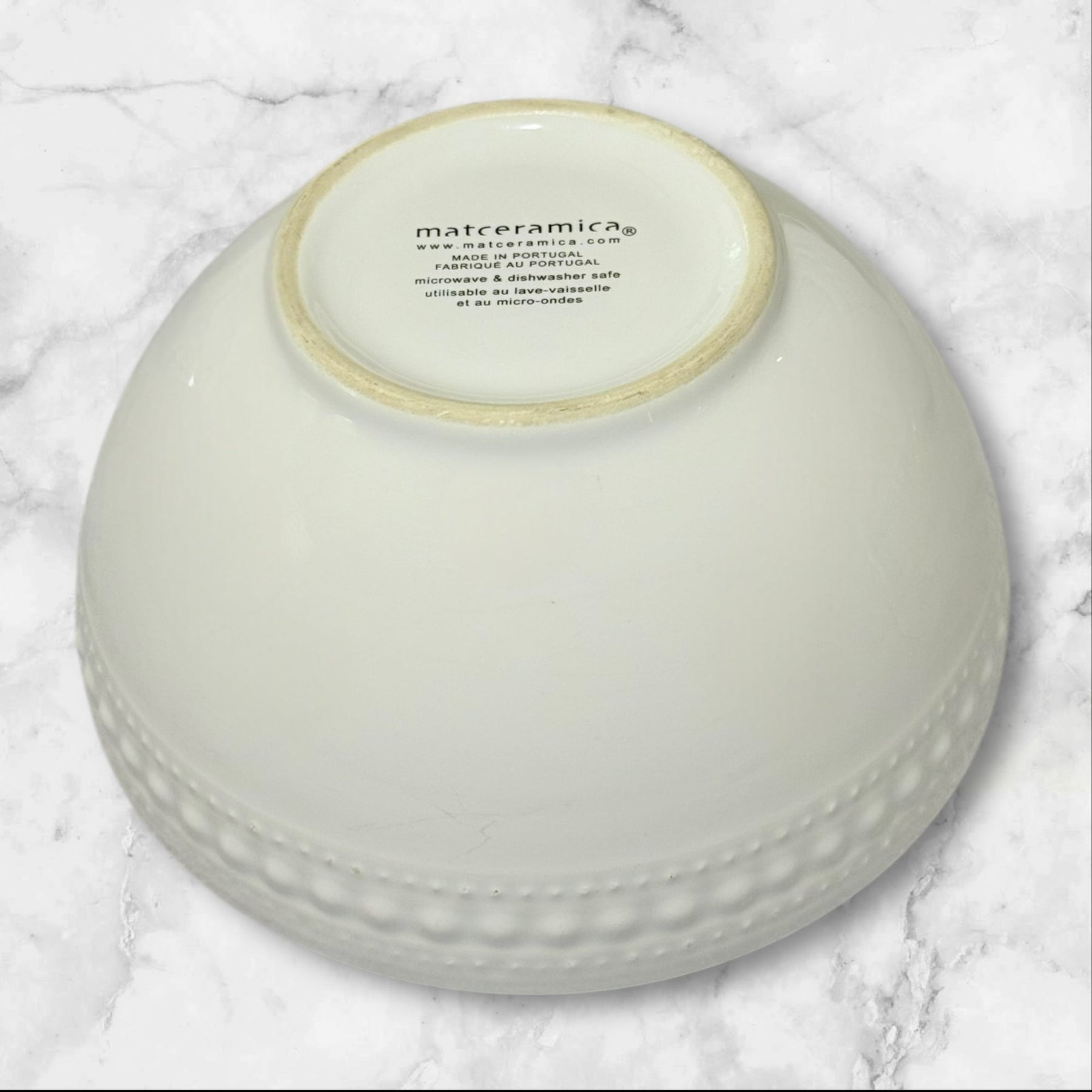 Serve everyday meals in classic style with this set of 4 Matceramica M2A20 White bowls. Crafted in Portugal, these ceramic bowls feature the signature raised-bead border and a clean white glaze. Durable, versatile, and discontinued, they’re ideal for cereal, soup, and pasta. Each bowl shows light utensil marks but remains fully functional—perfect for timeless, high-quality kitchenware at an eco-friendly value.
