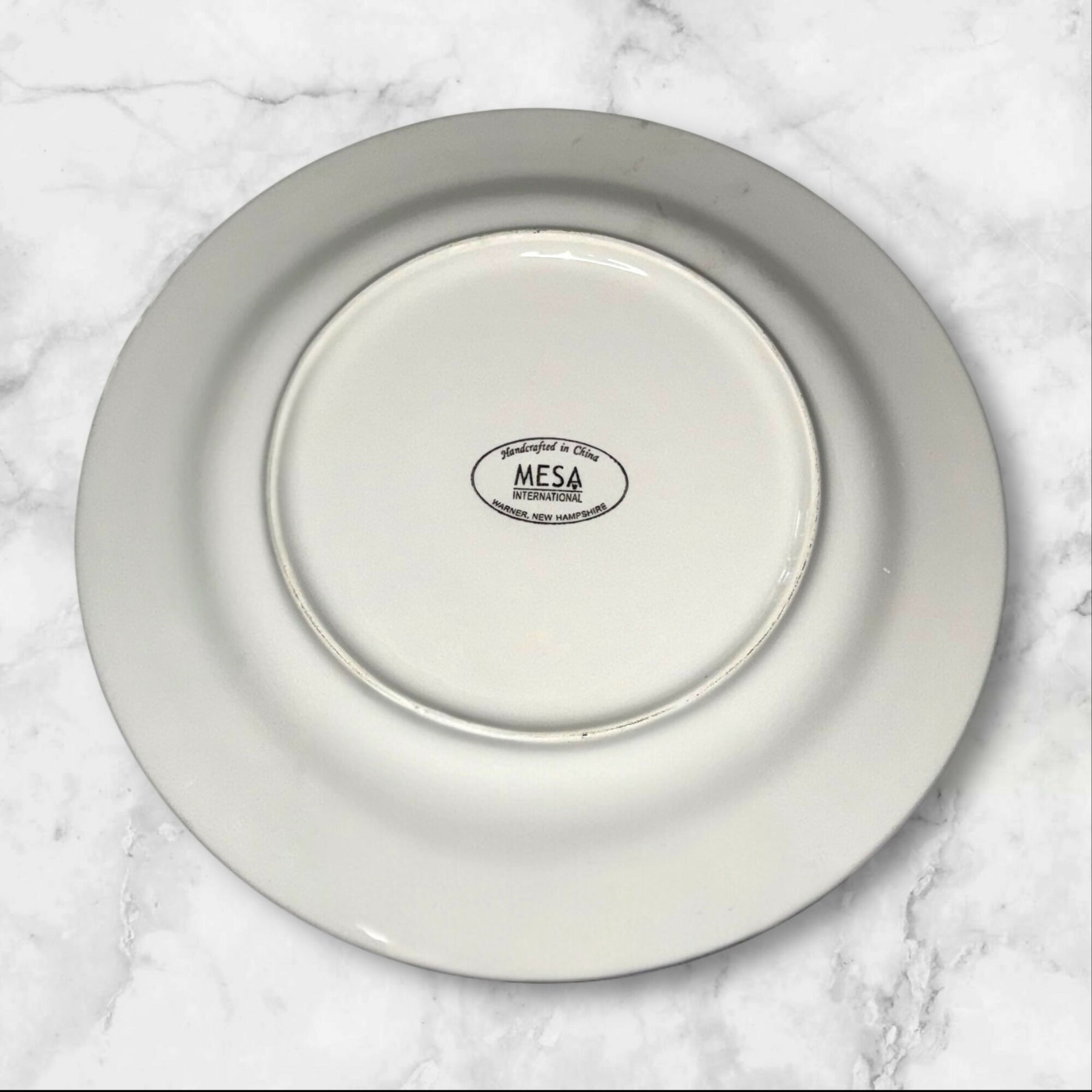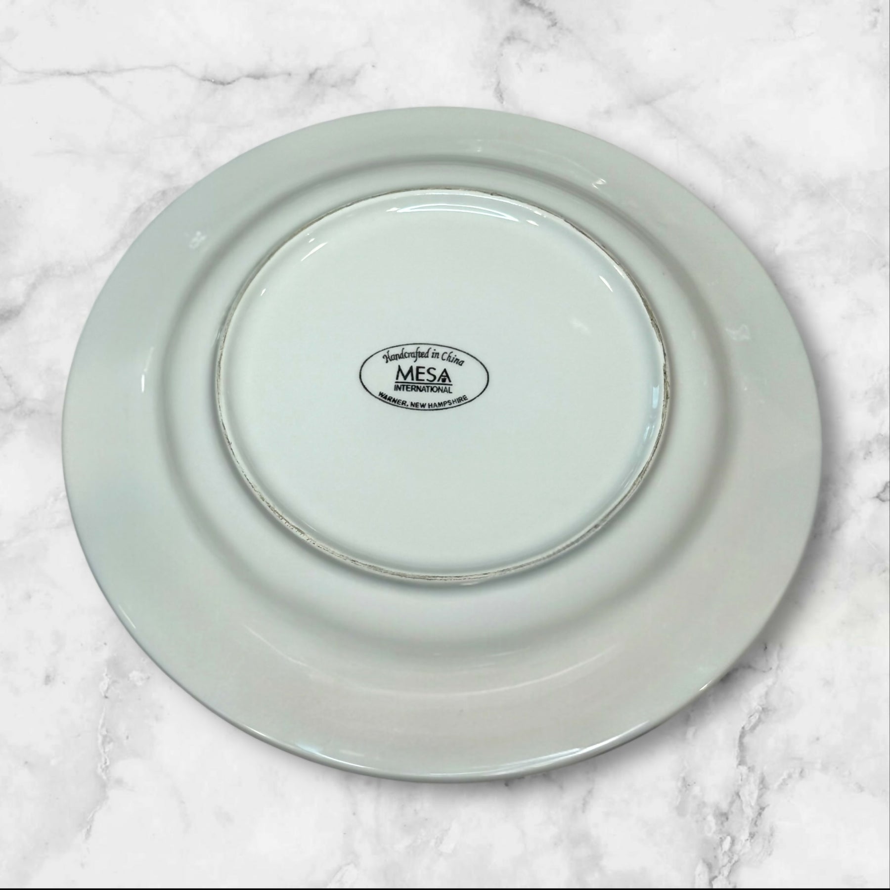 Add timeless elegance to your dining collection with this set of 6 white embossed dinner plates by Mesa International. Made of durable glazed stoneware, each piece features raised scroll detailing for a refined, classic look. These discontinued plates are perfect for everyday use or special occasions. All six are in great condition with only light wear from gentle use.