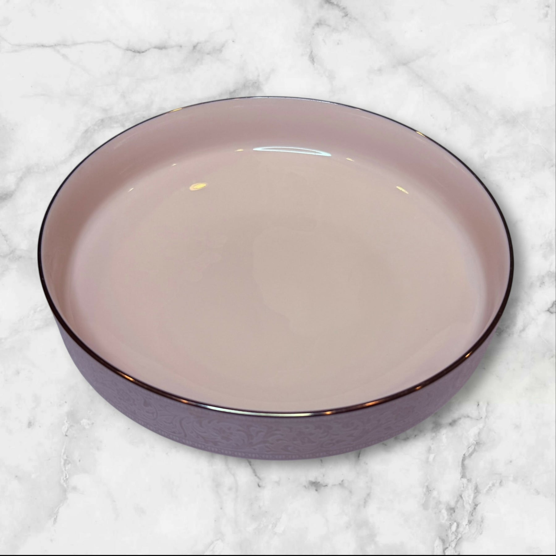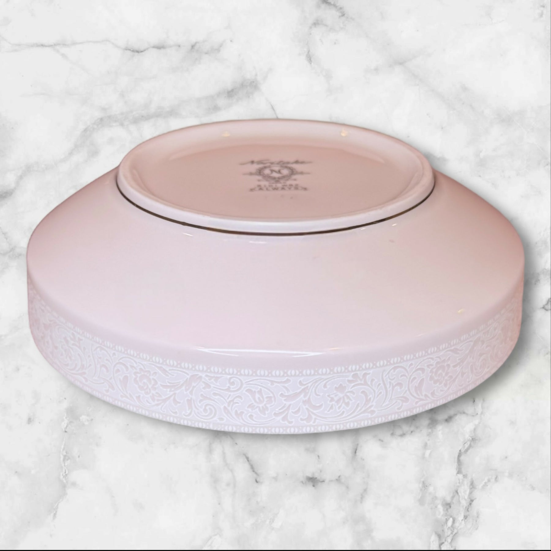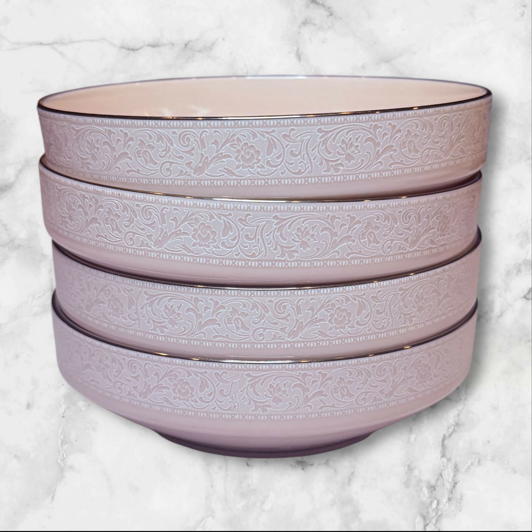 Enjoy breakfast or dessert in vintage style with this set of 4 bowls from Noritake’s Always collection. Crafted from fine porcelain with a blush-pink band and radiant platinum rim, each bowl captures timeless elegance. Discontinued and rare, these pieces make a beautiful addition to any dinnerware collection or gift for the design-minded host.