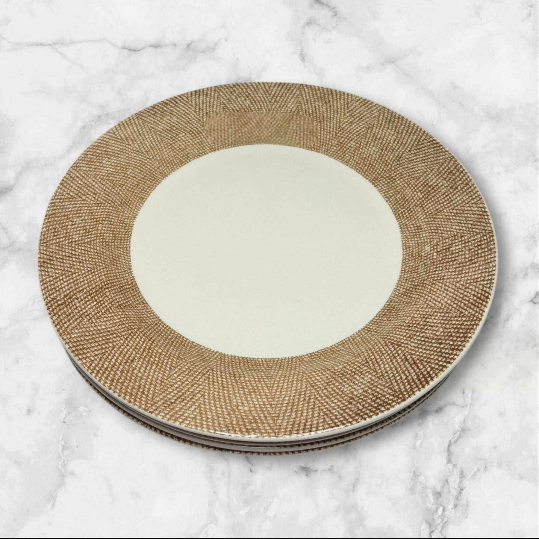 Enhance your dining table with this elegant set of 4 Pier 1 England & Angleterre Textured Bands dinner plates. Featuring a warm tan herringbone rim on crisp white stoneware, these 10.25-inch plates bring timeless sophistication to every meal. Perfect for entertaining or everyday use, this discontinued collection is highly sought after. Each plate is in excellent condition with minimal signs of use.