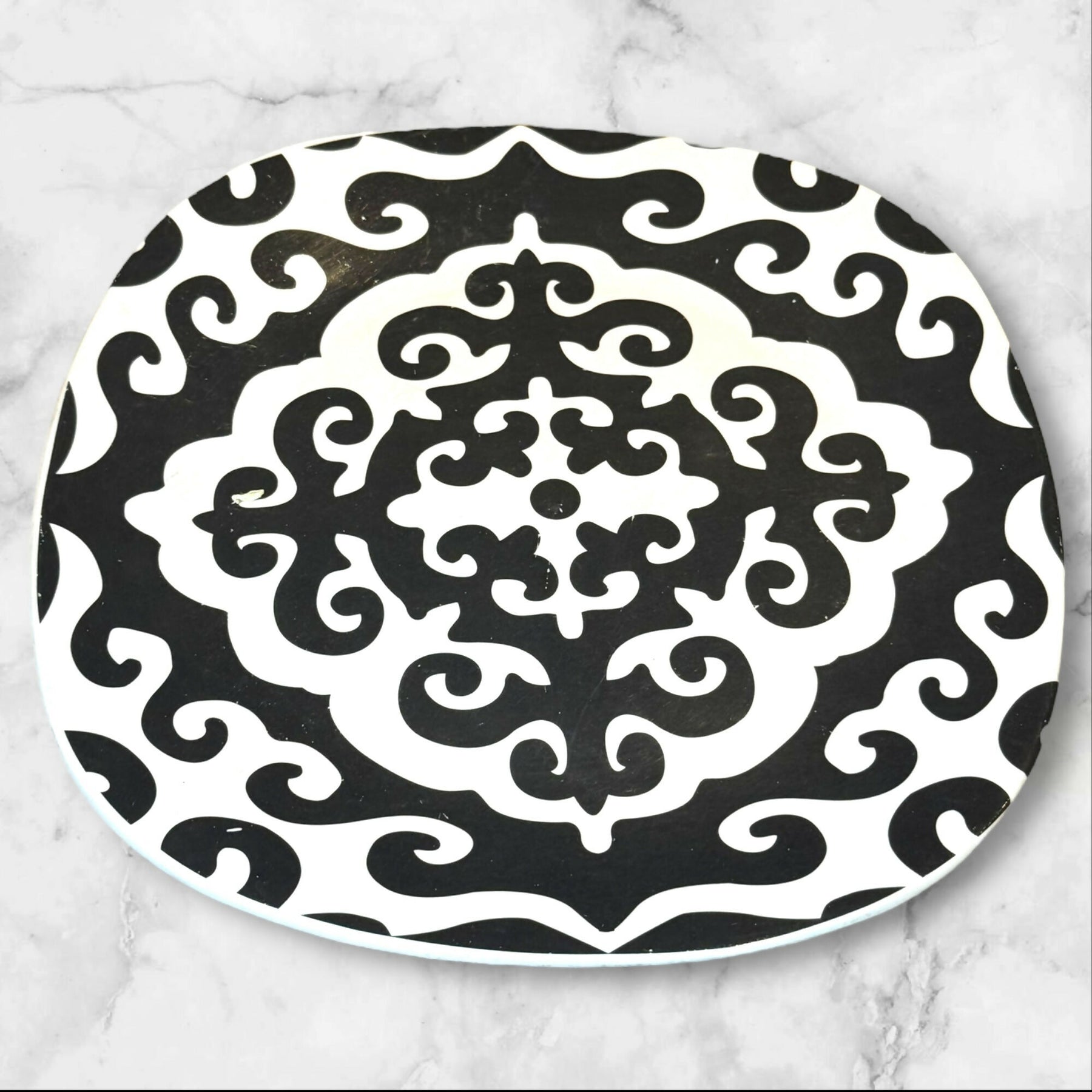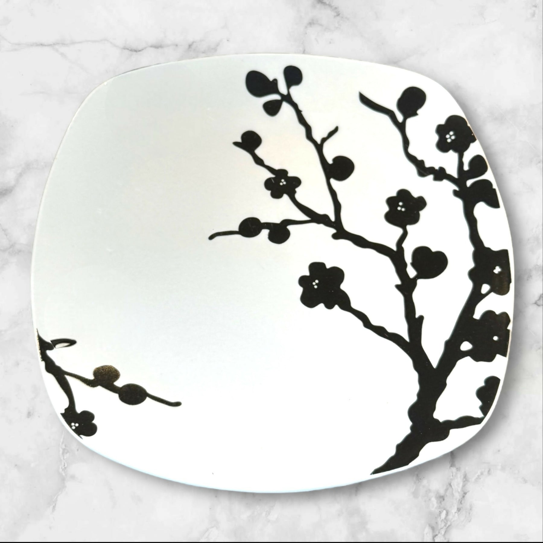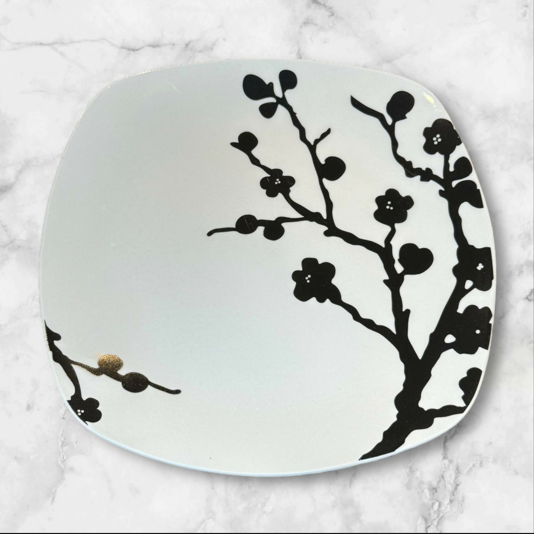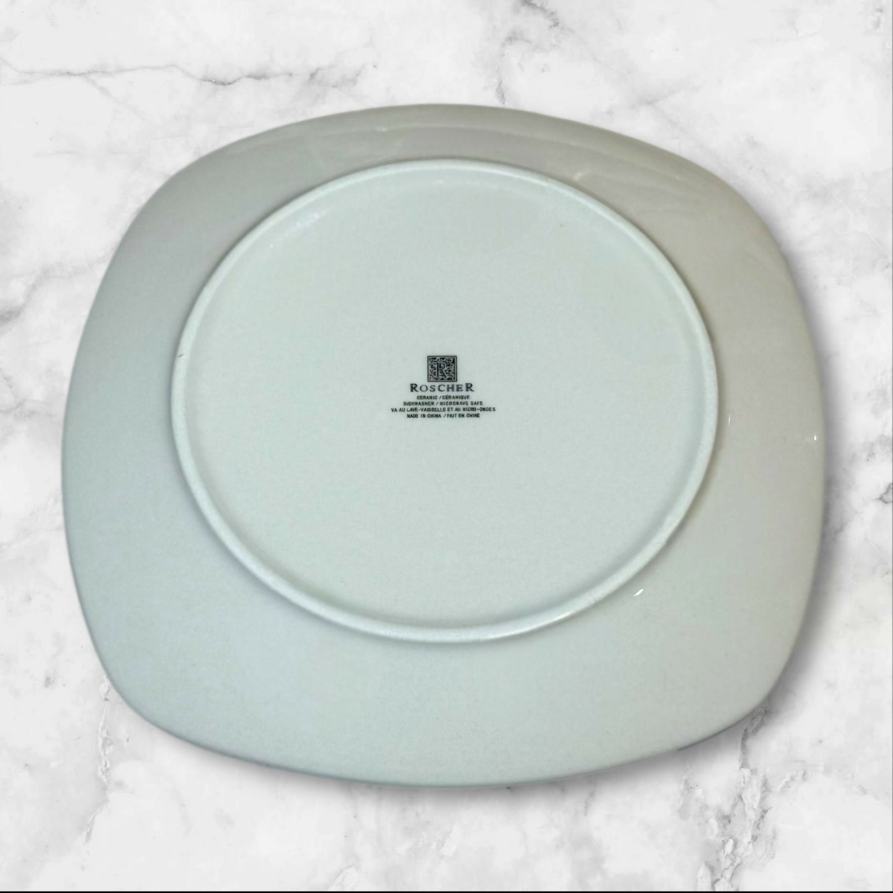 Bring bold elegance to your table with this striking Roscher dinnerware set. Featuring contrasting black-and-white floral and scroll patterns, these stoneware plates blend modern artistry with everyday durability. Ideal for casual meals or stylish entertaining, each piece offers charm and sophistication with gently used character and minimal utensil wear. Perfect for mixing, matching, or gifting to design-conscious hosts.