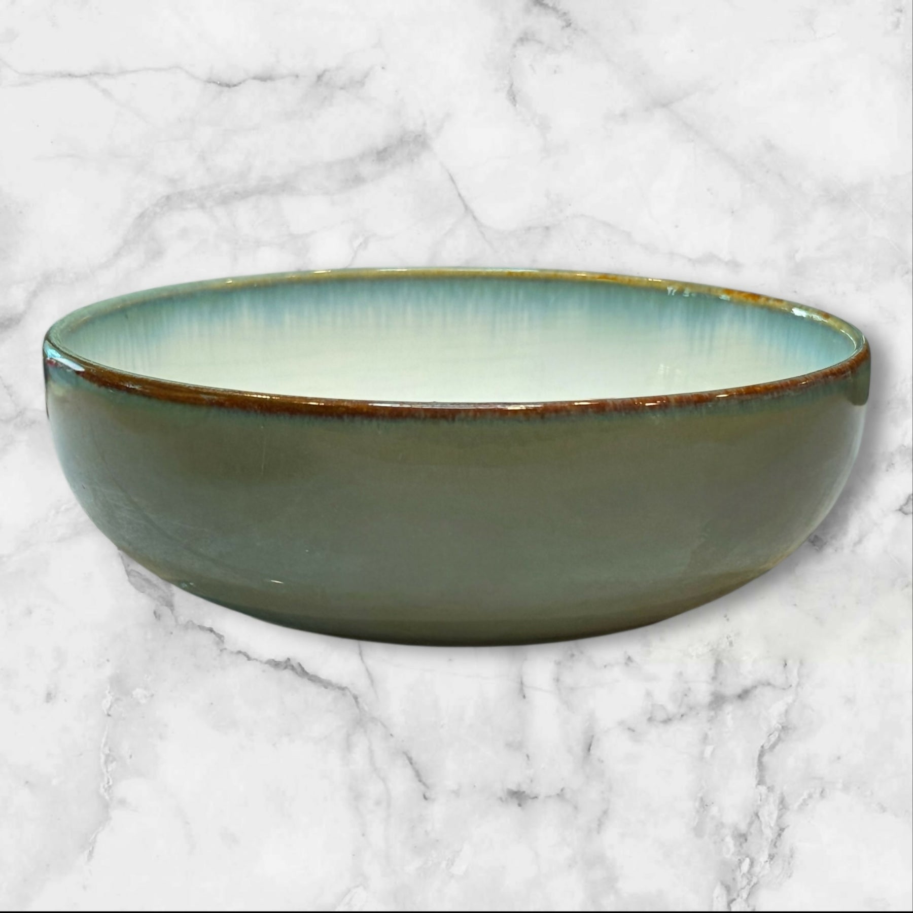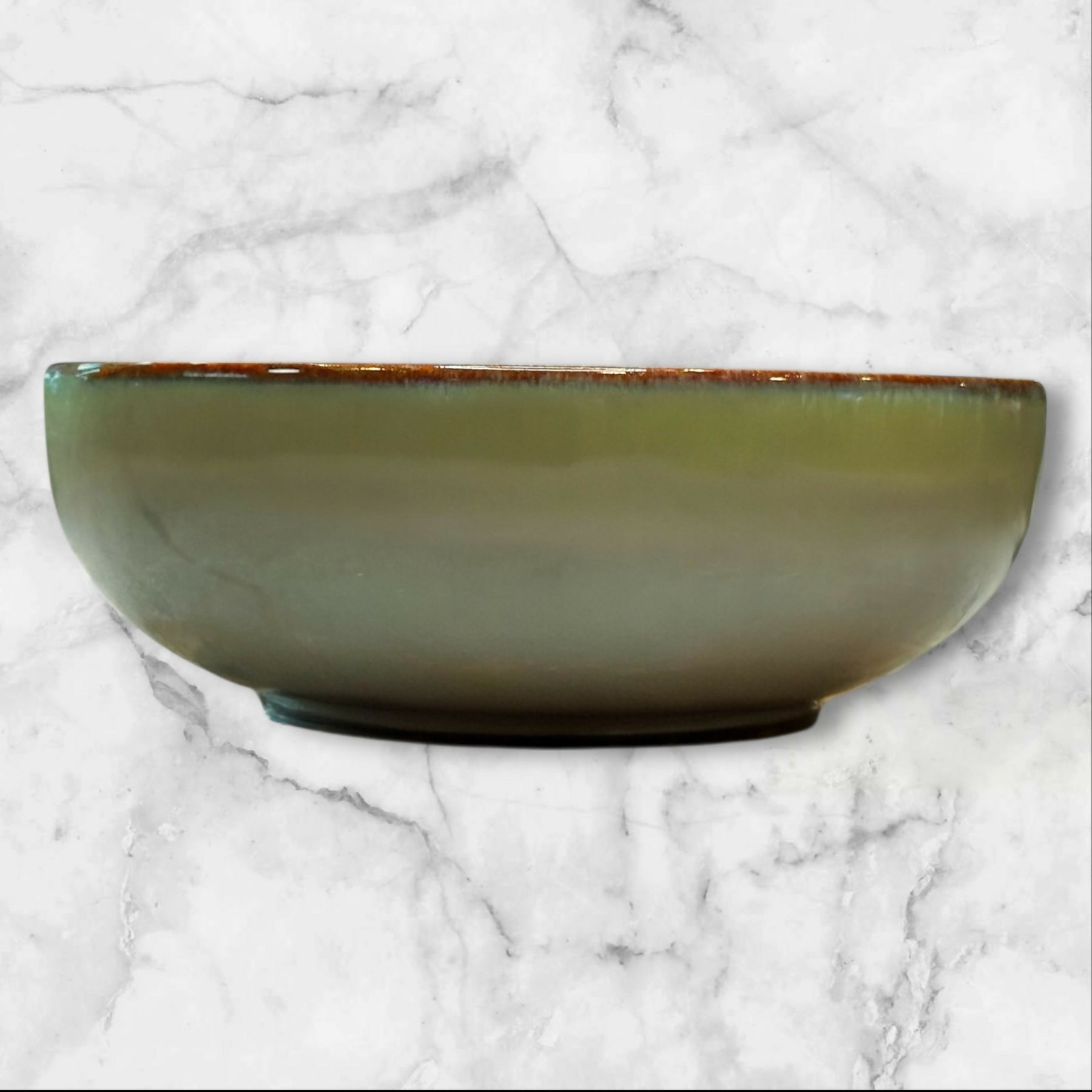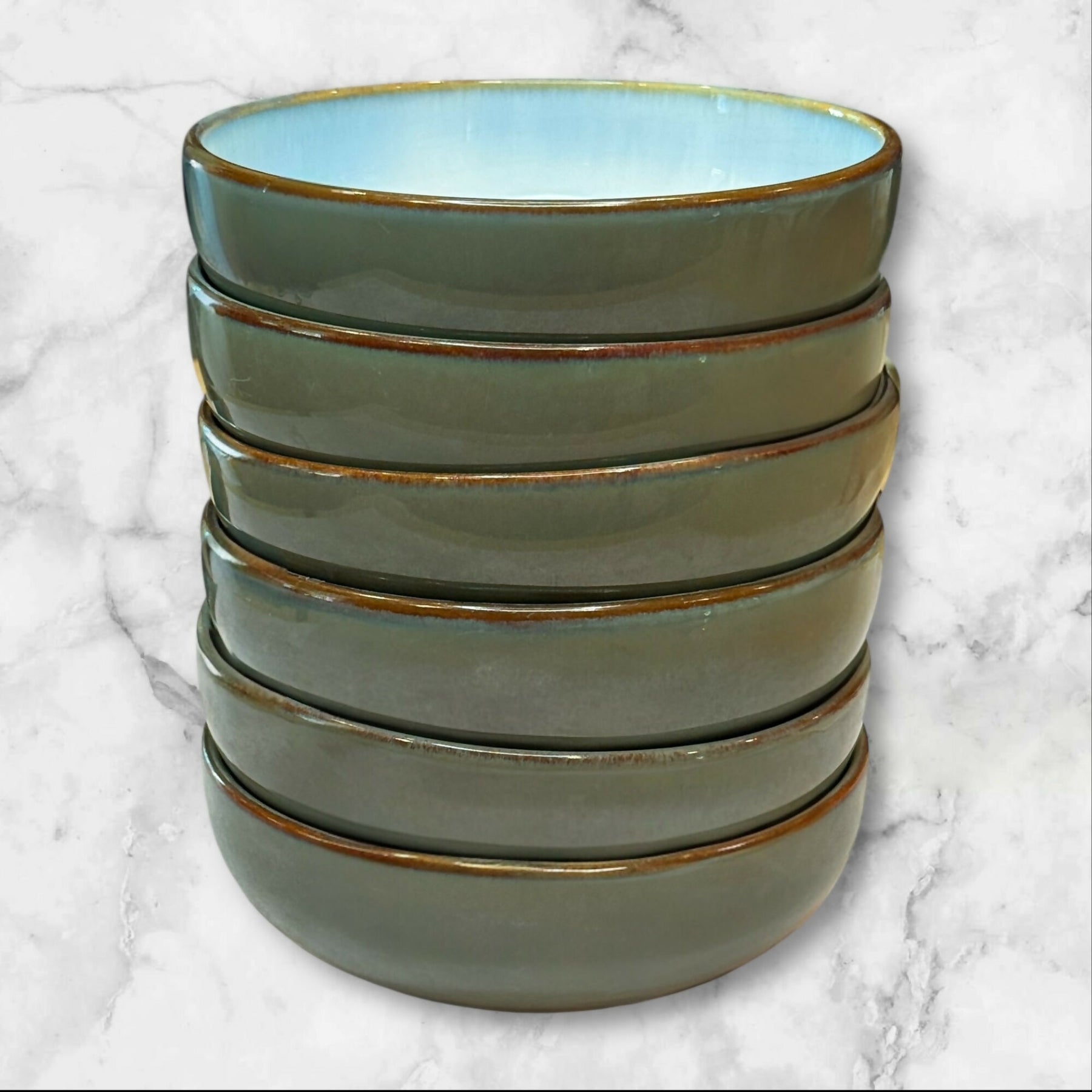 Bring modern, earthy style to your table with this set of 6 Sango Concepts Avocado soup/cereal bowls. The soft green ombre glaze and rounded profile make them perfect for soups, pastas, salads, and everyday serving. This discontinued collection is highly sought after. All bowls show visible crazing; one bowl has a bottom chip and another has a crack, but the set remains functional and display-worthy.